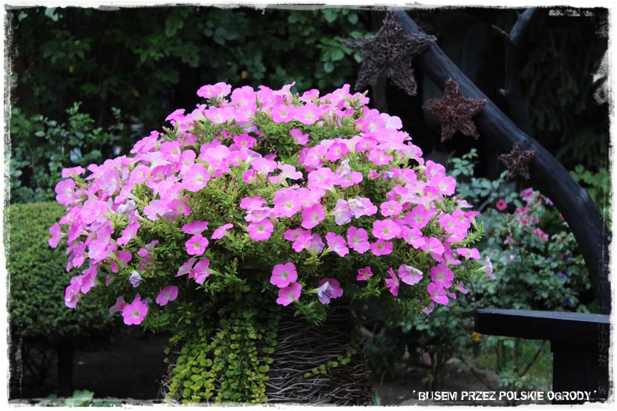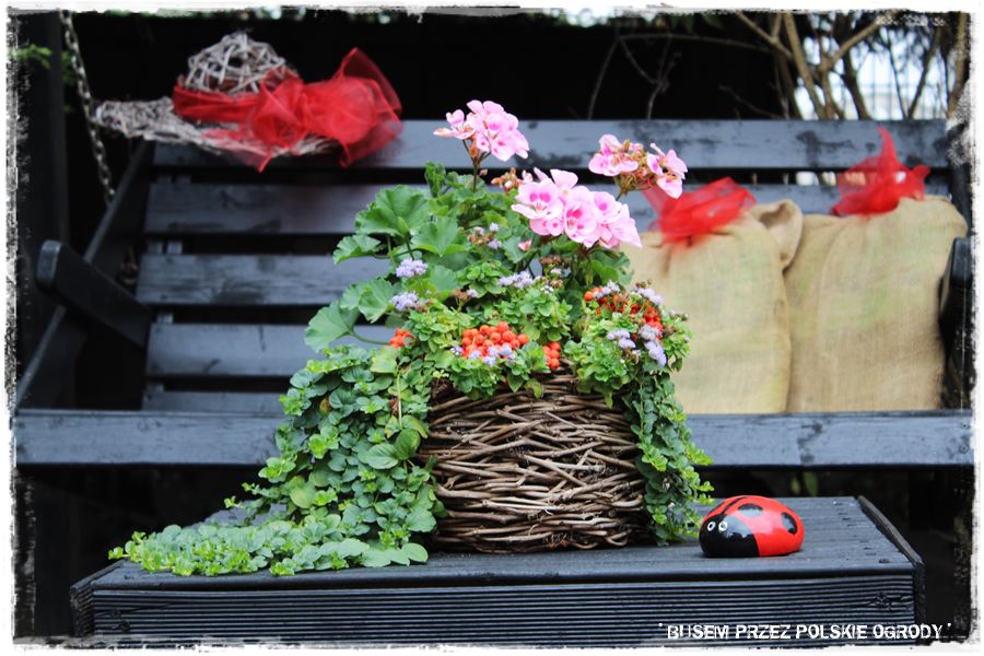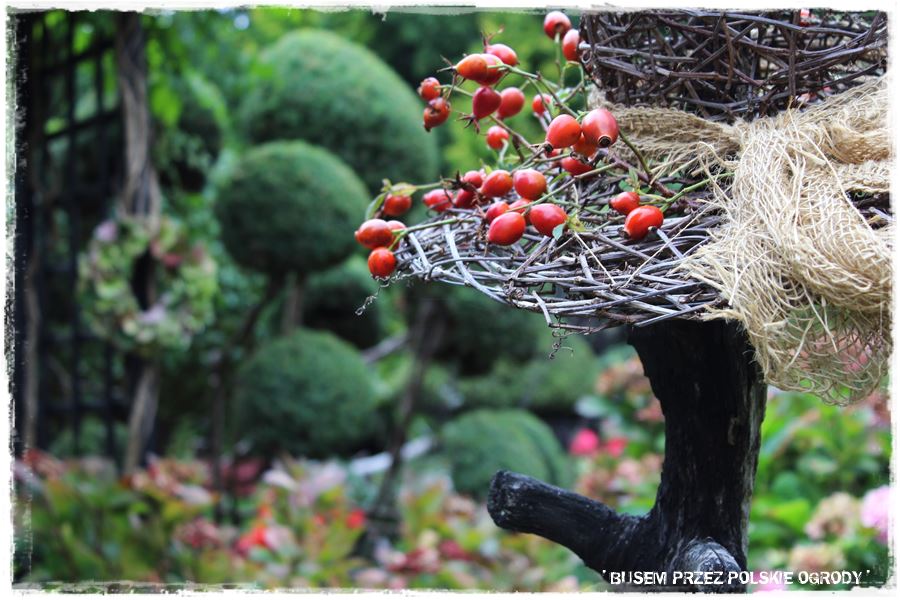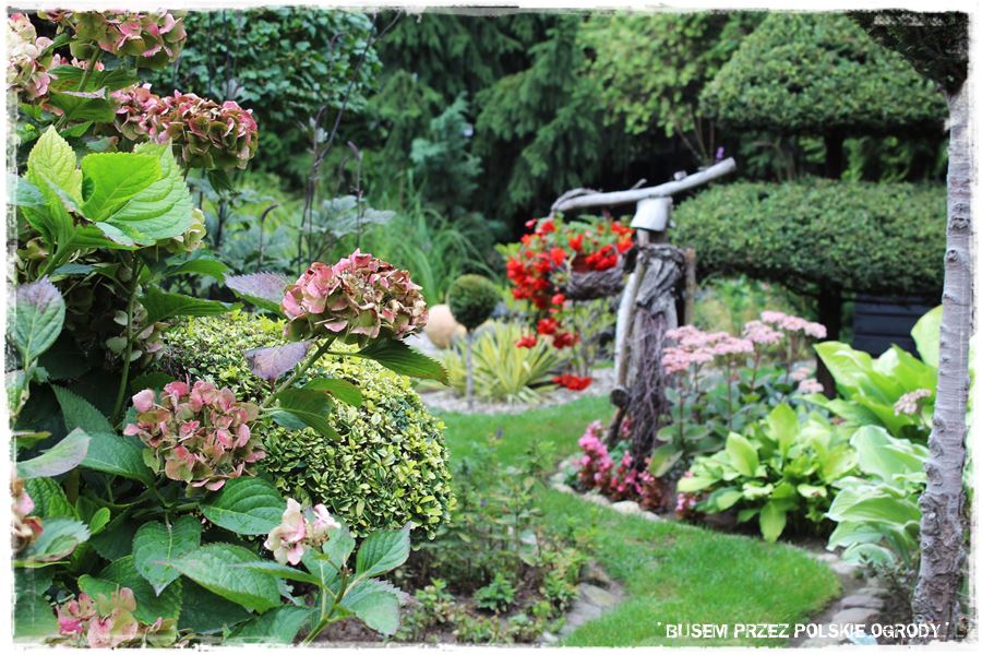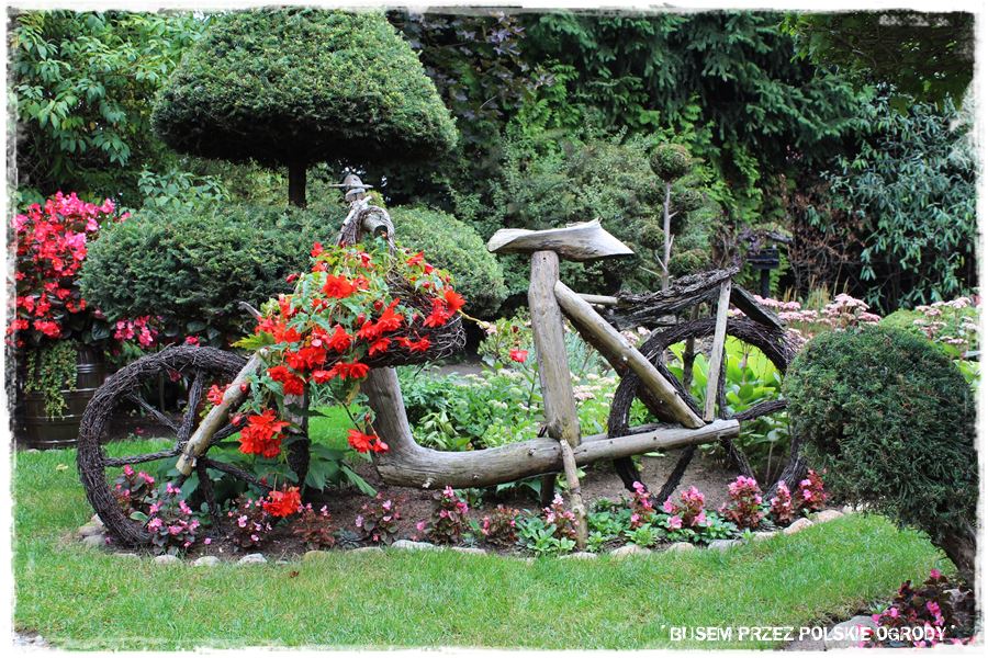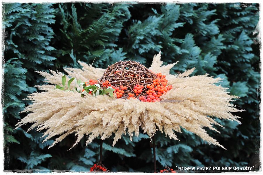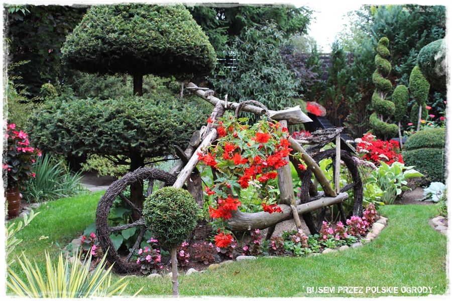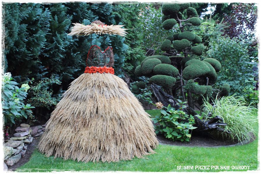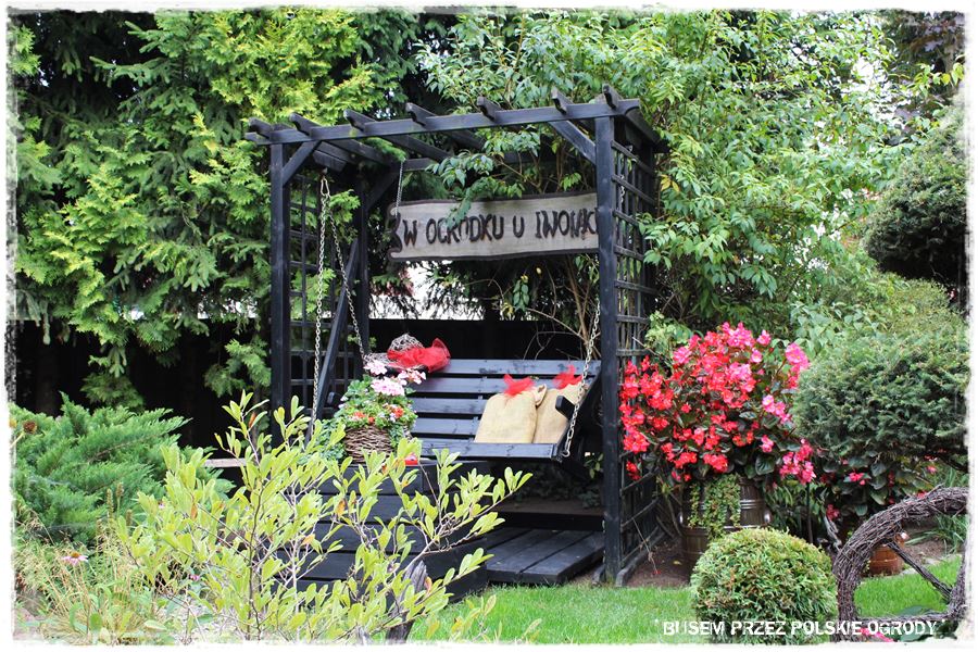 Jak pewnie już wiesz z poprzednich relacji, każdy z odwiedzonych ogrodów staram się na wstępie jakoś nazwać i zatytułować. Tak, aby na początku nastawić Cię na to, czego możesz się po nim spodziewać. Innymi słowy, staram się znaleźć jakąś główną cechę i wyróżnik danego miejsca, który zdecydowanie odróżnia go od pozostałych. I tak jest również w tym przypadku. Pierwszym skojarzeniem, które przychodzi na myśl po wejściu do tego ogrodu jest „królestwo“, a jego Właścicielka to „Królowa dekoracji“. Dekoracje, własnoręcznie przez Nią robione, są dosłownie na każdym kroku. Mniejsze, większe, które łączy jedno: wykonane są niezwykłą pracowitością i pomysłowością, z naturalnych materiałów.