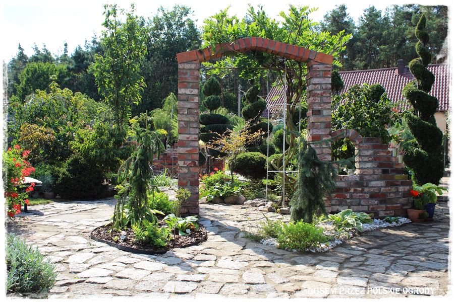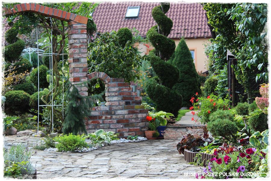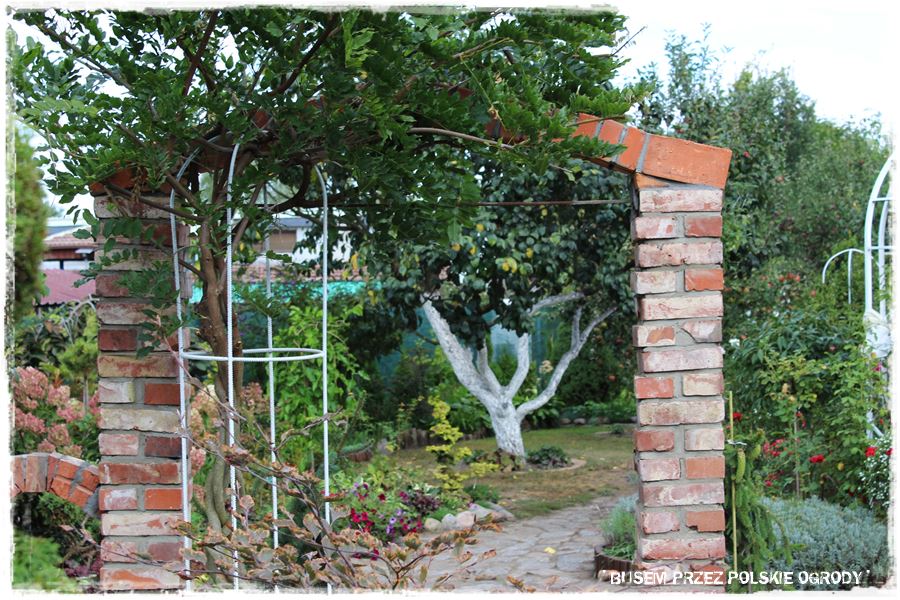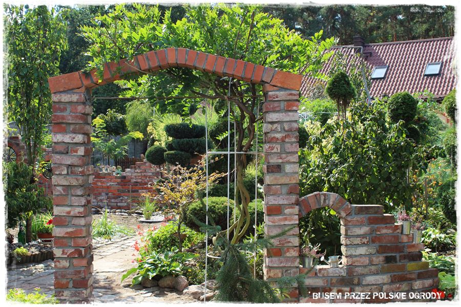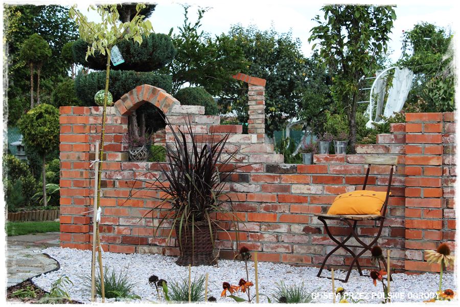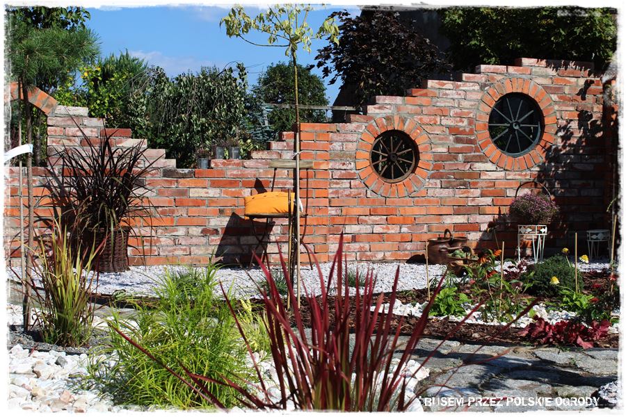 Jak pewnie już wiesz z poprzednich relacji, każdy z odwiedzonych ogrodów staram się na wstępie jakoś nazwać i zatytułować. Tak, aby na początku nastawić Cię na to, czego możesz się po nim spodziewać. Innymi słowy, staram się znaleźć jakąś główną cechę i wyróżnik danego miejsca, który zdecydowanie odróżnia go od pozostałych. I tak jest również w tym przypadku. Pierwszym słowem, które przyszło mi na myśl będąc w tym ogrodzie to „ceglany“. Dlatego, że centralnym jego elementem, zlokalizowanym na środku ogrodu, a zatem widocznym praktycznie z każdego miejsca, są ceglane budowle. Oryginalna brama i mury ze starej cegły rozbiórkowej, które w tym miejscu wyglądają jak pozostałości jakiś starych zabudowań.