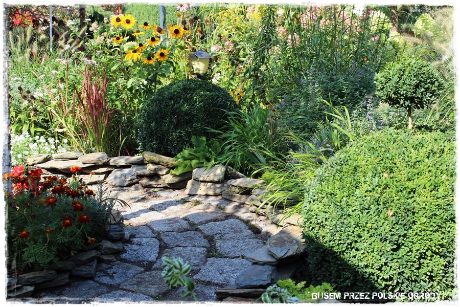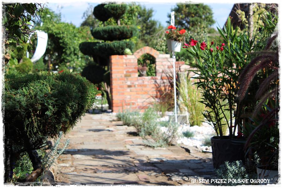 Idealnym uzupełnieniem ceglanych murów są kamienne ścieżki, które dosłownie wiją się po różnych częściach ogrodu. Jednocześnie umożliwiają spacerowanie pomiędzy rabatami i podziwianie tego, co Gospodarze tam zgromadzili. Zarówno w kwestii samych roślin, jak i wszechobecnych dekoracji.