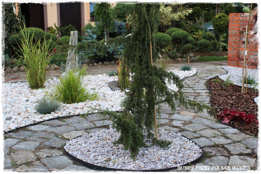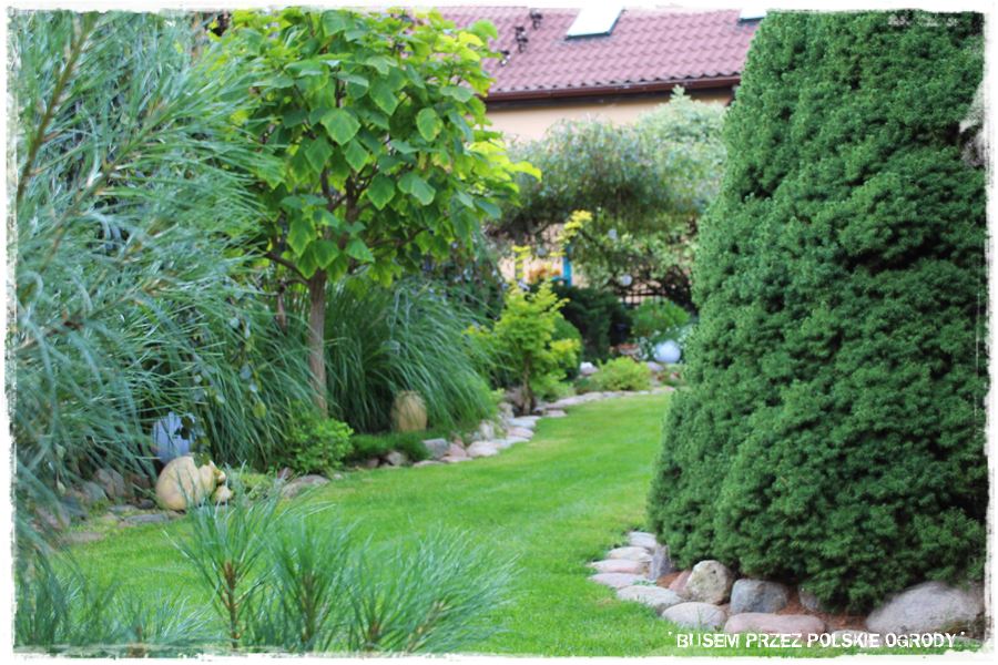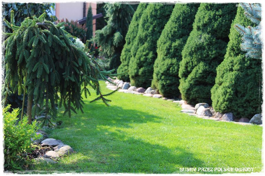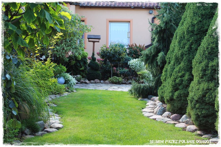 Bardzo oryginalnym elementem, który udało mi się wypatrzeć są obrzeża rabat, zrobione z dużych, nieregularnych, polnych kamieni. Materiał tani, praktycznie darmowy, a jak się okazuje bardzo efektowny i dobrze kontrastujący z zielenią trawnika.