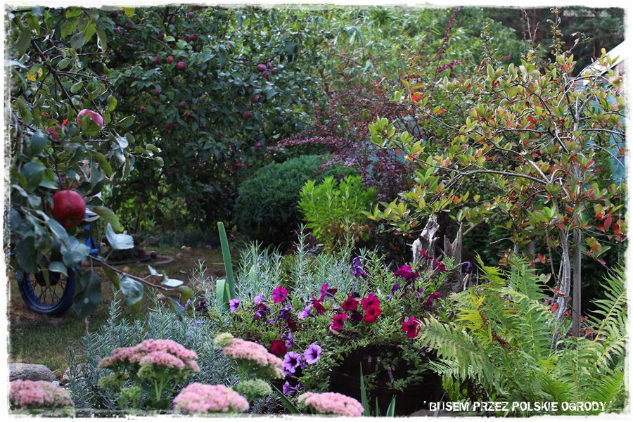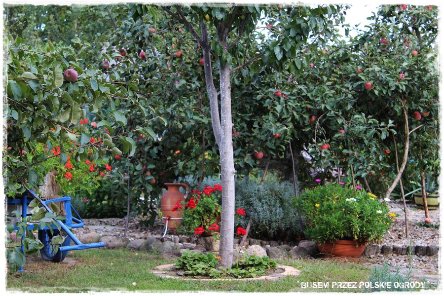 Tylną część ogrodu zajmuje sad, który jednak jest dość nietypowy. Głównie dlatego, że nie są to tylko rosnące swobodnie drzewa owocowe, ale również przeplatające je liczne rabaty i różnego rodzaju dekoracje. Przyznam, że to bardzo ciekawe rozwiązanie, nieczęsto spotykane w ogrodach.
