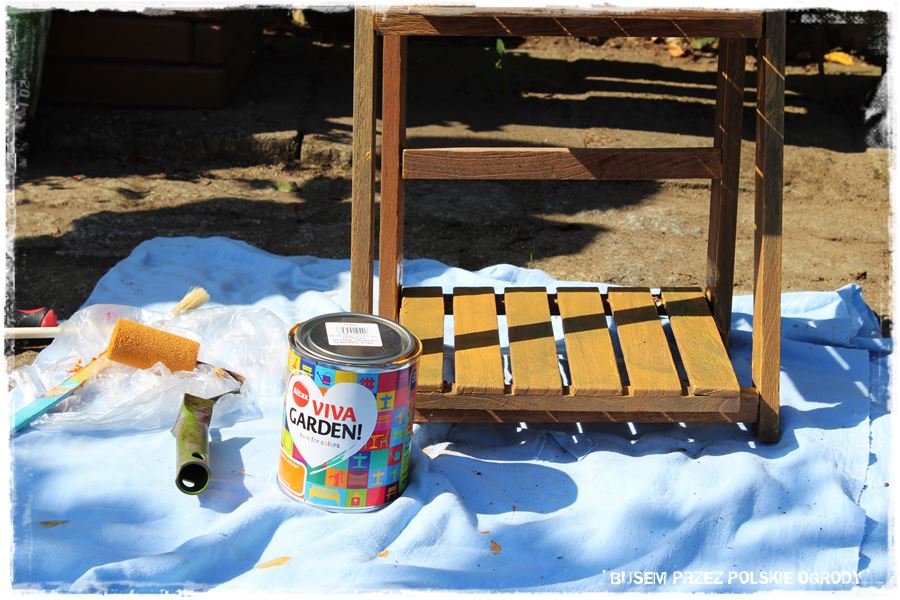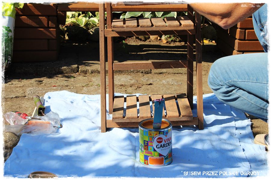 Poza pracami typowo ogrodniczymi, tradycyjnie postanowiliśmy poeksperymentować z farbami. Tym razem wybraliśmy do tego kolor o nazwie „liliowiec rdzawy”, który powędrował na drewniany kwietnik. Podczas mojej wizyty tylko rozpoczęliśmy, a kolejne warstwy Zdzisława naniosła już po moim wyjeździe. Jestem przekonany, że efekt był zadziwiający.