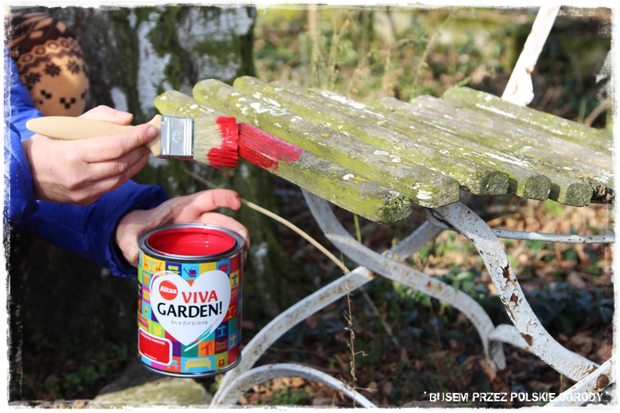 Plan był taki aby wszystko zrobić na świeżym powietrzu, tym bardziej, że słoneczna pogoda dopisywała. Na początek poszło więc malowanie. Najpierw starego krzesła będącego dekoracją jednej z rabat, na ładny czerwony kolor. Wydaje mi się, że kolor ten jest na tyle efektowny, że warto wprowadzić go do ogrodu, szczególnie teraz, kiedy jeszcze kolory roślin nie dały o sobie znać. A zatem na początek malowanie krzesła na czerwono, bo dlaczego nie?