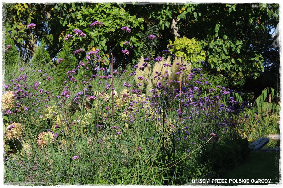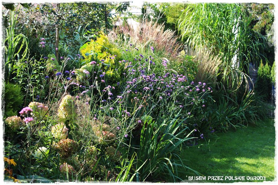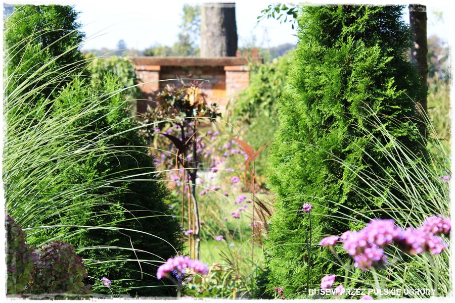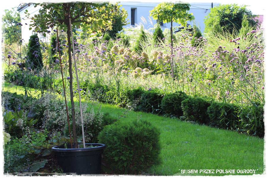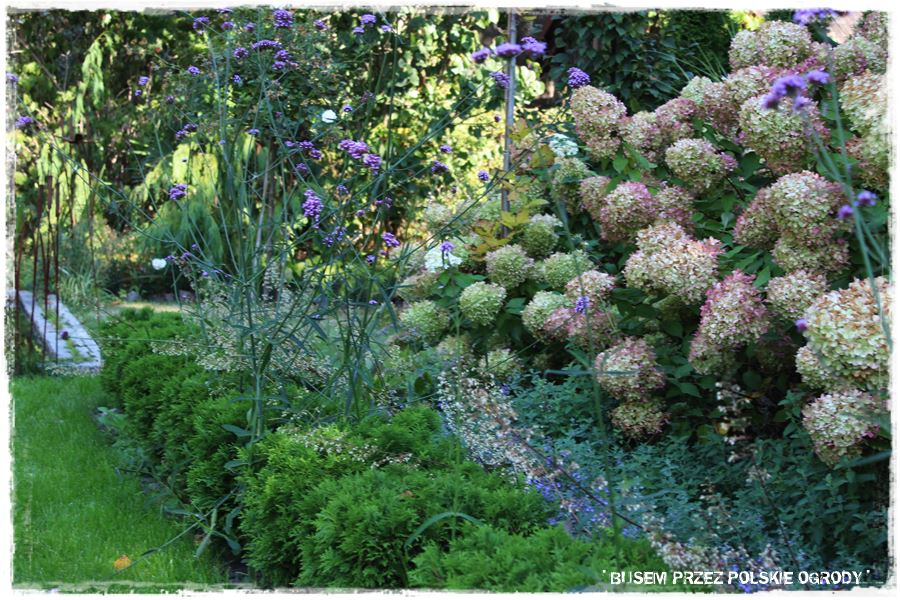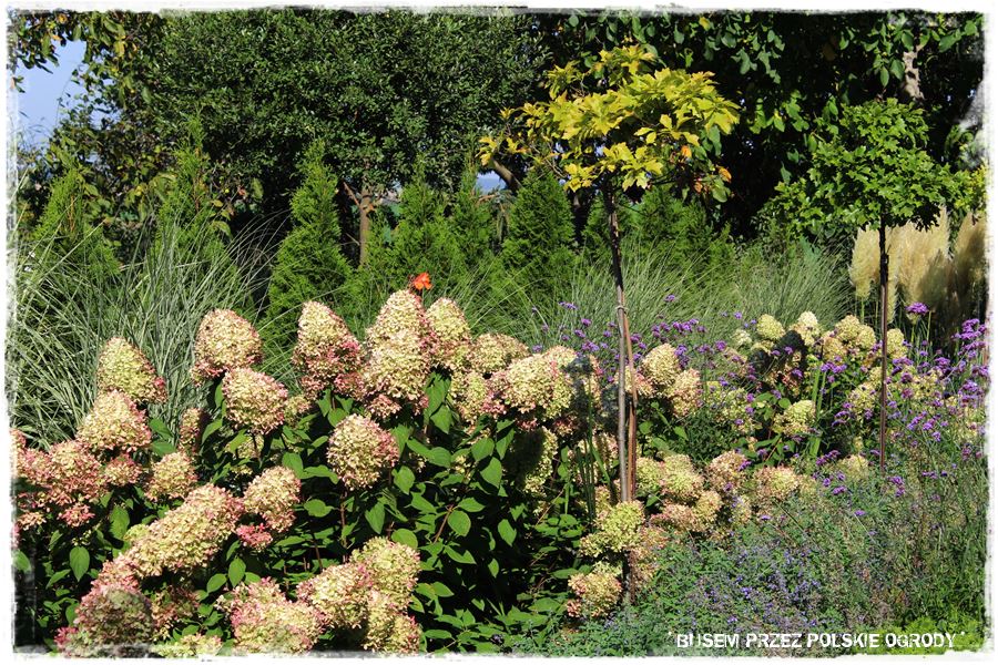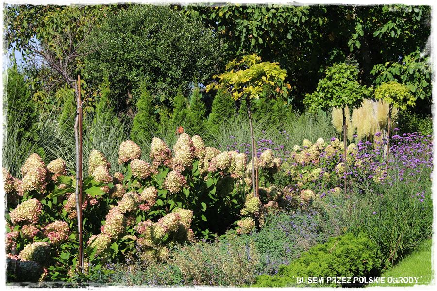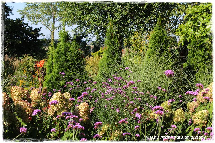 Jednak na szczególną uwagę zasługują pięknie skomponowane boki tej alei, które tworzą piętrowo schodzące rośliny – od tyłu żywotnik smaragd tworzący tło, potem trawy, hortensje i przed nimi ponownie żywotnik, w kulistej odmianie danica. A to wszystko przeplatane jest jeszcze luźno rosnącą i uzupełniającą kolorystycznie werbeną patagońską.