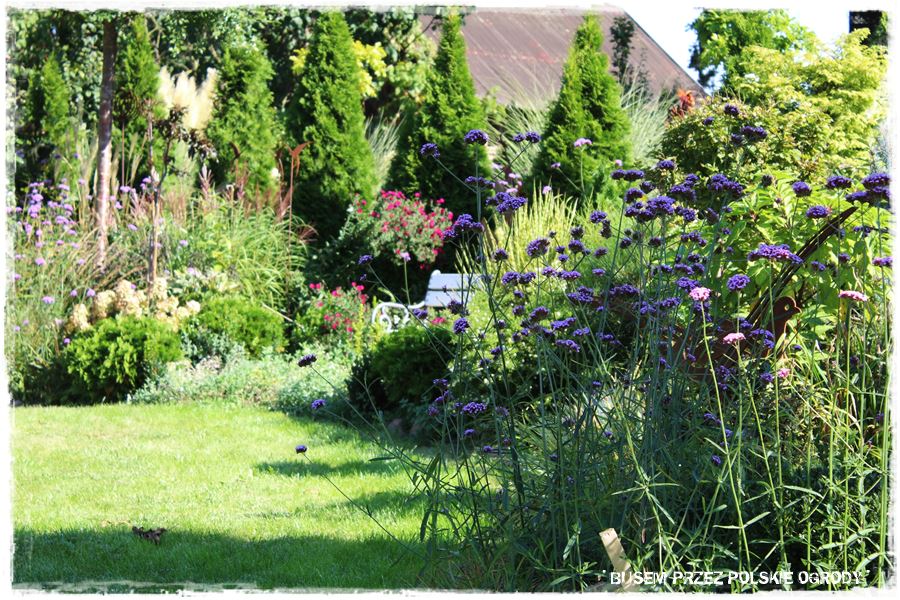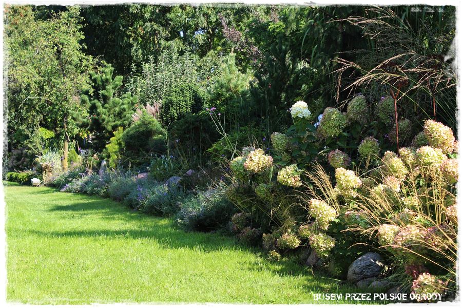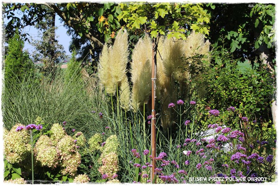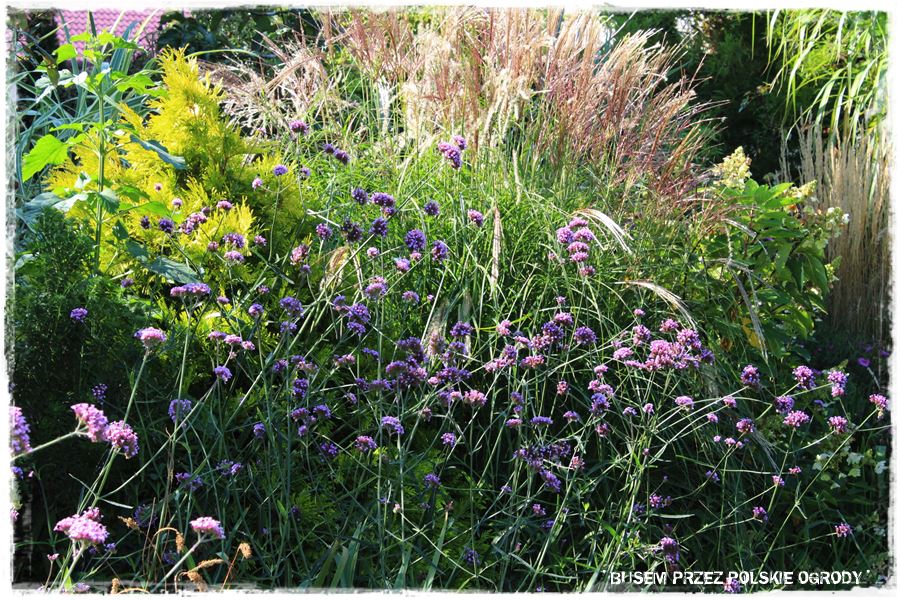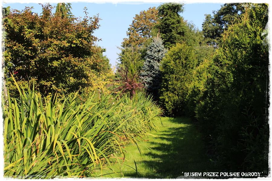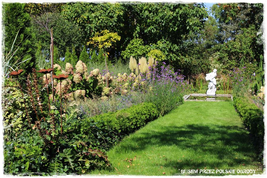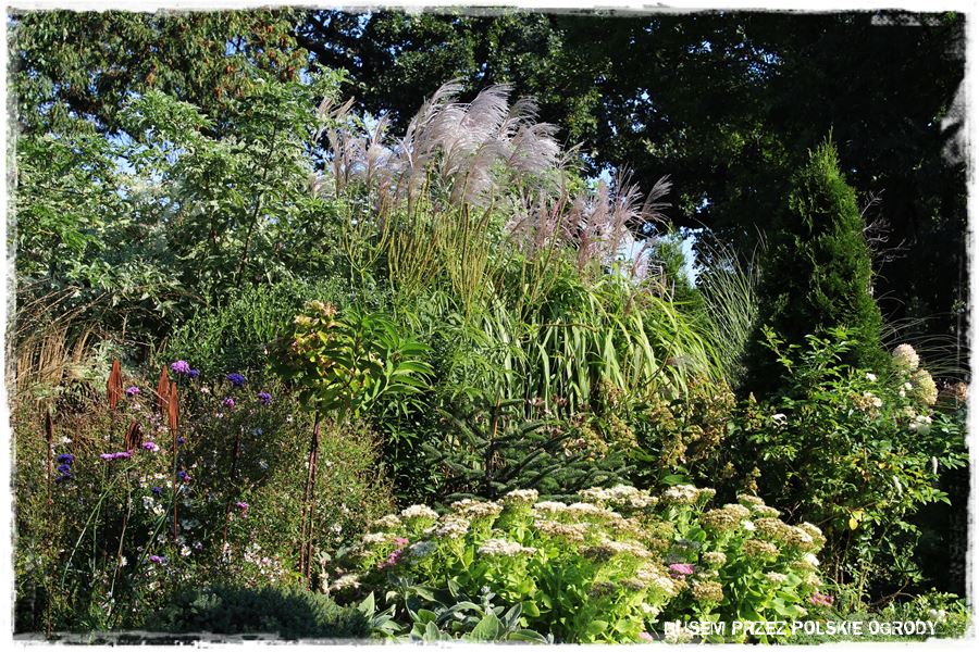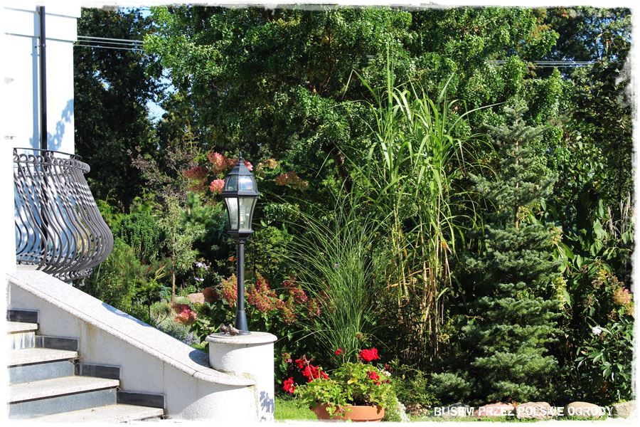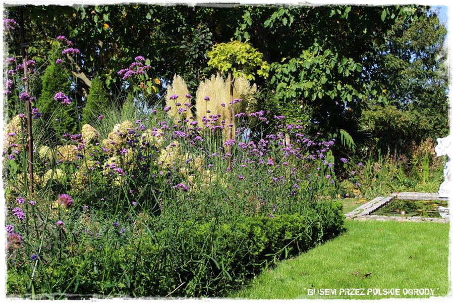 Jednak na szczególną uwagę zasługują pięknie skomponowane boki tej alei, które tworzą piętrowo schodzące rośliny – od tyłu żywotnik smaragd tworzący tło, potem trawy, hortensje i przed nimi ponownie żywotnik, w kulistej odmianie danica. A to wszystko przeplatane jest jeszcze luźno rosnącą i uzupełniającą kolorystycznie werbeną patagońską.