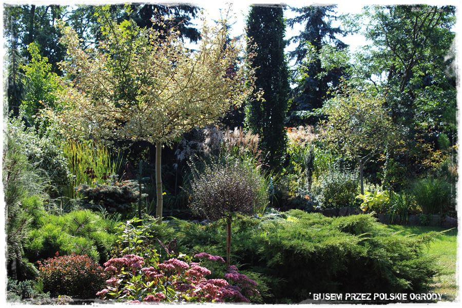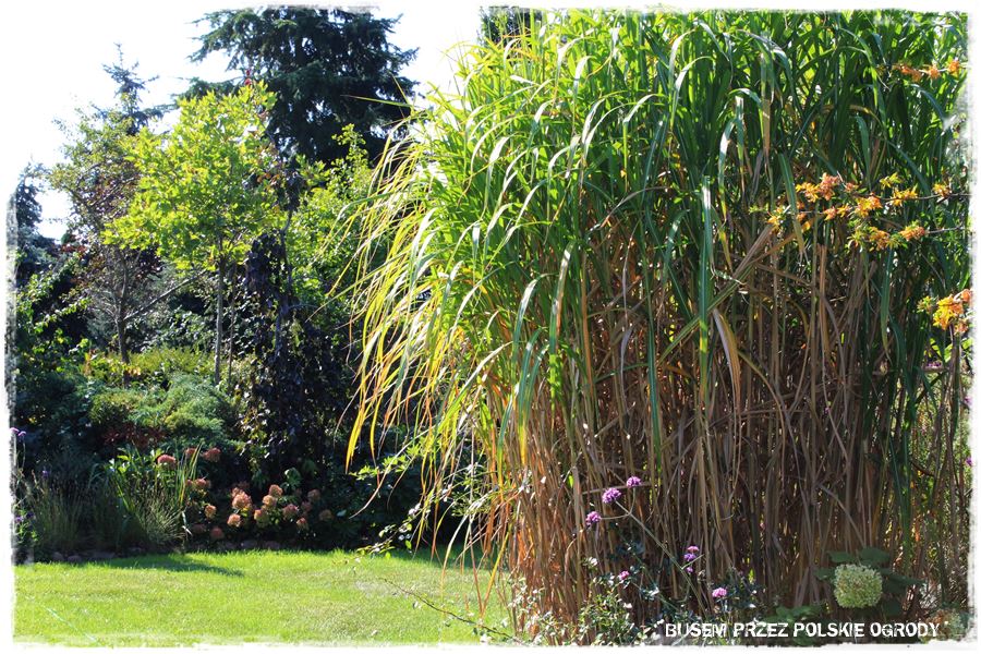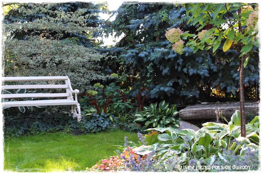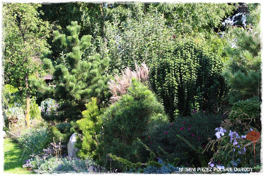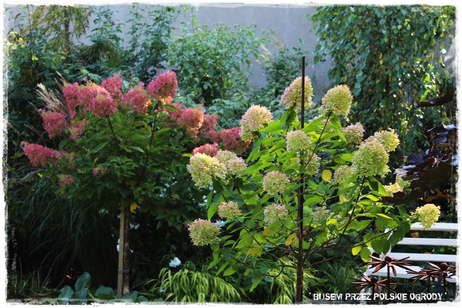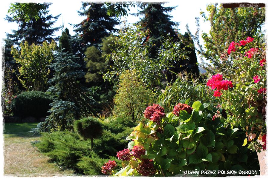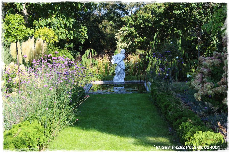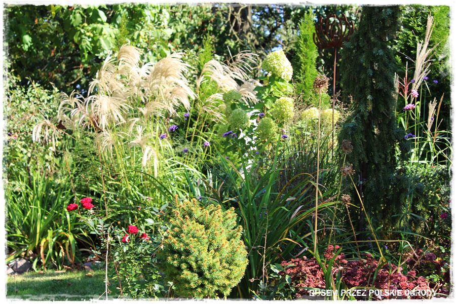 Jednak na szczególną uwagę zasługują pięknie skomponowane boki tej alei, które tworzą piętrowo schodzące rośliny – od tyłu żywotnik smaragd tworzący tło, potem trawy, hortensje i przed nimi ponownie żywotnik, w kulistej odmianie danica. A to wszystko przeplatane jest jeszcze luźno rosnącą i uzupełniającą kolorystycznie werbeną patagońską.