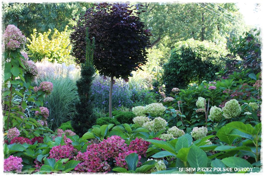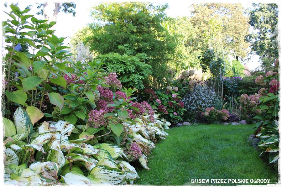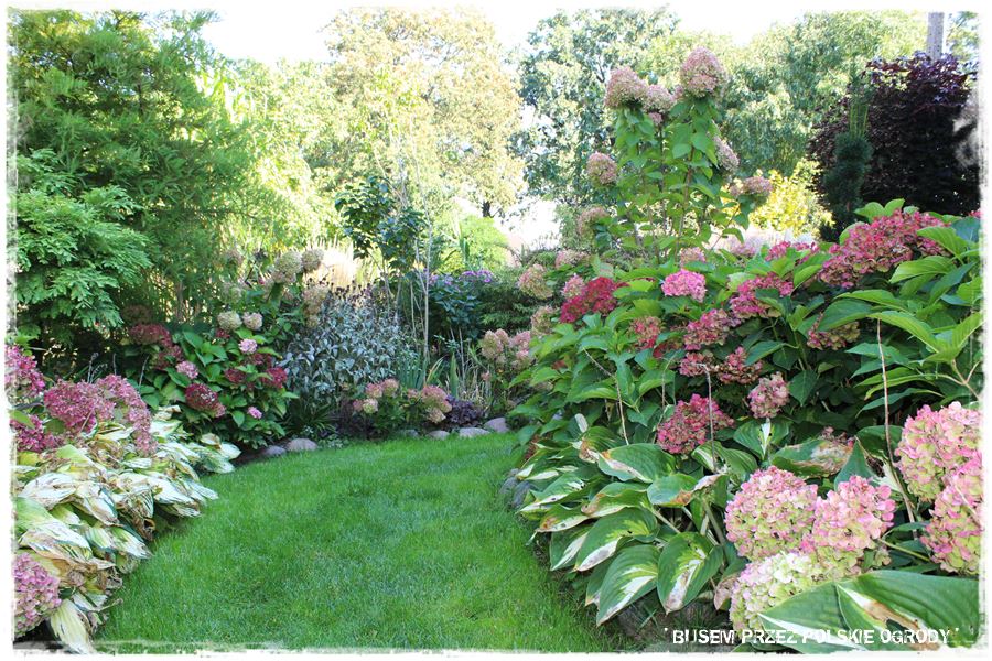 Jednak szczególnie dobrze prezentuje się jeden z odrębnych zakątków, właśnie hortensjowy, gdzie nasadzenia wyższych hortensji pięknie komponują się z niskimi funkiami.