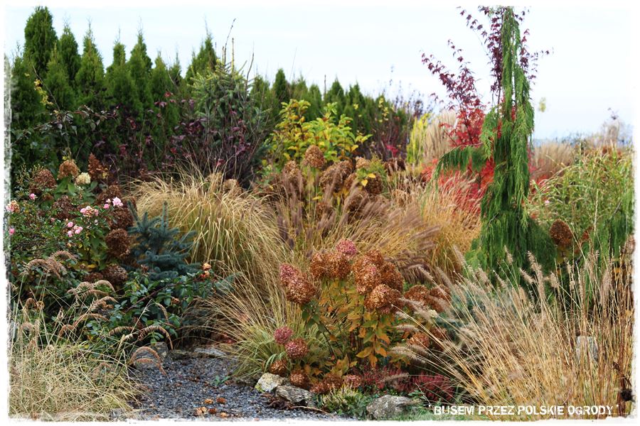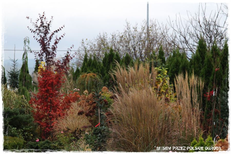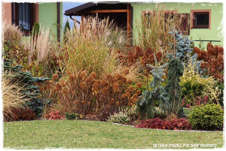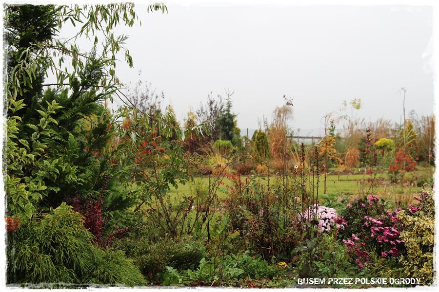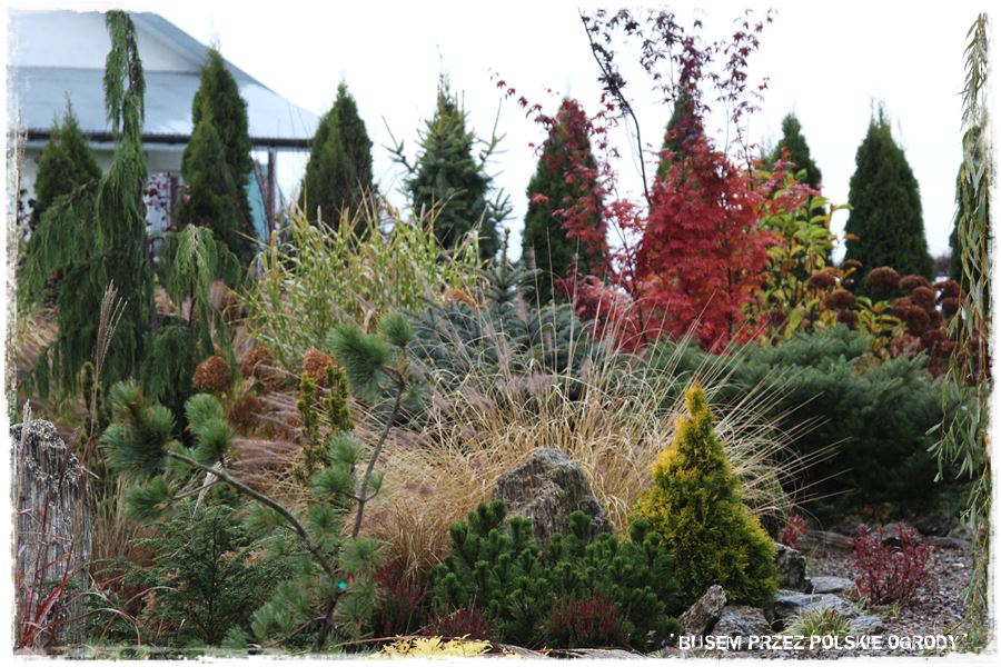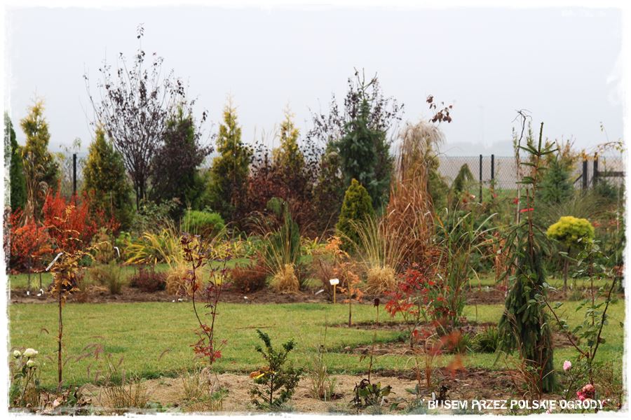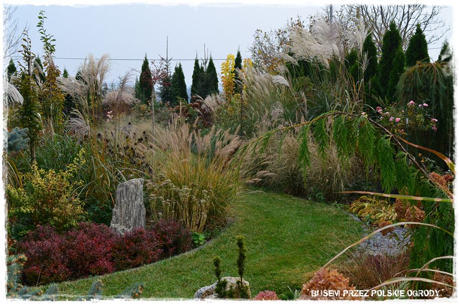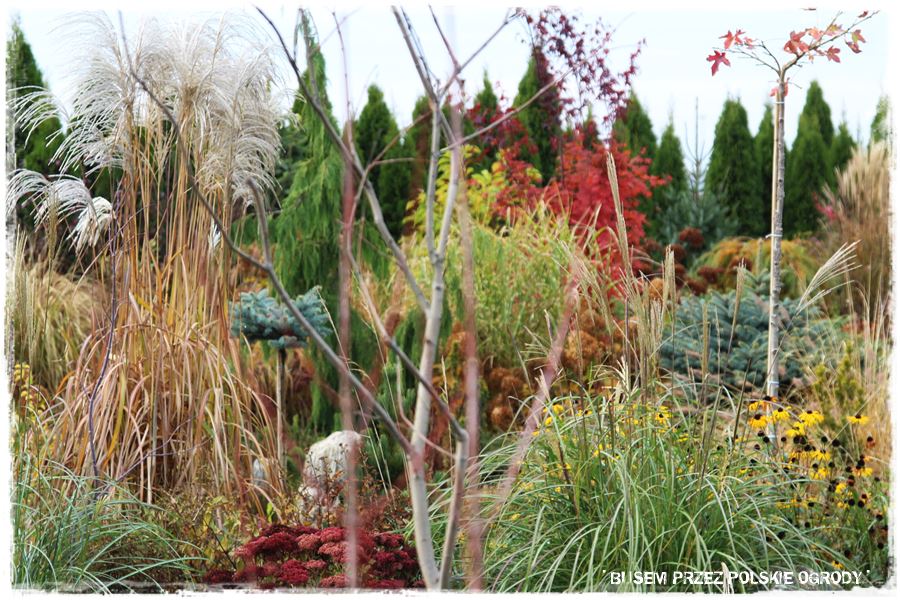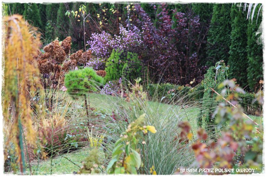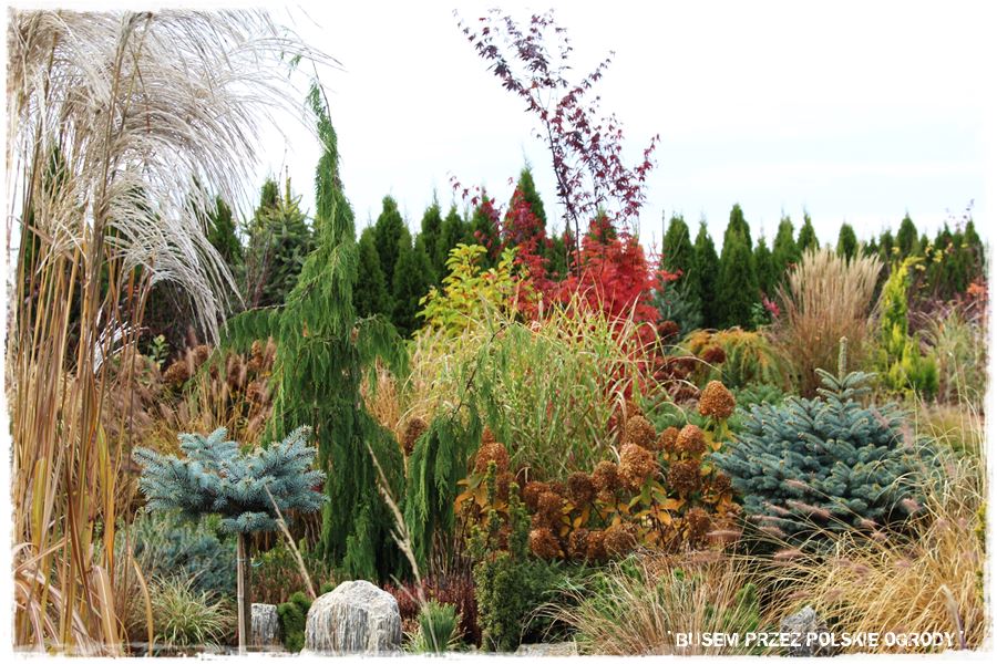 - a drugim sukcesem, a właściwie już kolejnym w tym ogrodzie, jest niezwykły dobór roślin pod względem kolorystycznym. I chyba jesienią widoczne jest to najbardziej, gdzie wiele przekwitających odmian zmienia się w odcienie brązu, a przebarwiające się liście idealnie kontrastują z zieleniami i żółciami roślin iglastych.