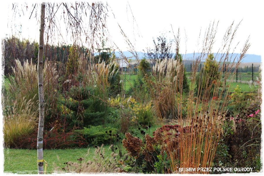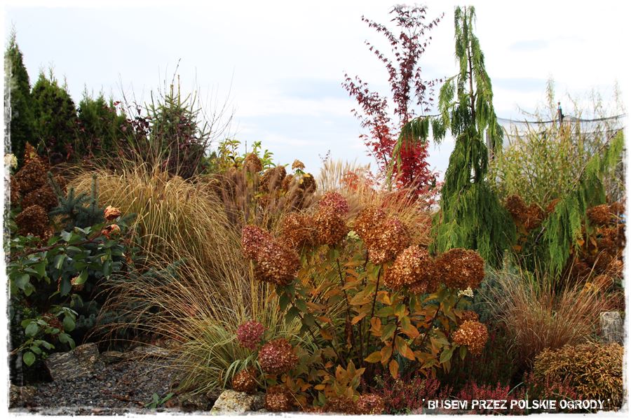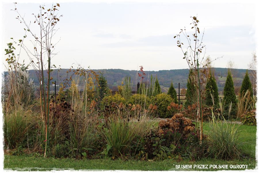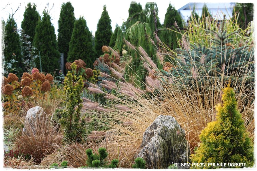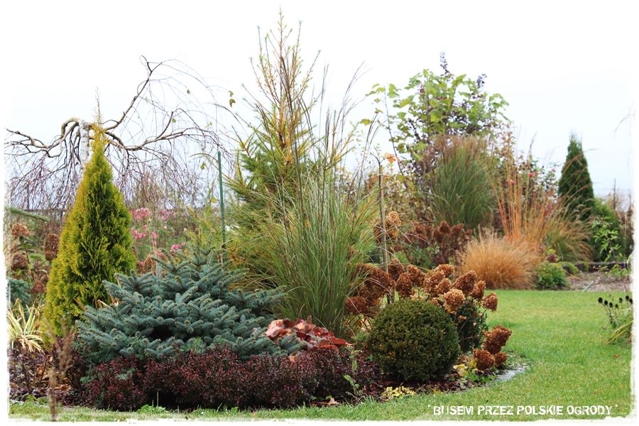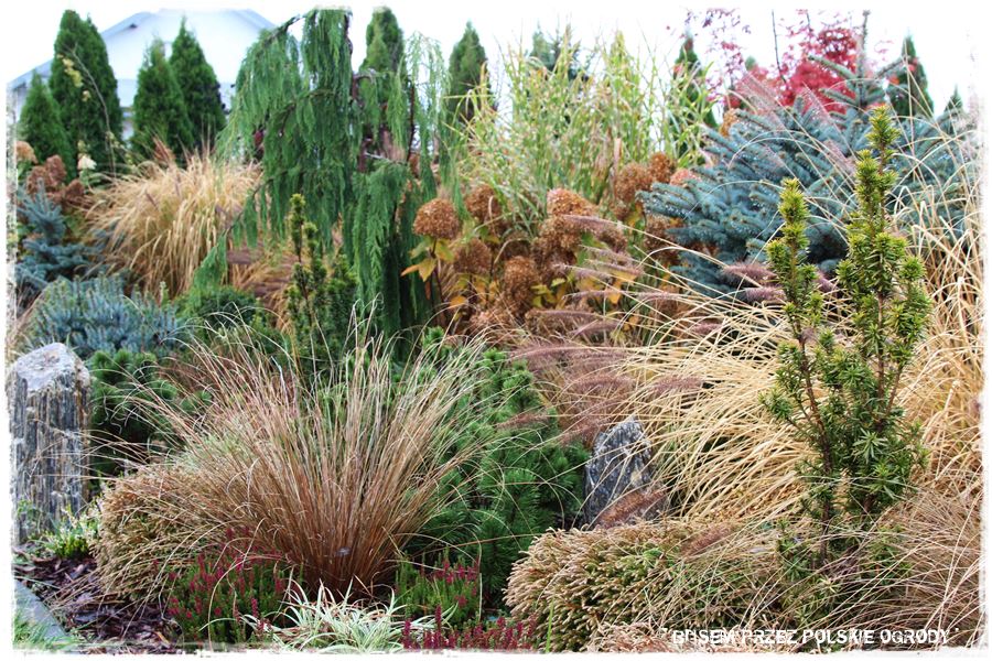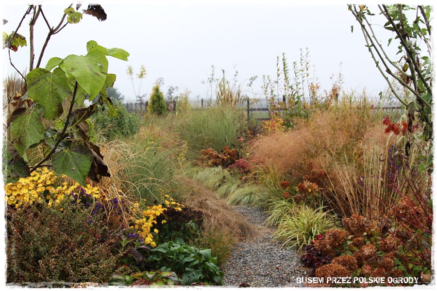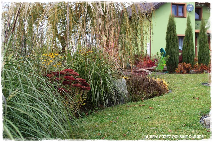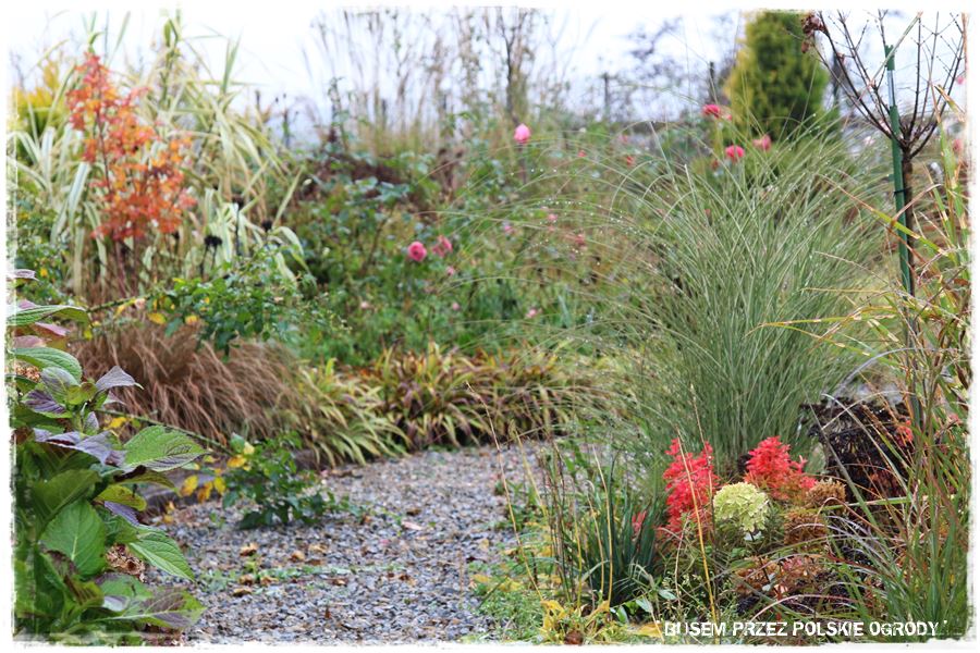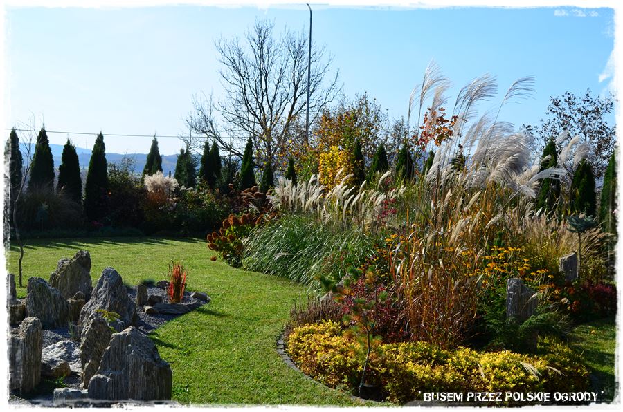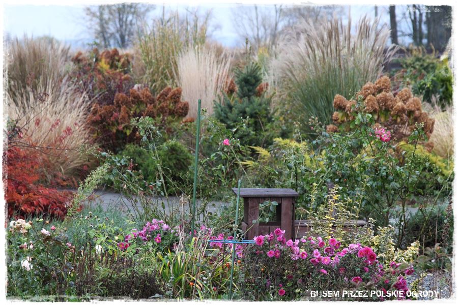 - a drugim sukcesem, a właściwie już kolejnym w tym ogrodzie, jest niezwykły dobór roślin pod względem kolorystycznym. I chyba jesienią widoczne jest to najbardziej, gdzie wiele przekwitających odmian zmienia się w odcienie brązu, a przebarwiające się liście idealnie kontrastują z zieleniami i żółciami roślin iglastych.