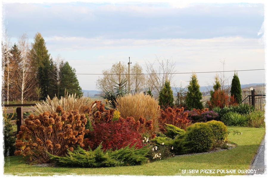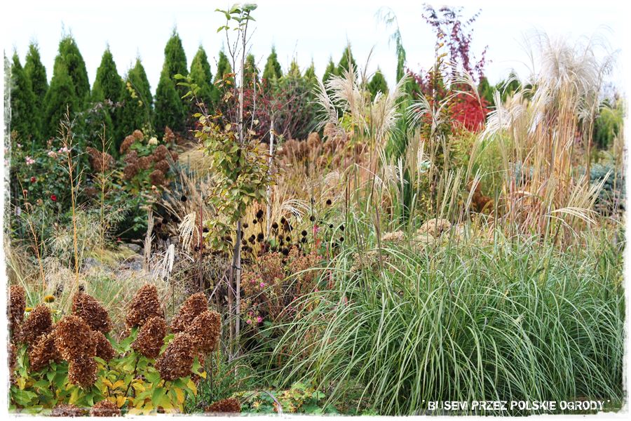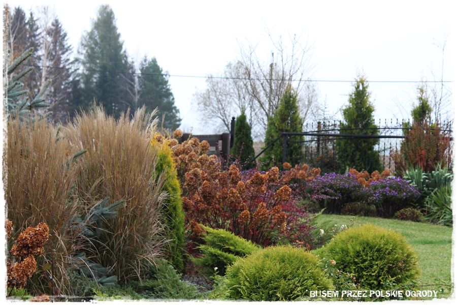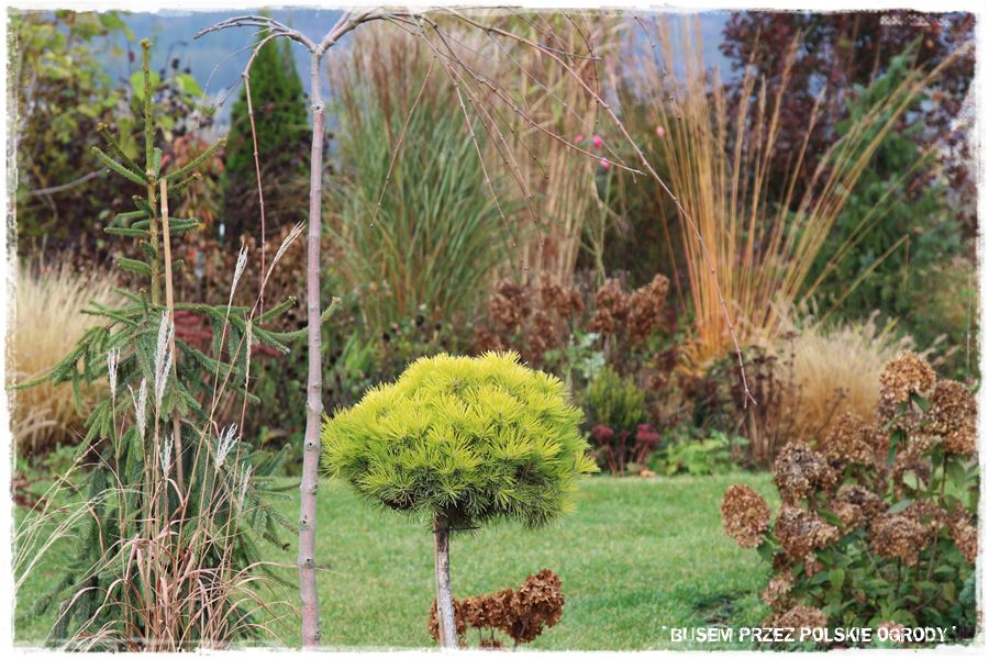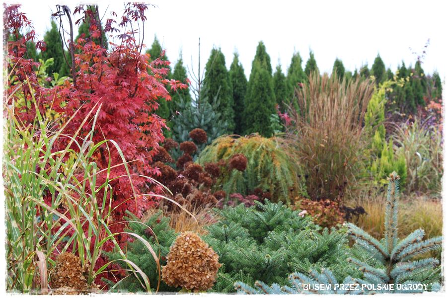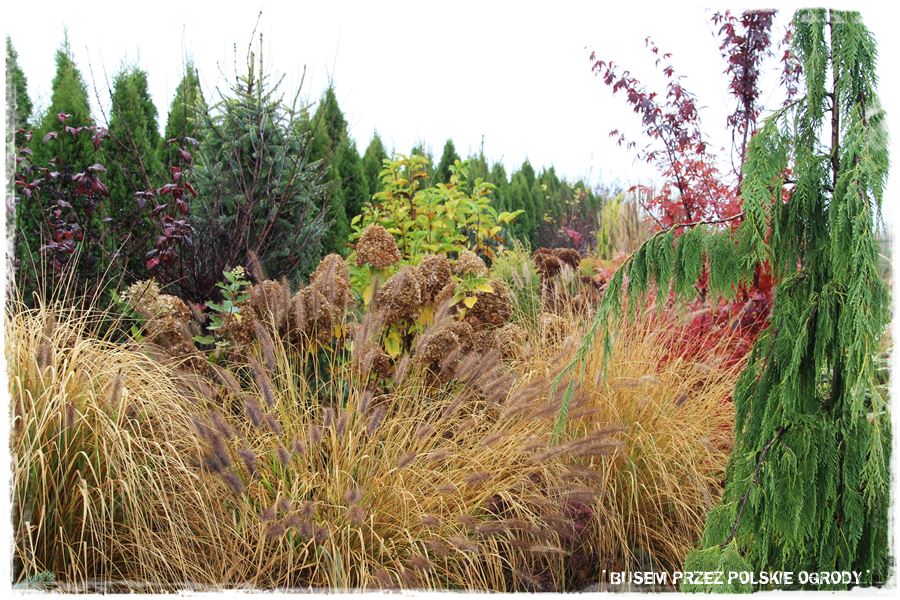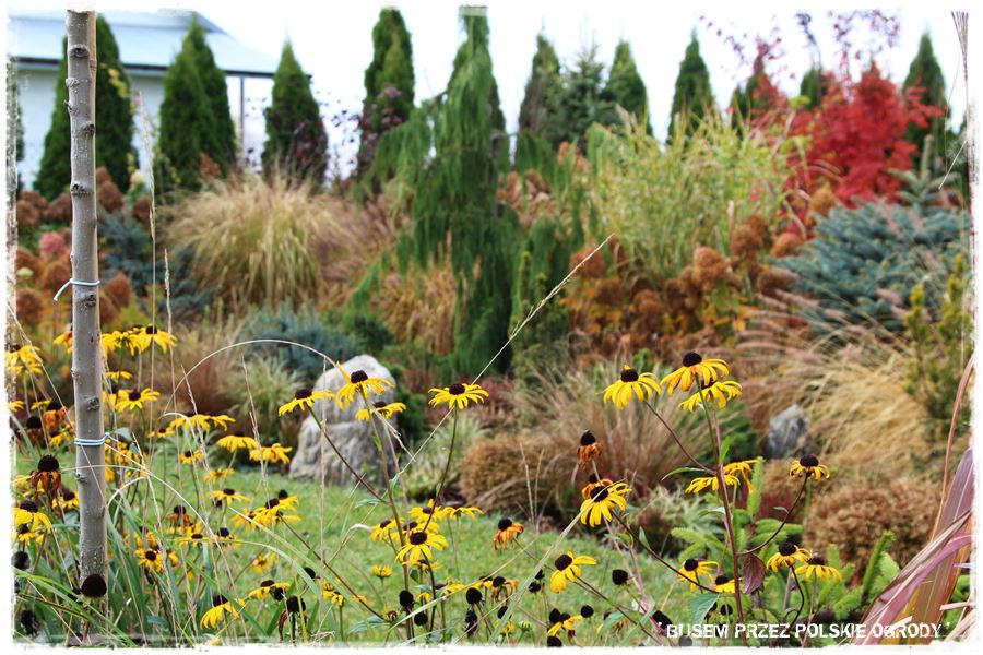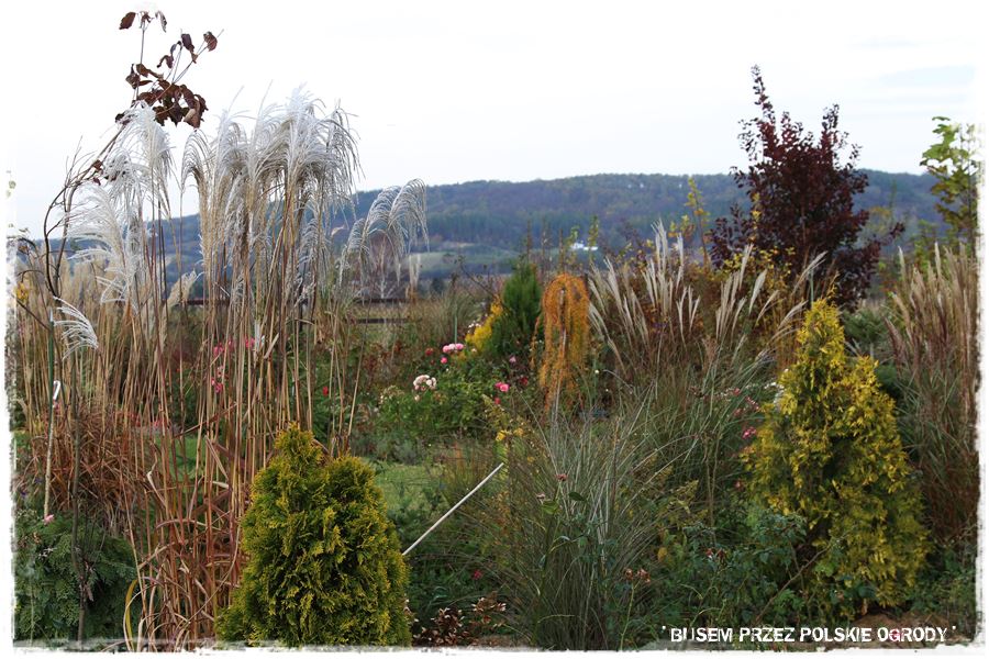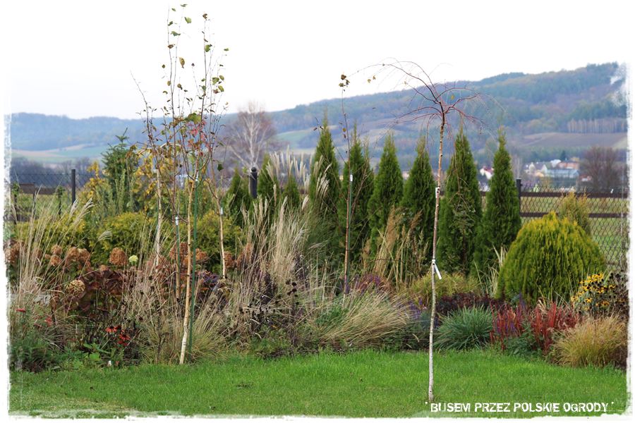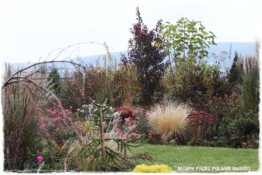 - a drugim sukcesem, a właściwie już kolejnym w tym ogrodzie, jest niezwykły dobór roślin pod względem kolorystycznym. I chyba jesienią widoczne jest to najbardziej, gdzie wiele przekwitających odmian zmienia się w odcienie brązu, a przebarwiające się liście idealnie kontrastują z zieleniami i żółciami roślin iglastych.