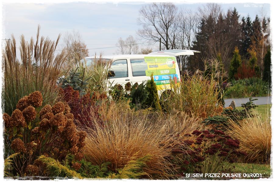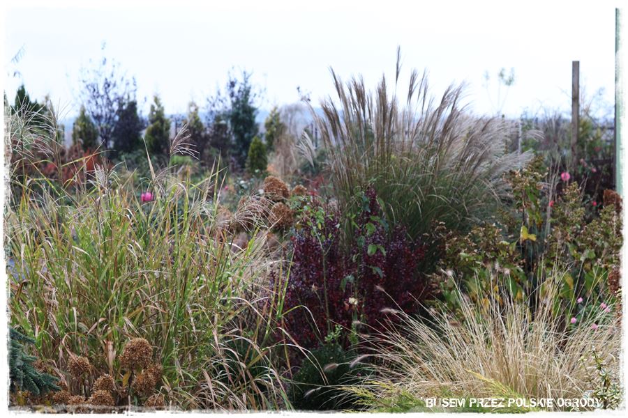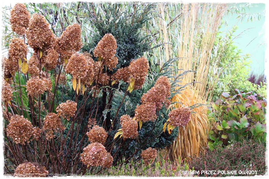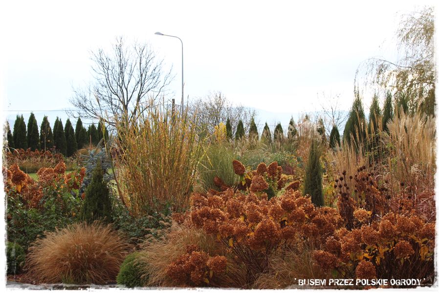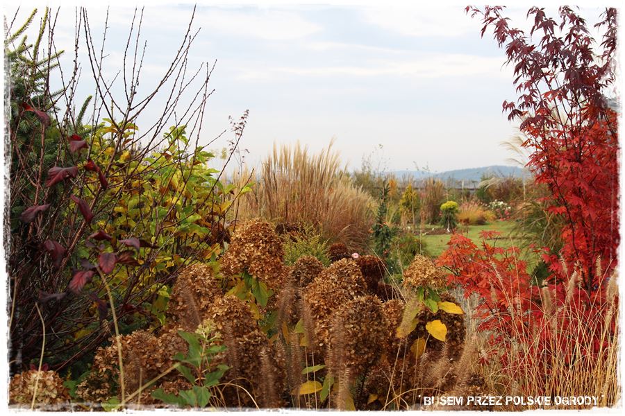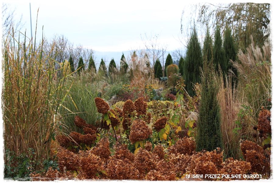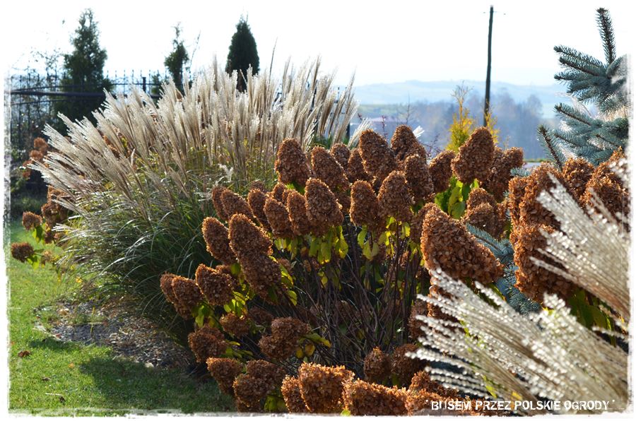 I właśnie te trawy, przepięknie komponują się kolejną liczną grupą – hortensjami. Szczególnie podczas mojej wizyty, kiedy te pierwsze są w pełni uroku, a te drugie już przekwitają, pozostawiając takie brązowe, zasuszone kwiatostany.