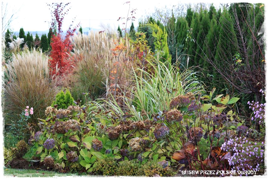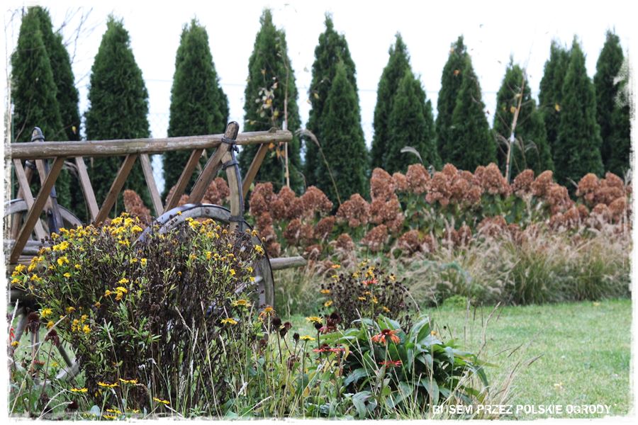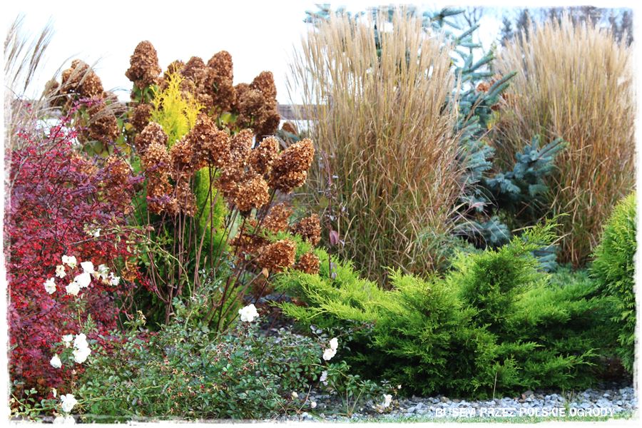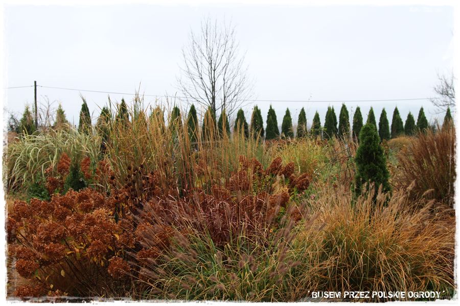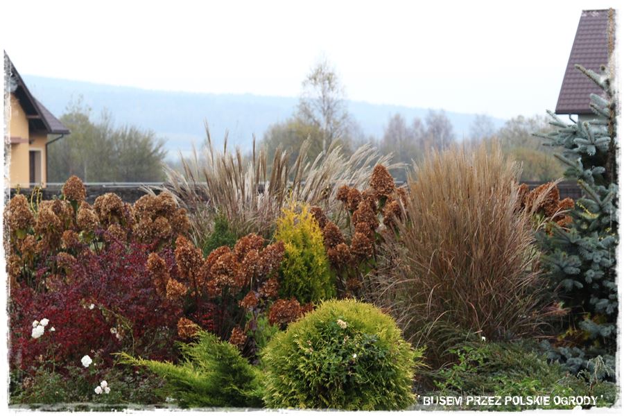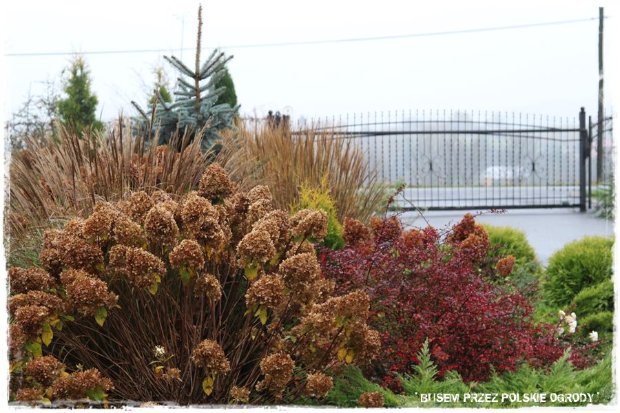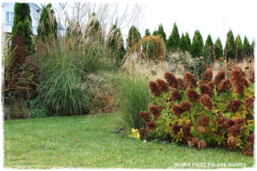 I właśnie te trawy, przepięknie komponują się kolejną liczną grupą – hortensjami. Szczególnie podczas mojej wizyty, kiedy te pierwsze są w pełni uroku, a te drugie już przekwitają, pozostawiając takie brązowe, zasuszone kwiatostany.