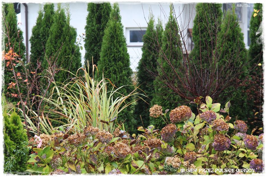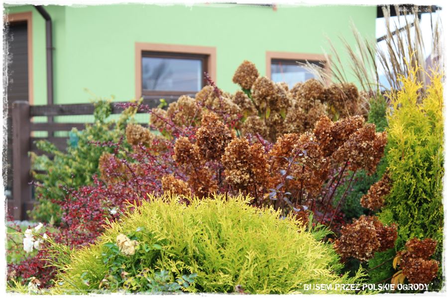 Natomiast w tej ogromnej ilości hortensji, porozmieszczanych po całym ogrodzie, udało mi się wypatrzeć jedną jedyną, która jeszcze całkiem nie przekwitła. A zatem to taki mały akcent lata, który pozostał jeszcze w tym ogrodzie.