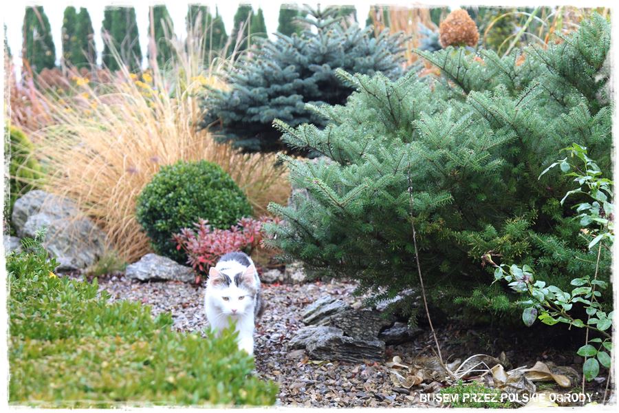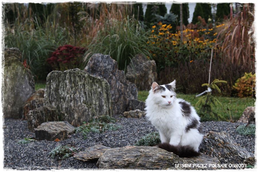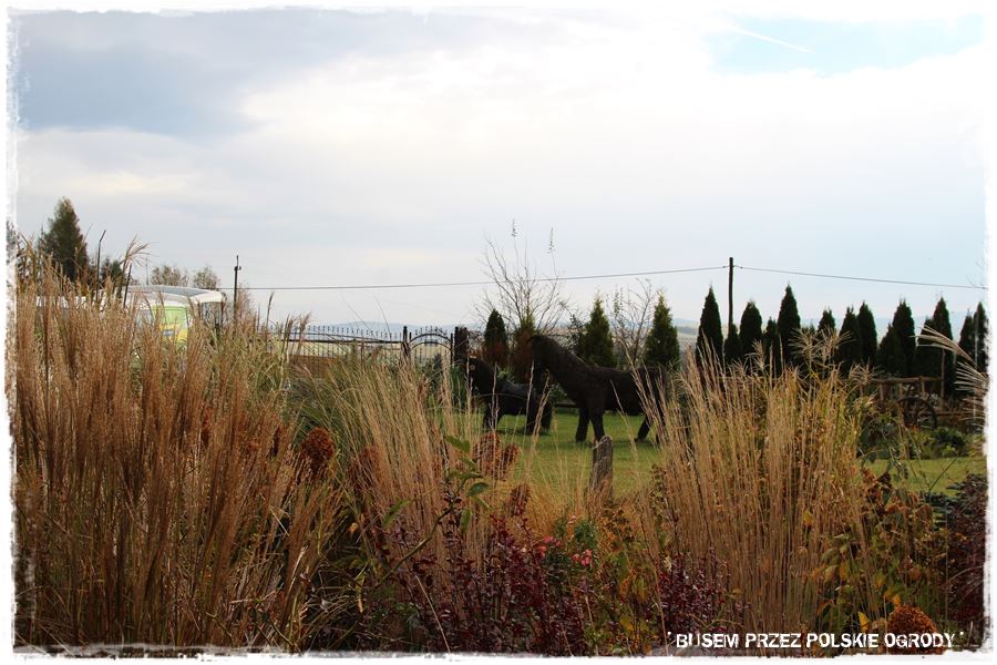 Ogród pod chmurką zachwyca swobodą,naturalnością i wielością nasadzeń na rabatach.W odsłonie jesiennej wygląda imponując …drzewa,krzewy,byliny i trawy przenikają się wzajemnie tworząc niepowtarzalną feerię barw…od czerwieni i rdzy przez żółcienie,brązy szarość kamieni i niebieskość świerków.Przy takiej mnogości roślin ogród zapewne nieustannie zmienia swoją szatę,coś przekwita,coś innego właśnie dopiero zaczyna kwitnąć.Stworzony jednak przez człowieka ogród naturalistyczny ma dla mnie jedną ogromną zaletę,mianowicie wprost idealnie wkomponowuje się w już istniejący,zastany krajobraz zewnętrzny tworząć z nim spójną całość.Obcowanie na co dzień z TAKIM ogrodem to prawdziwy raj dla zmysłów i jeszcze na dokładkę te piękne konie :).Z mojej strony ukłon i gratulacje dla właścicieli ogrodu 🙂