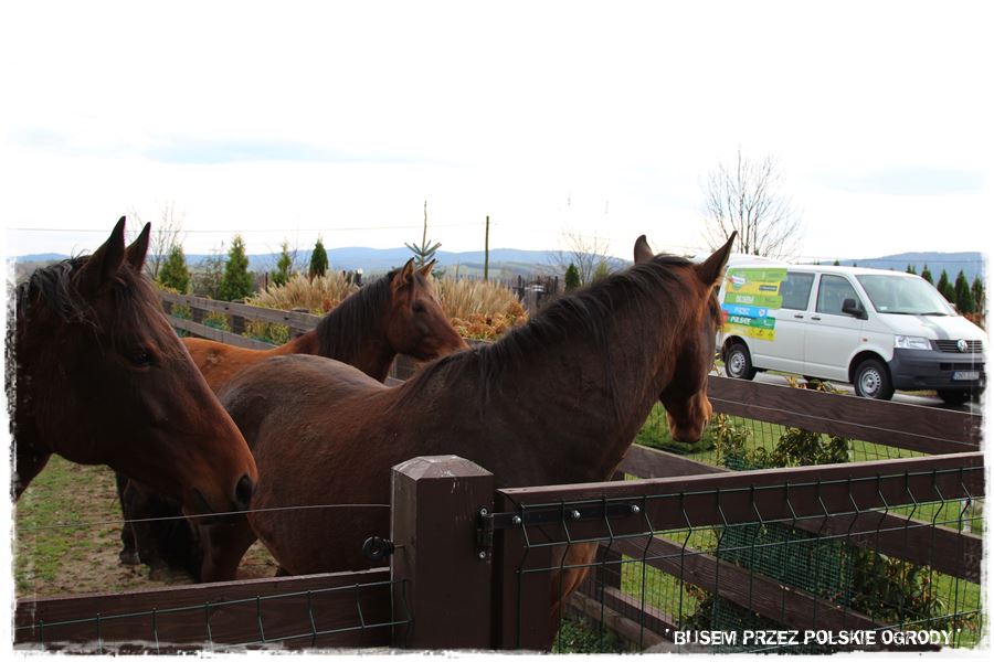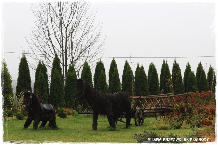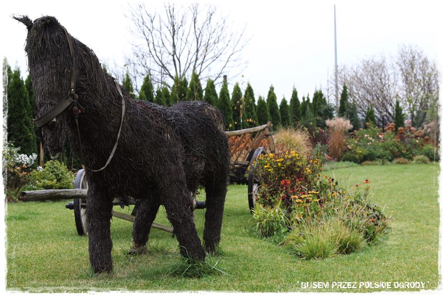 Natomiast jakby tego było jeszcze mało, w części frontowej ogrodu są jeszcze konie wiklinowe, rzeczywistych rozmiarów, które wraz z zabytkowym wozem stanowią dodatkową, oryginalną ozdobę.