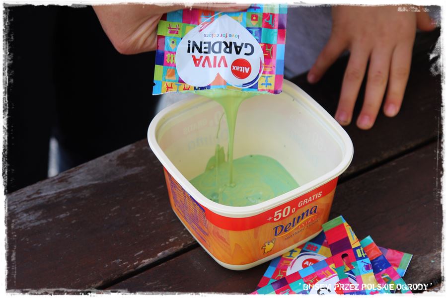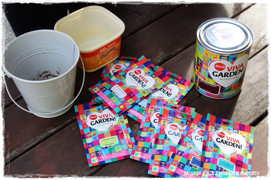Poza pracami typowo ogrodniczymi, tradycyjnie postanowiliśmy poeksperymentować z farbami. Początkowo mieliśmy zamiar wykorzystać puszkę z farbą w kolorze wiklinowy koszyk, ale ostatecznie zdecydowaliśmy się na jedną z saszetek, w kolorze limonkowy ciemiernik, który powędrował na metalowe wiaderko – niezbędne narzędzie ogrodowego pomocnika – Tadeusza.