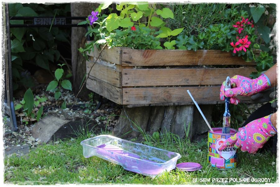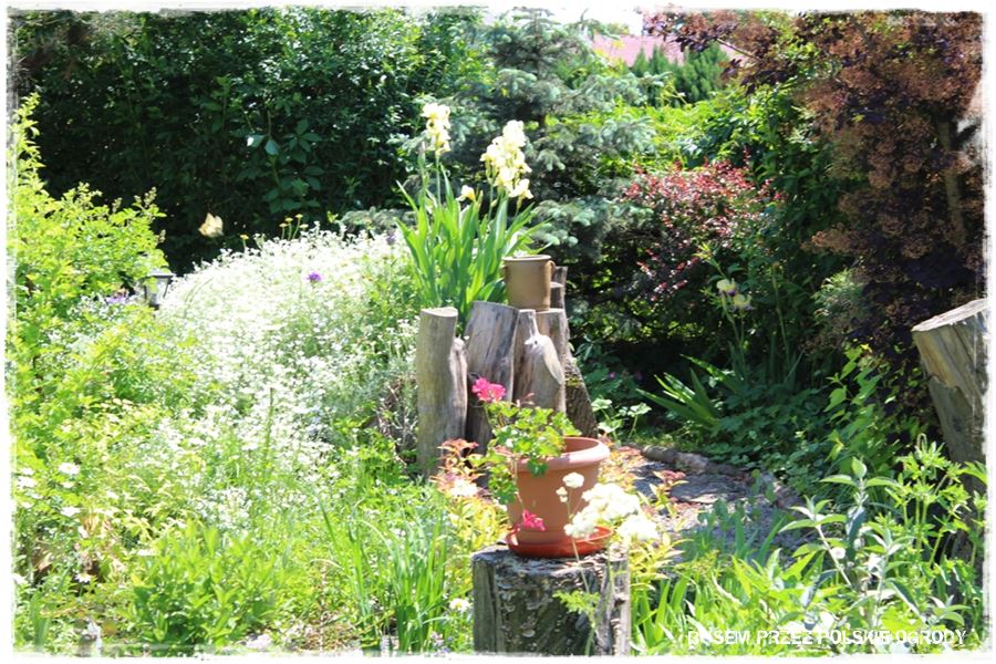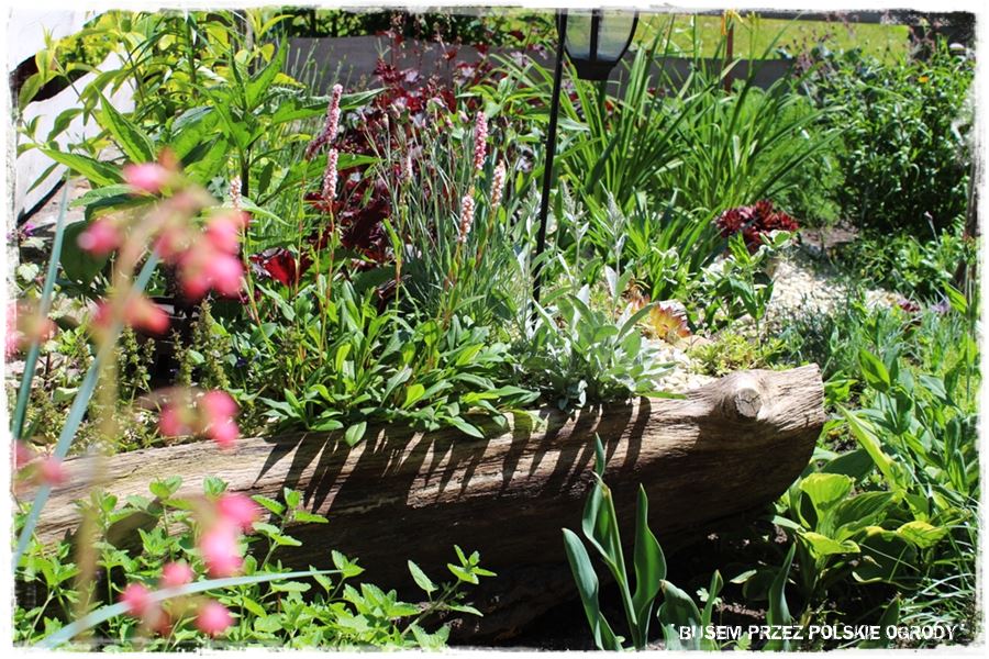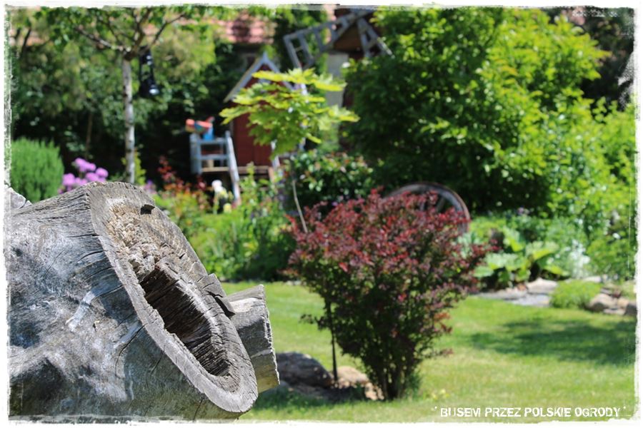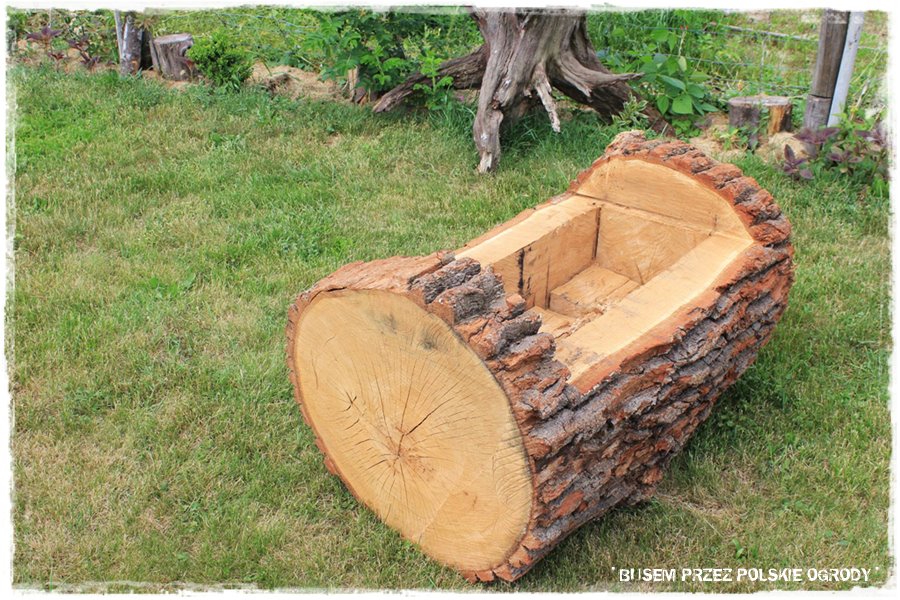 A na zakończenie tych ciekawych elementów ogrodu Kariny mała informacja: jeśli myślisz, że to wszystko co widziałeś, to już jest maksimum co ogród może pomieścić, a Karinie wyczerpały się pomysły albo znudziło się dekorowanie, to szybko śpieszę aby wyprowadzić Cię z błędu. Tam nieustanie powstają nowe elementy. Jako dowód takie donice, które Mąż Kariny samodzielnie wykonuje z drewnianych kawałów pni. Swoją drogą, kolejny ciekawy element do podpatrzenia.
