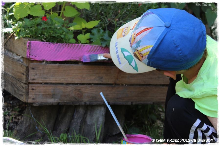 Natomiast malowanie w tym ogrodzie to było coś wyjątkowego. Dlatego, że akurat trafił się oryginalny, przygotowany wcześniej kwietnik, który docelowo miał być ozdobą z numerem domu, umieszczoną przy wjeździe na posesję. A ponadto, na malowanie wyjątkową ochotę miał syna Kariny. Stąd nie mogło być inaczej, jak tylko to wykonać,