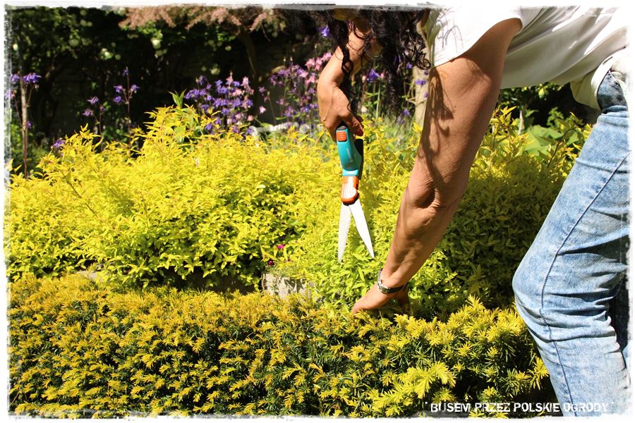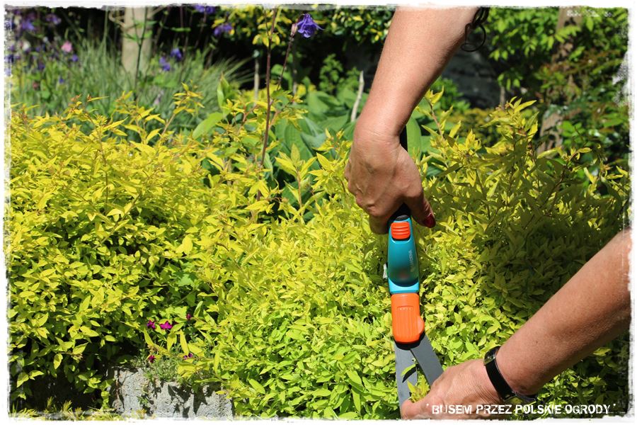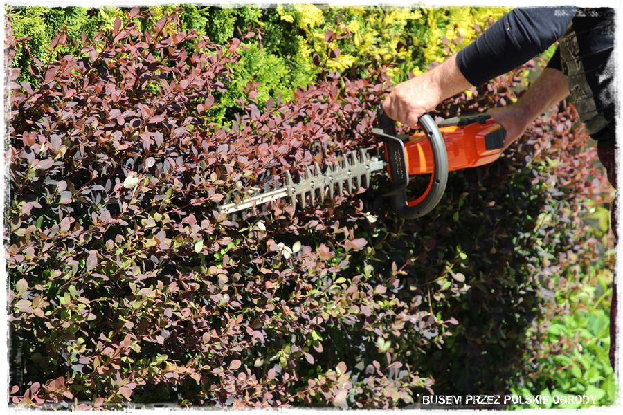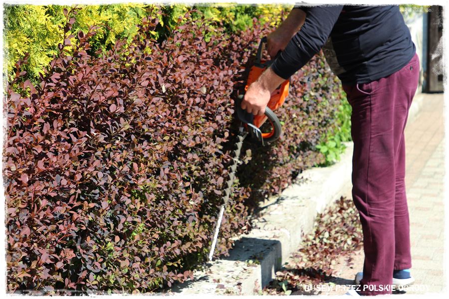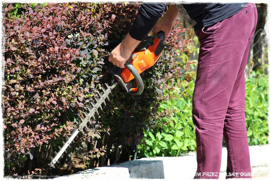 a Gospodarz, używając tej samej baterii w nożycach do żywopłotów, którymi zrobił użytek przy małym, berberysowym żywopłocie.