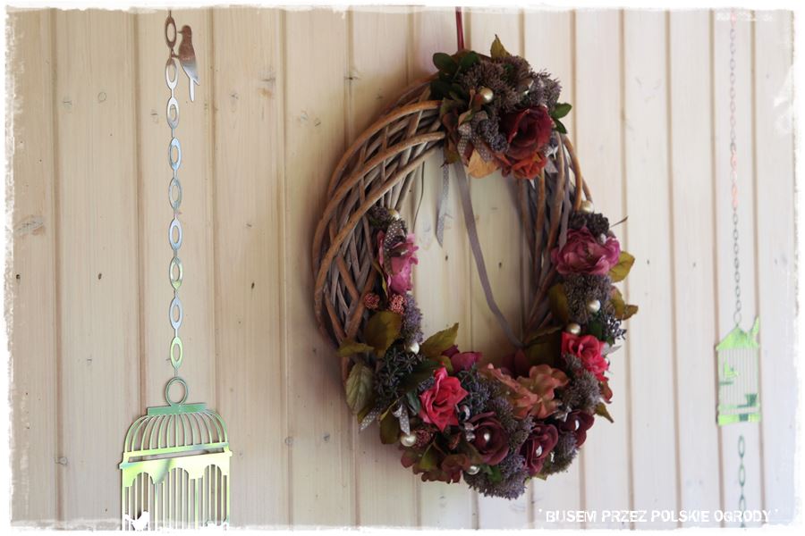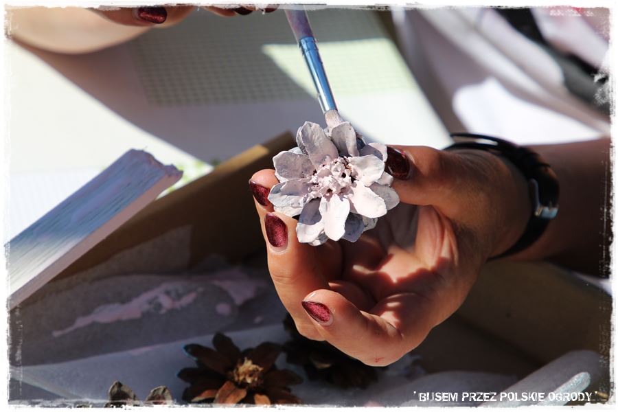 Podczas prac nie mogło zabraknąć także malowania. Wybraliśmy więc puszkę z farbą w kolorze różowym, który powędrował na szyszki, których Irena używa do własnoręcznie tworzonych stroików i dekoracji. Podobnych jak ta, która zdobi werandę letniego domku.