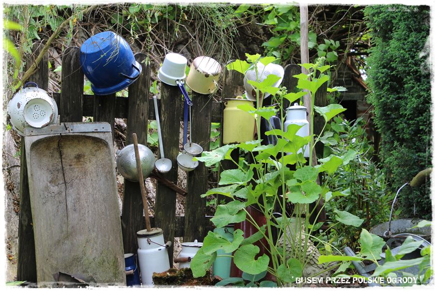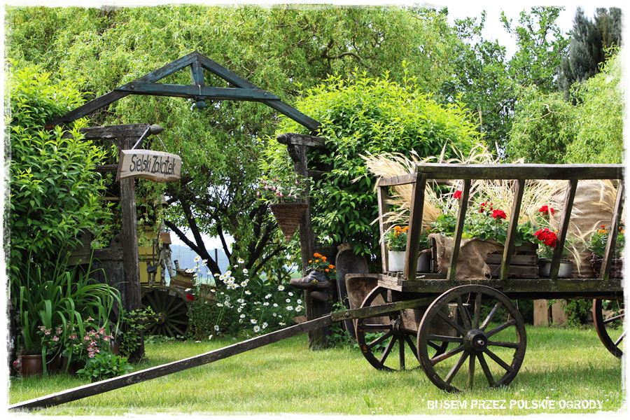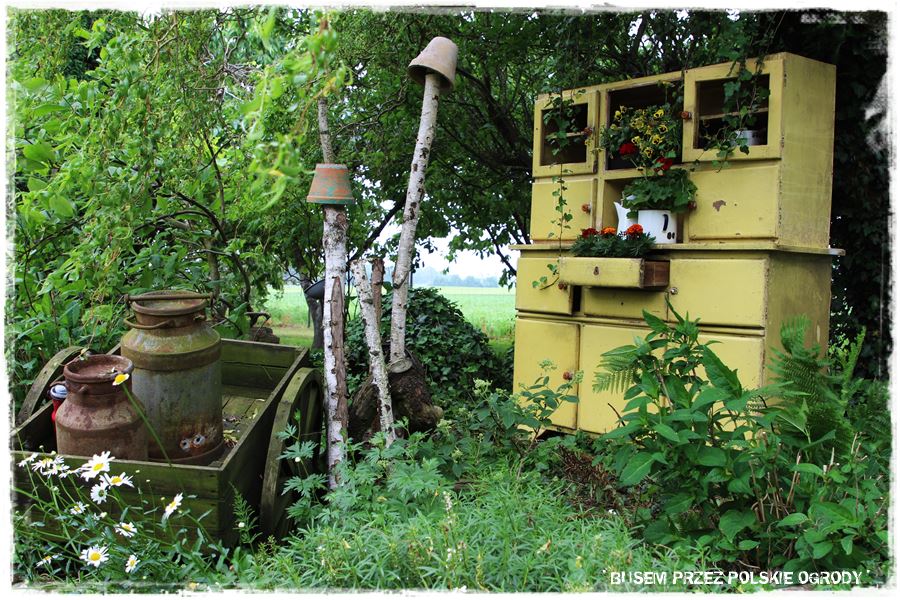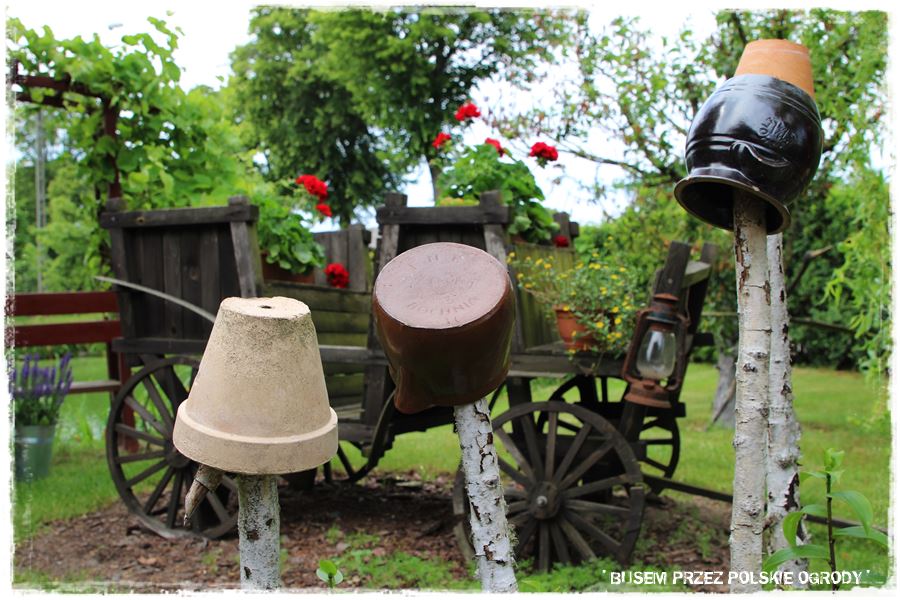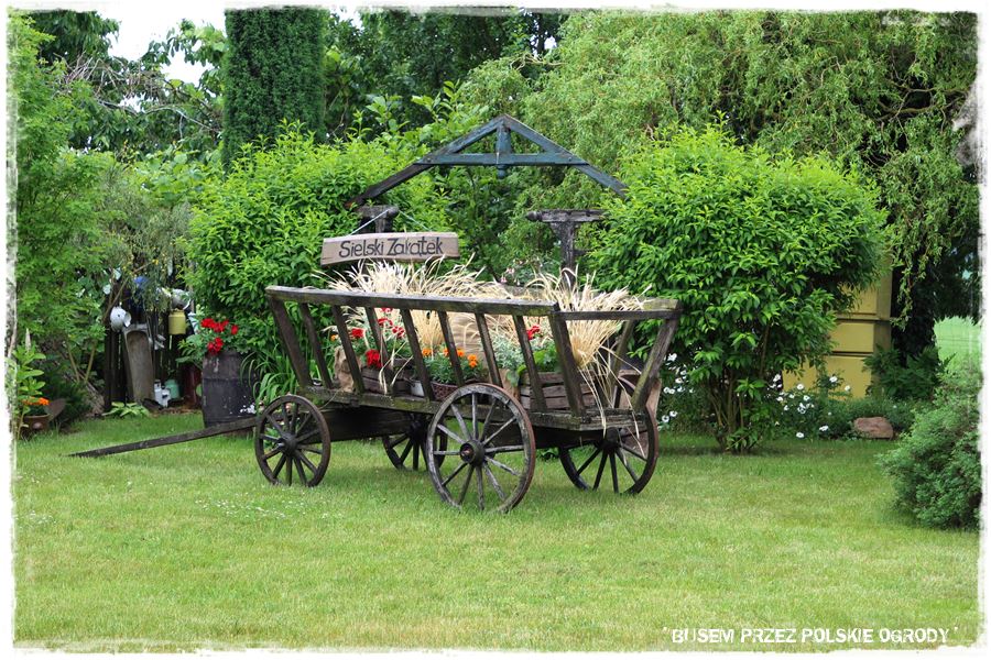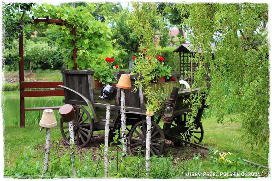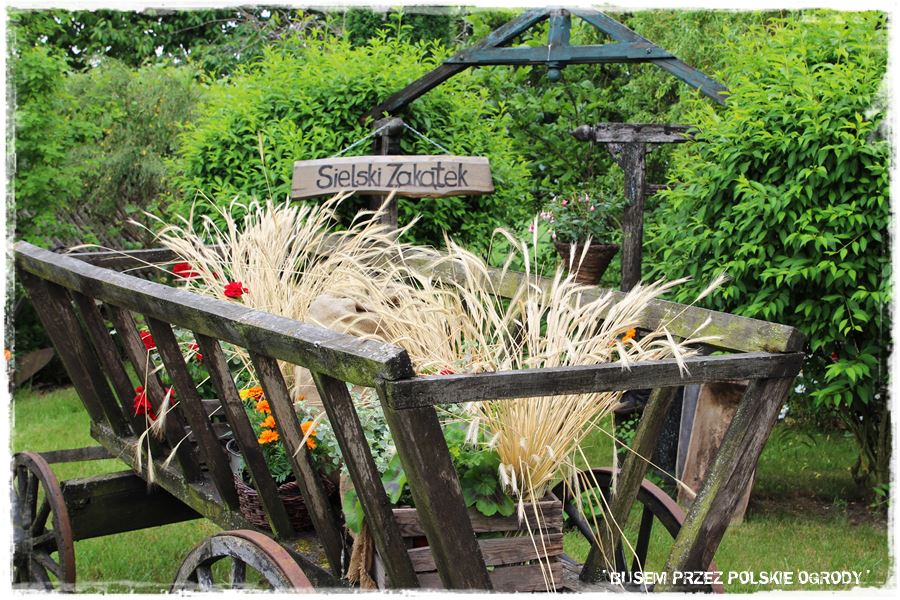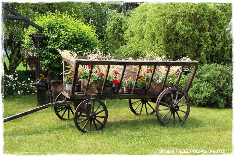 - po drugie ogród ten to pewnego rodzaju mały skansen, w którym ozdobami są nie tylko stare garnki, skrzynki, doniczki itd., ale również stare meble, czy nawet wóz, który dziś można oglądać chyba tylko w muzeum lub w jakiś archiwalnych filmach.