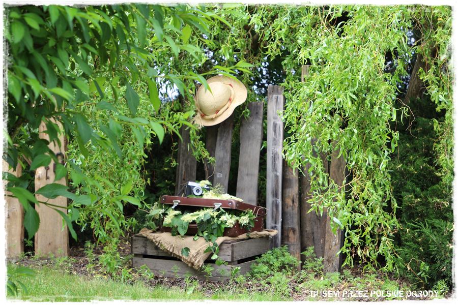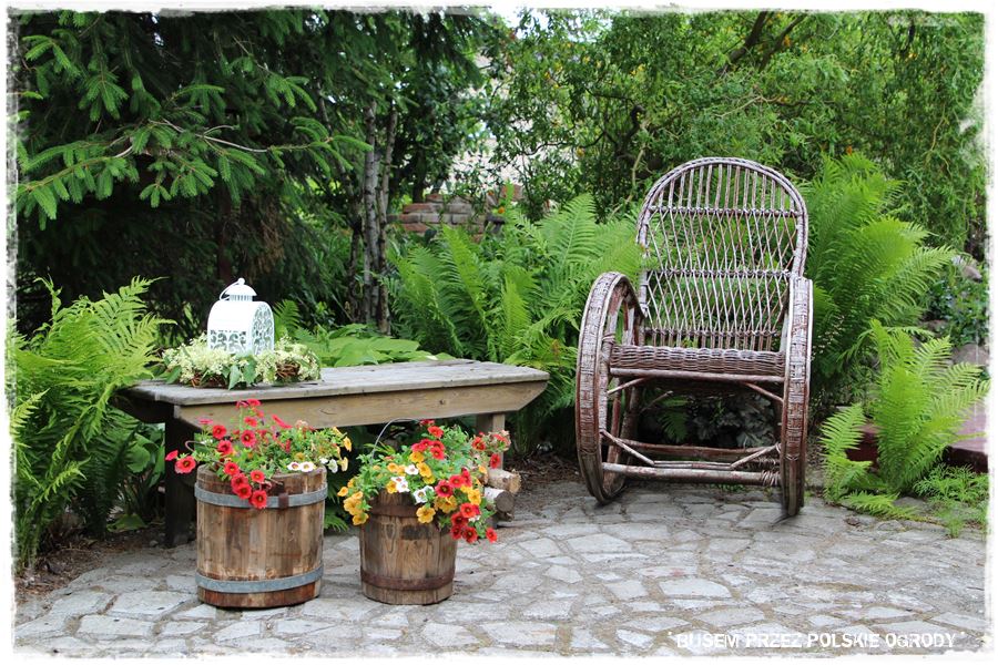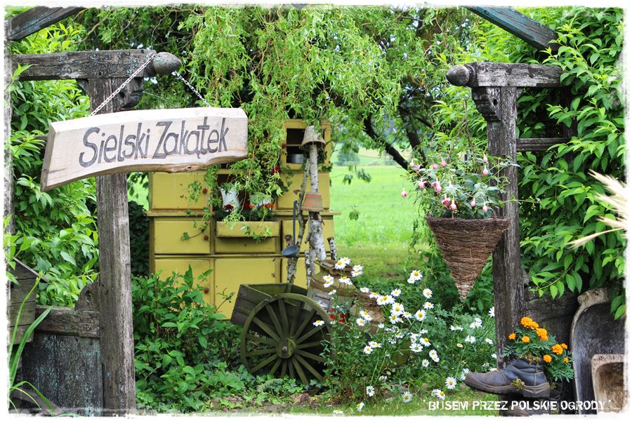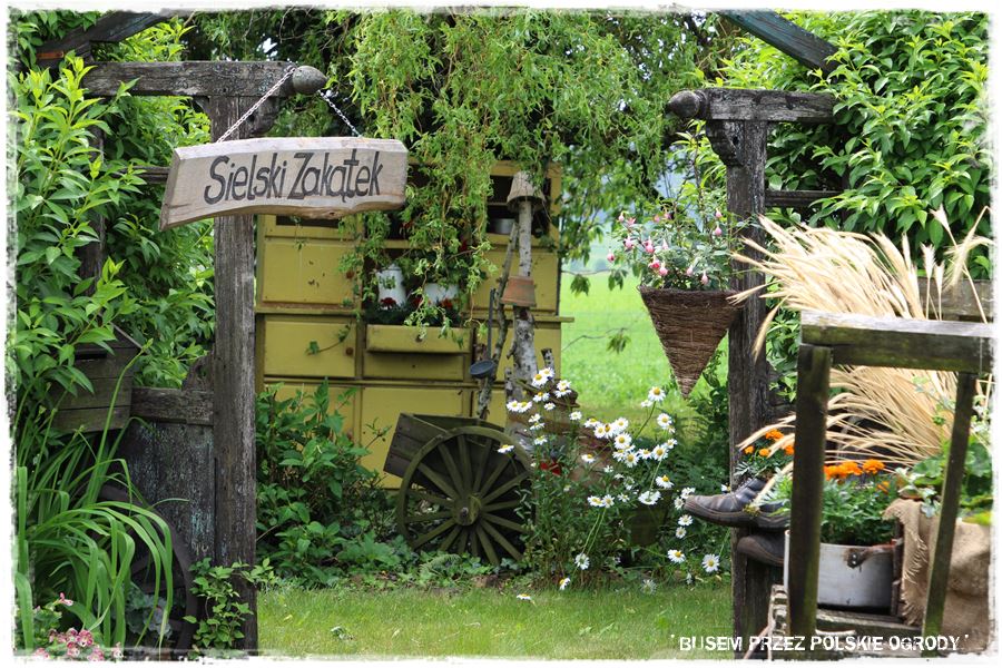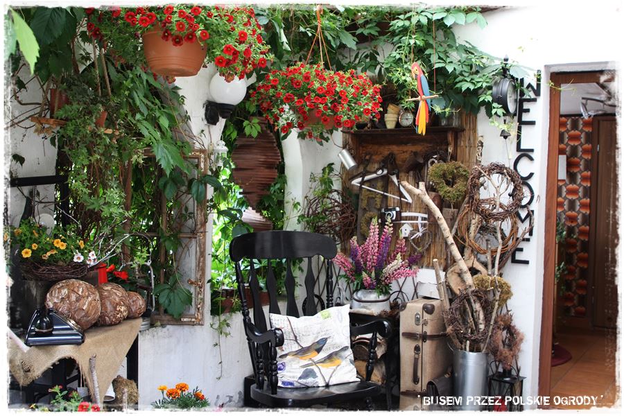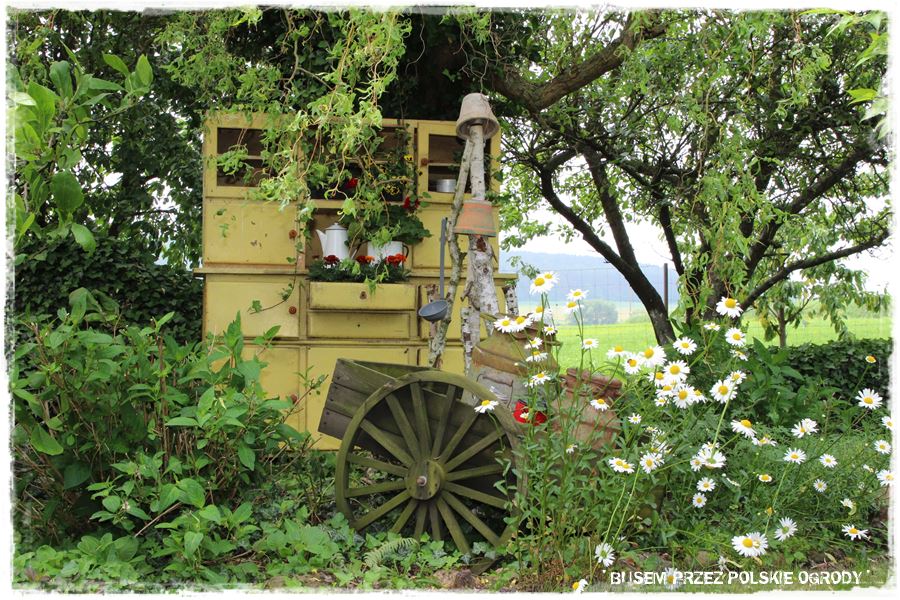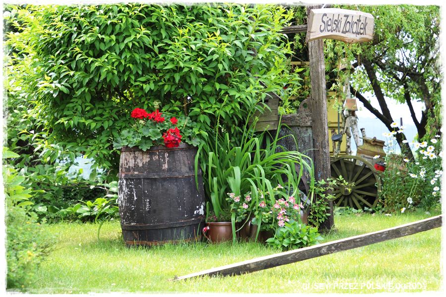 - po drugie ogród ten to pewnego rodzaju mały skansen, w którym ozdobami są nie tylko stare garnki, skrzynki, doniczki itd., ale również stare meble, czy nawet wóz, który dziś można oglądać chyba tylko w muzeum lub w jakiś archiwalnych filmach.