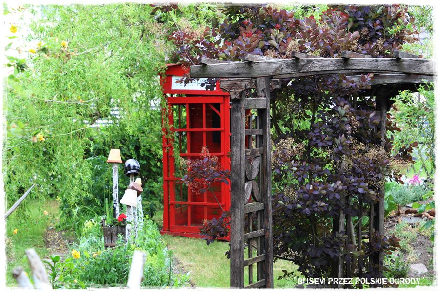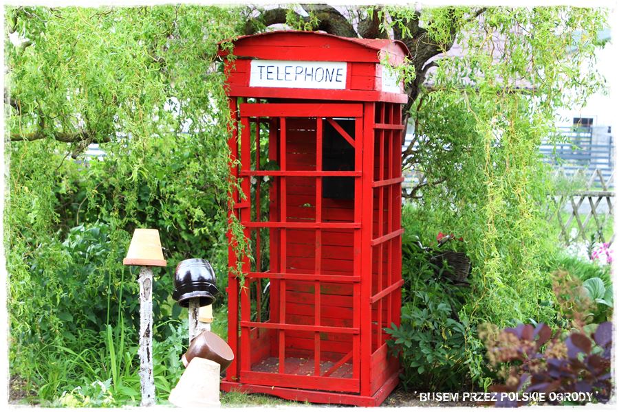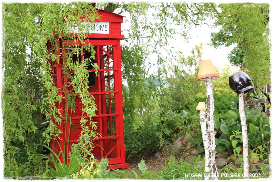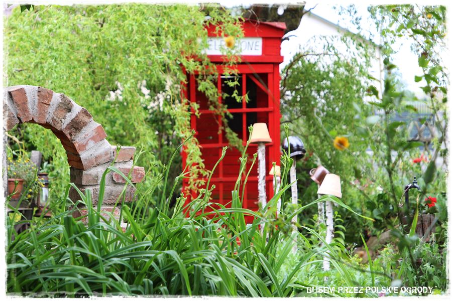 To taki niewielki obszar zlokalizowany od frontu działki, pomiędzy drogą, a budynkiem mieszkalnym. Jak cały ogród gęsto obsadzony i ozdobiony, w którym na pierwszy plan wysuwa się oryginalna imitacja angielskiej budki telefonicznej.