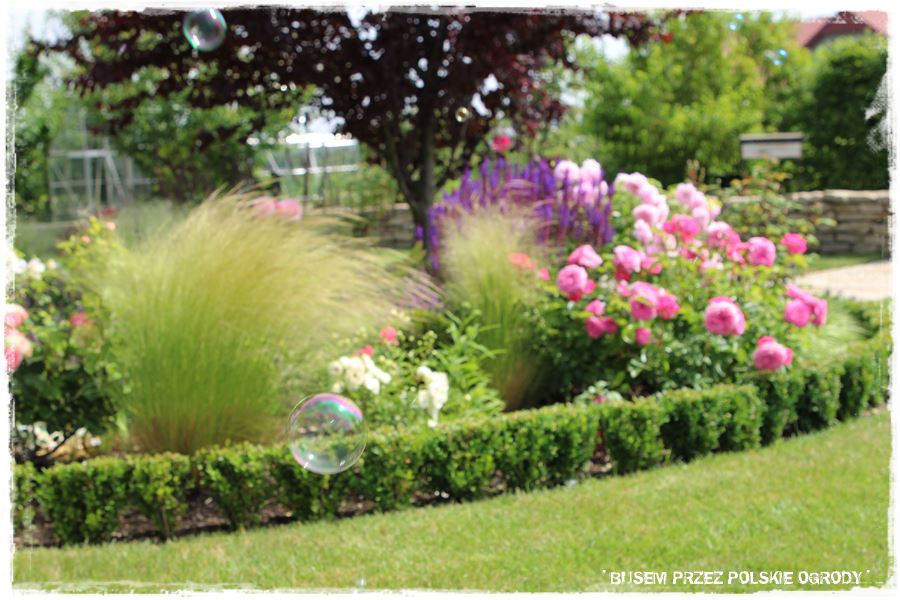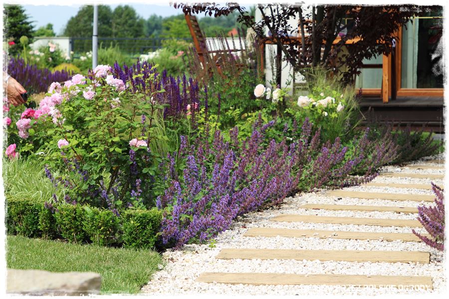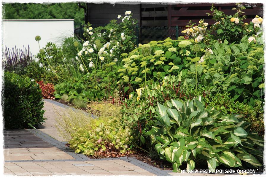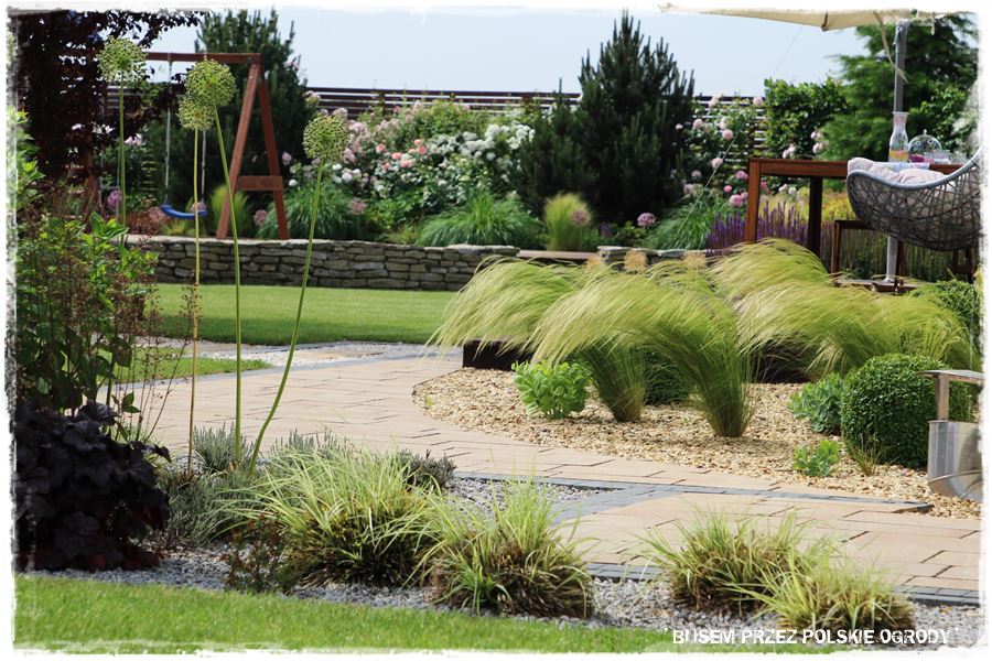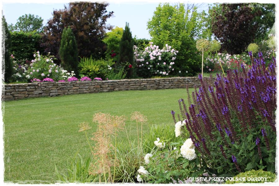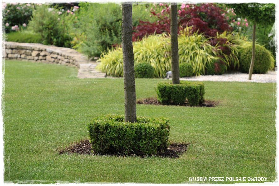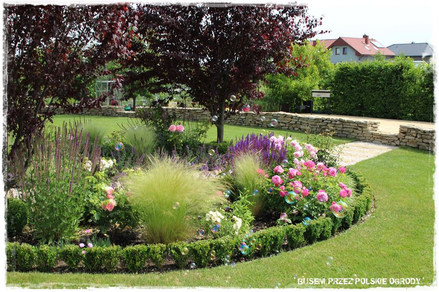- ramy te w głównej mierze wyznacza również oryginalny, kamienny okrąg, który stanowi granicę pomiędzy trawnikiem i jedną wielką rabatą otaczającą ogród.