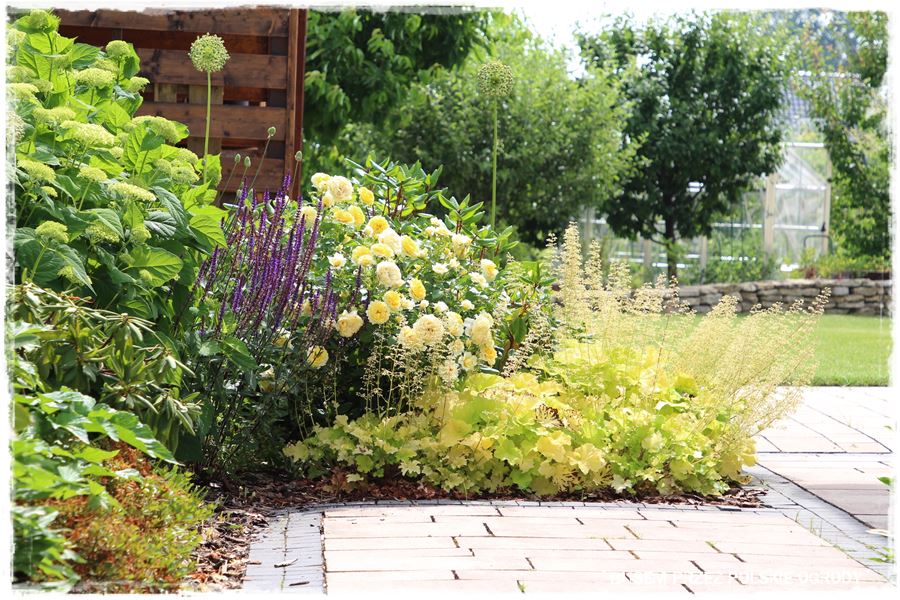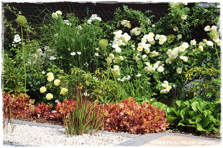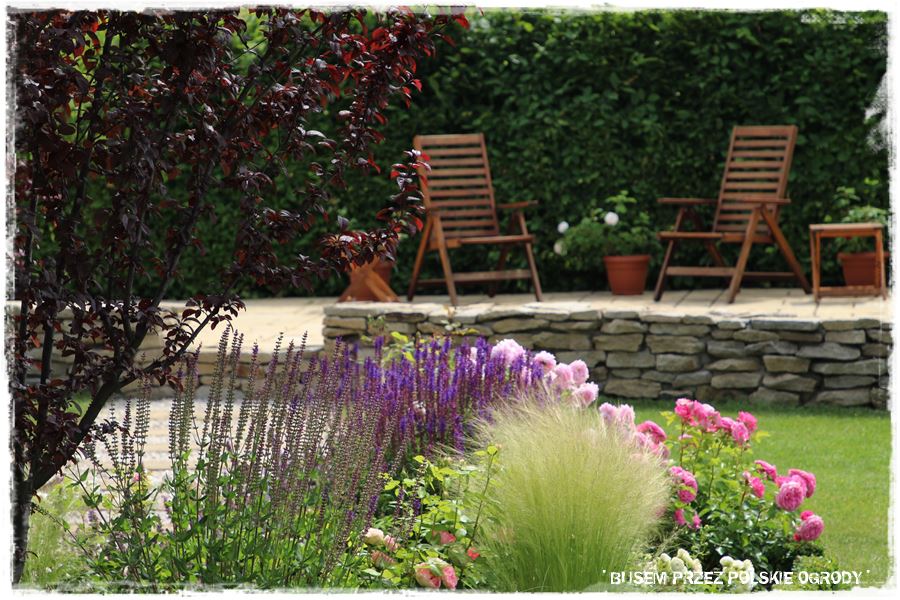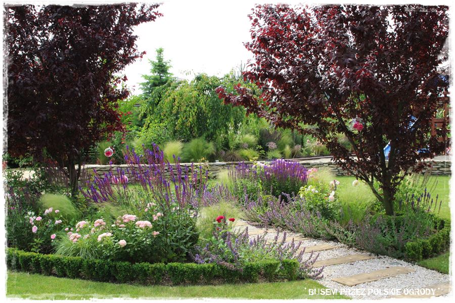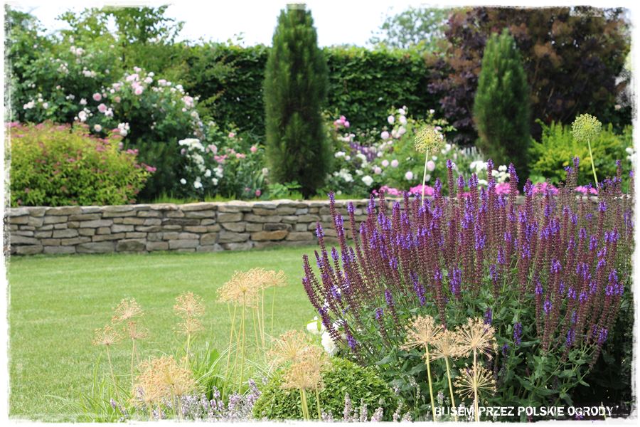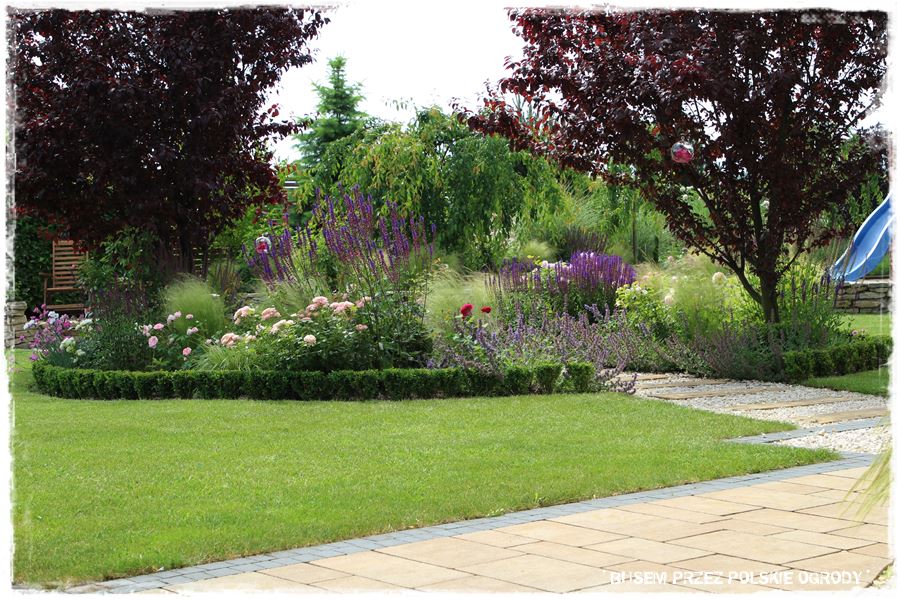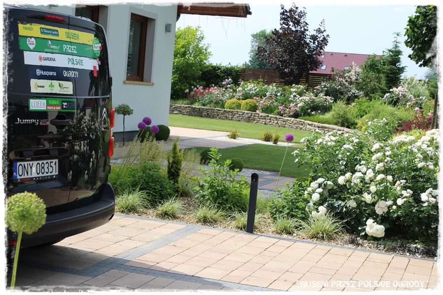 - ramy te w głównej mierze wyznacza również oryginalny, kamienny okrąg, który stanowi granicę pomiędzy trawnikiem i jedną wielką rabatą otaczającą ogród.