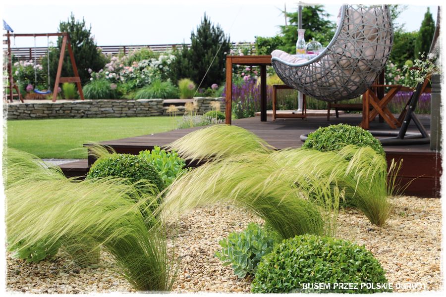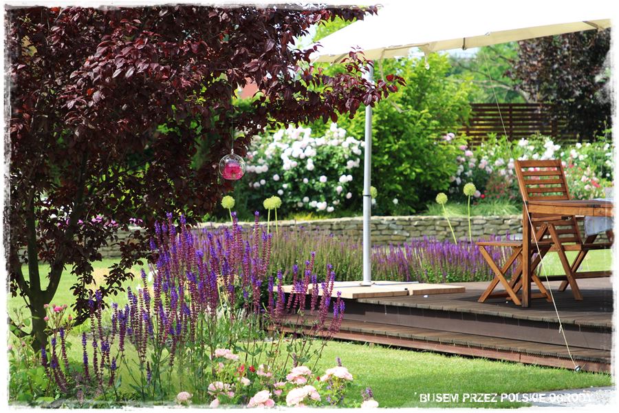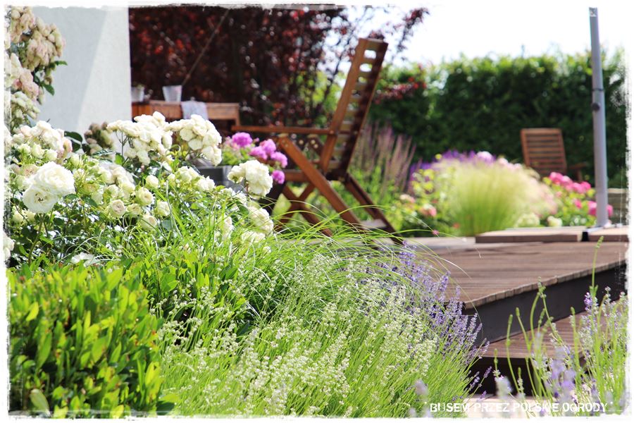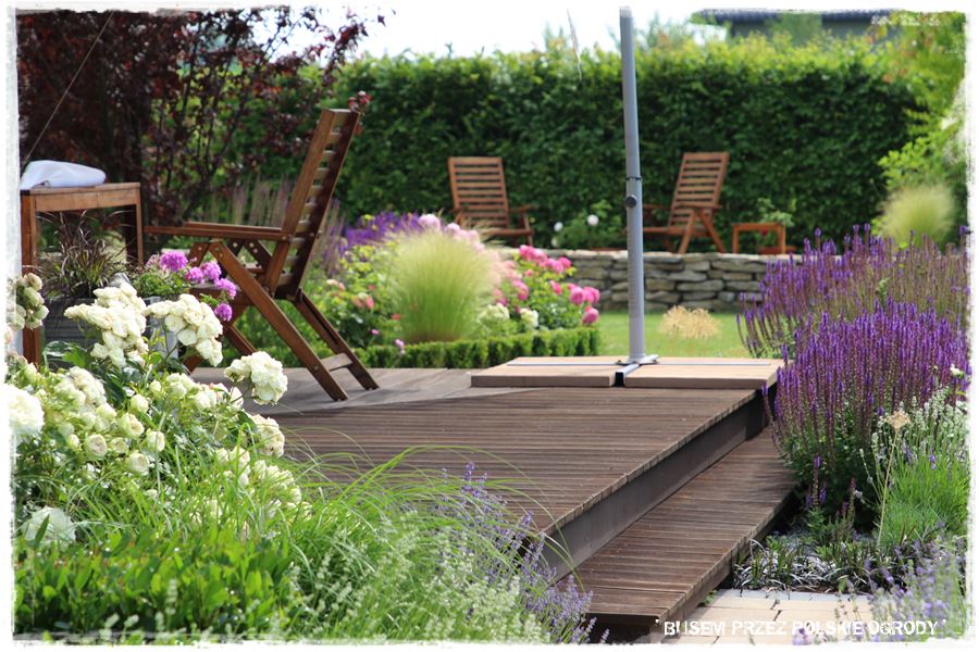 Niezwykle ciekawym elementem ogrodu jest zlokalizowany za budynkiem drewniany taras, a mówiąc precyzyjnie sposób w jaki został zaaranżowany. Otaczają go kolorowe i lekkie rabaty, które efektownie oddzielają go od otaczającego trawnika.