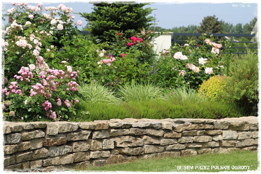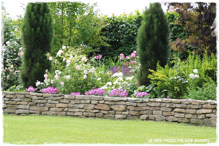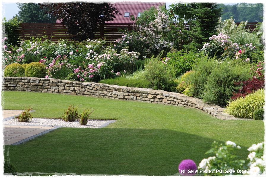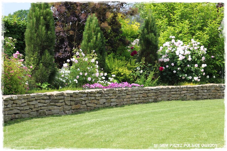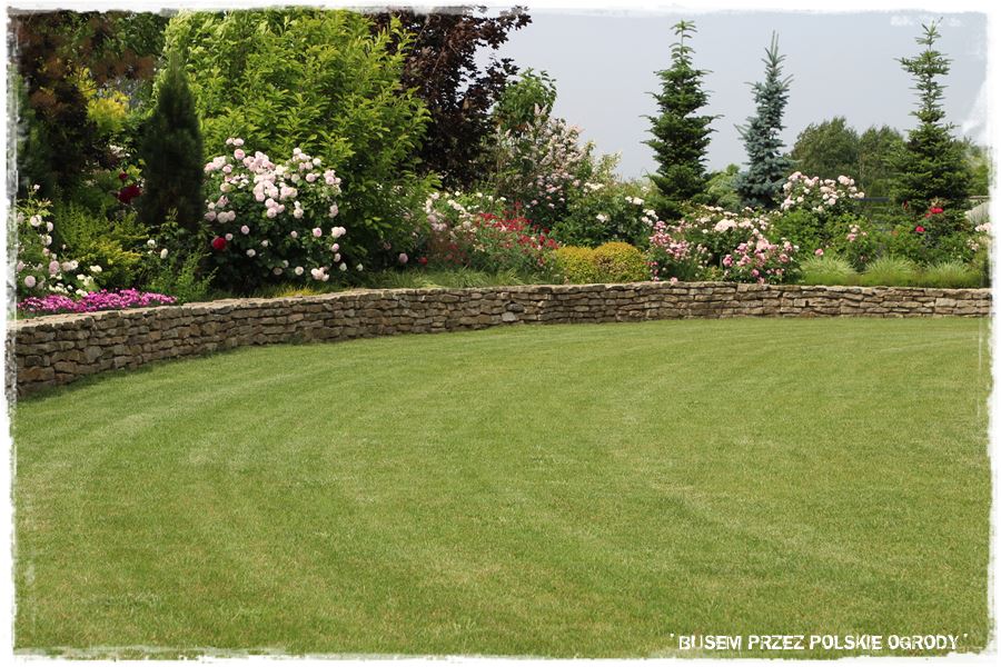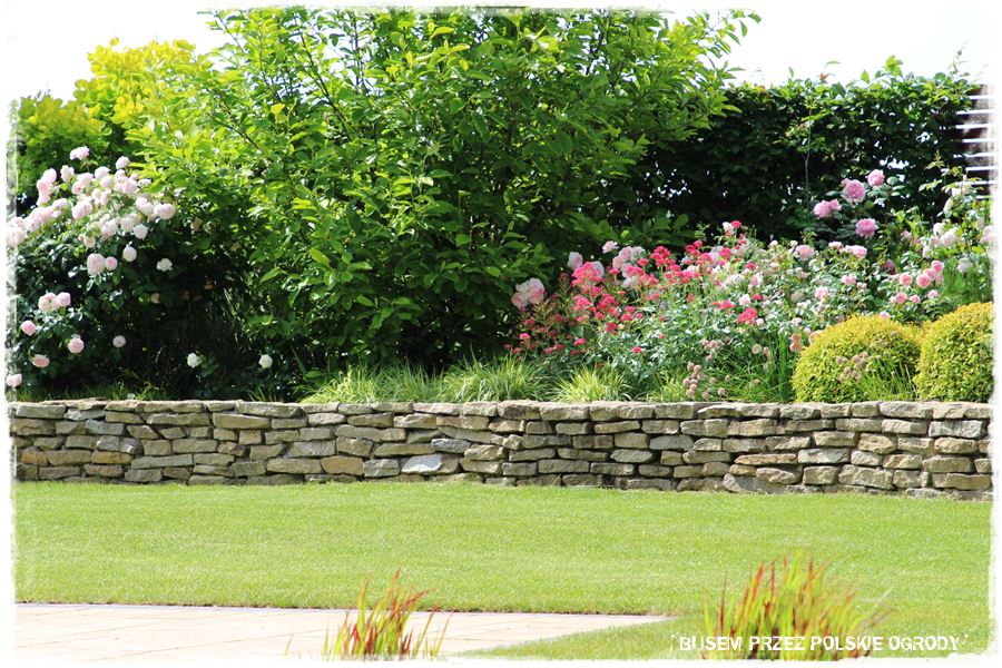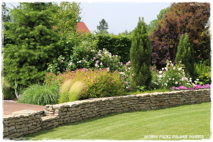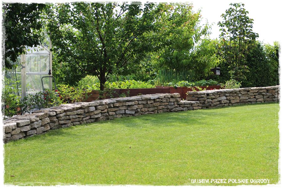Drugi najbardziej charakterystyczny element ogrodu stanowi wspomniany, kamienny mur, który dosłownie otacza boczną i tylną część ogrodu. Jest pomysłowo wykonany, tzn. na swoim początku wychodzi z poziomu trawnika, następnie wznosi się wyznaczając za sobą obszar będący dużą, podwyższoną rabatą, a w końcówce znów opada do początkowego poziomu. W ten sprytny sposób płaski teren zyskał dodatkowy poziom, a zatem optycznie stał się urozmaicony i zdecydowanie ciekawszy.