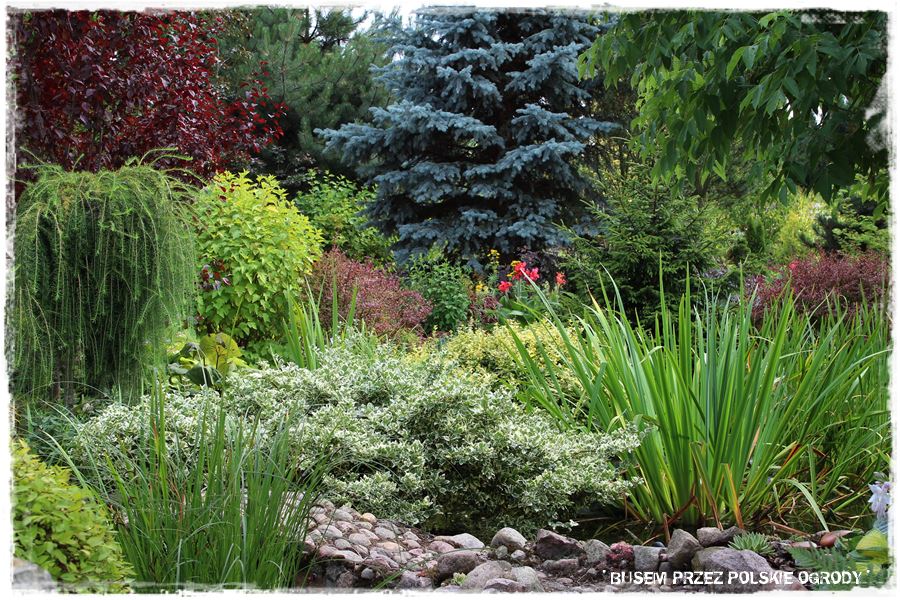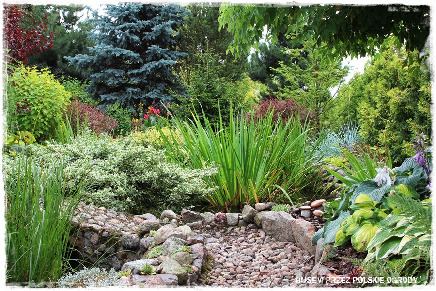 Podoba mi się jak tutaj w tm ogrodzie płynnie jedna roślina przechodzi w następną a skomponowane jest to tak, że oczu szkoda odrywać. Z przyjemnością usiadłabym z właścicielką przy tym stoliku z filiżanką aromatycznej kawy i posłuchałabym na żywo o tworzeniu tego pięknego miejsca. Iglica i kora kamienna z pewnością komponują się tam świetnie, tak jak i czerwona donica, taki energetyczny akcent 🙂