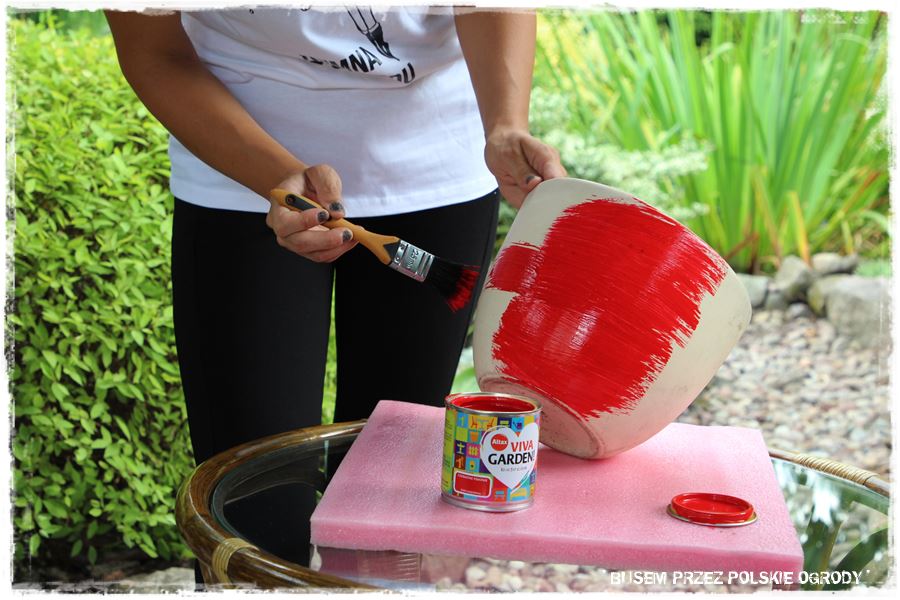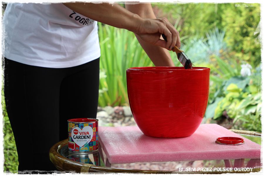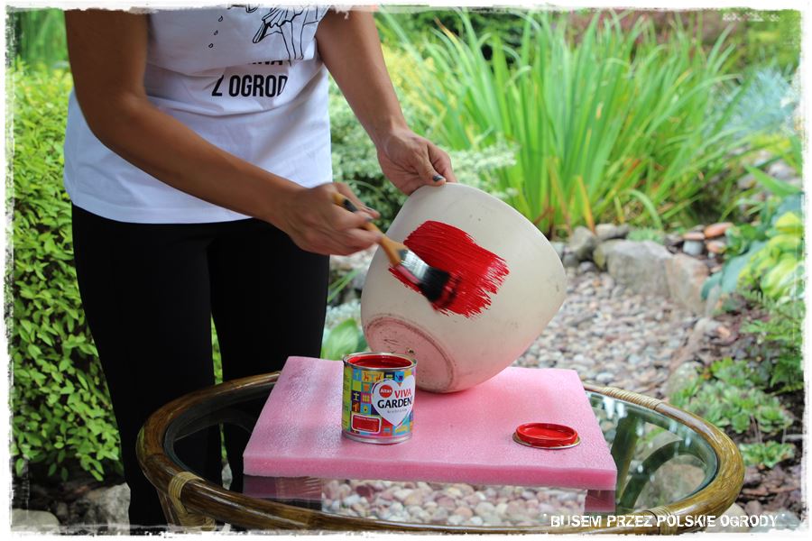 a także postanowiliśmy zrobić małe malowanie. Wybraliśmy więc puszkę z farbą w kolorze czerwonym, która powędrowała na jedną z ogrodowych donic.