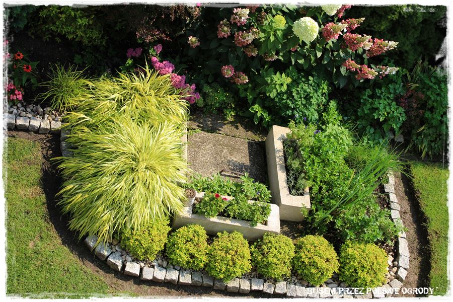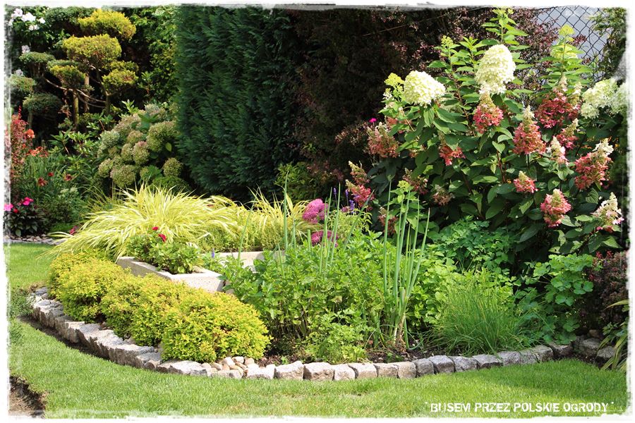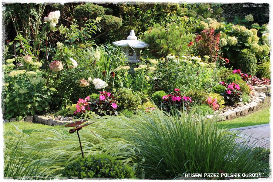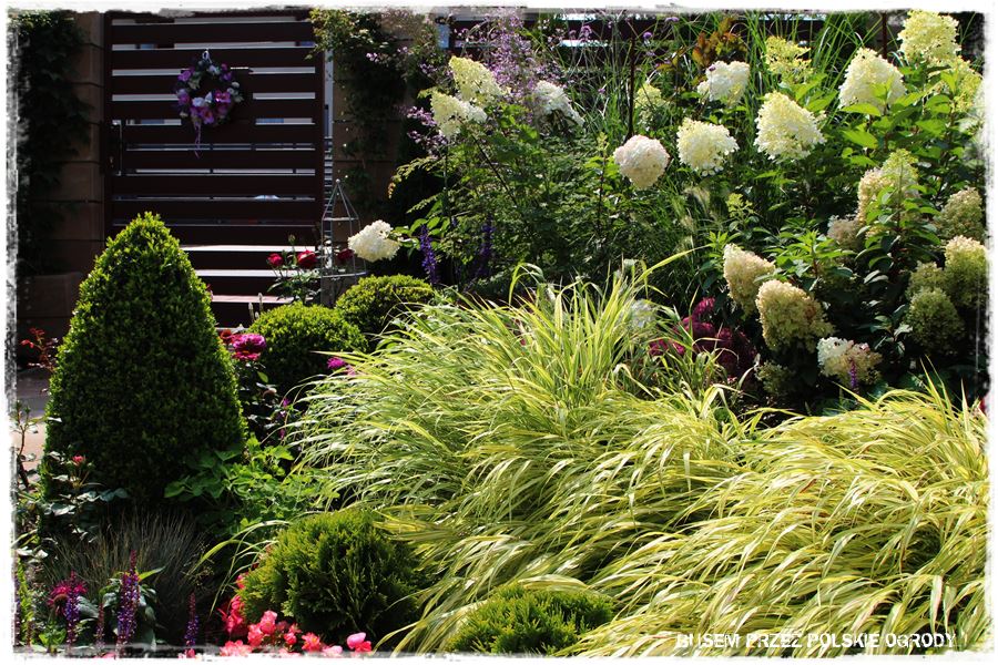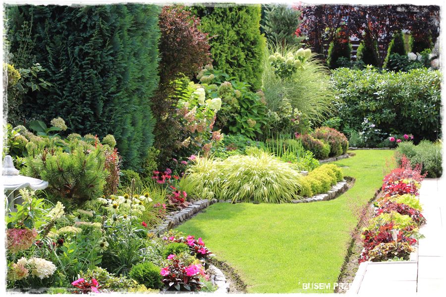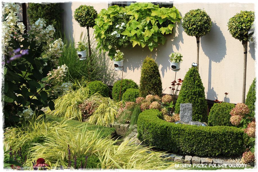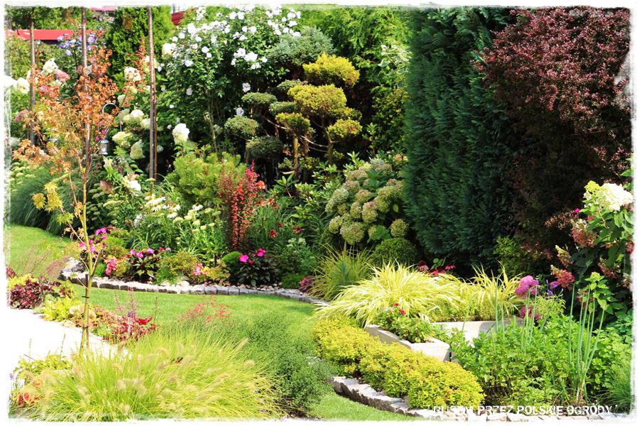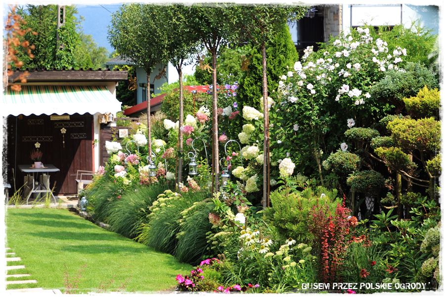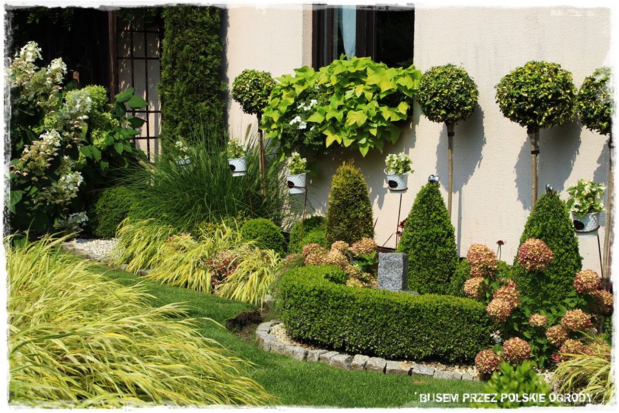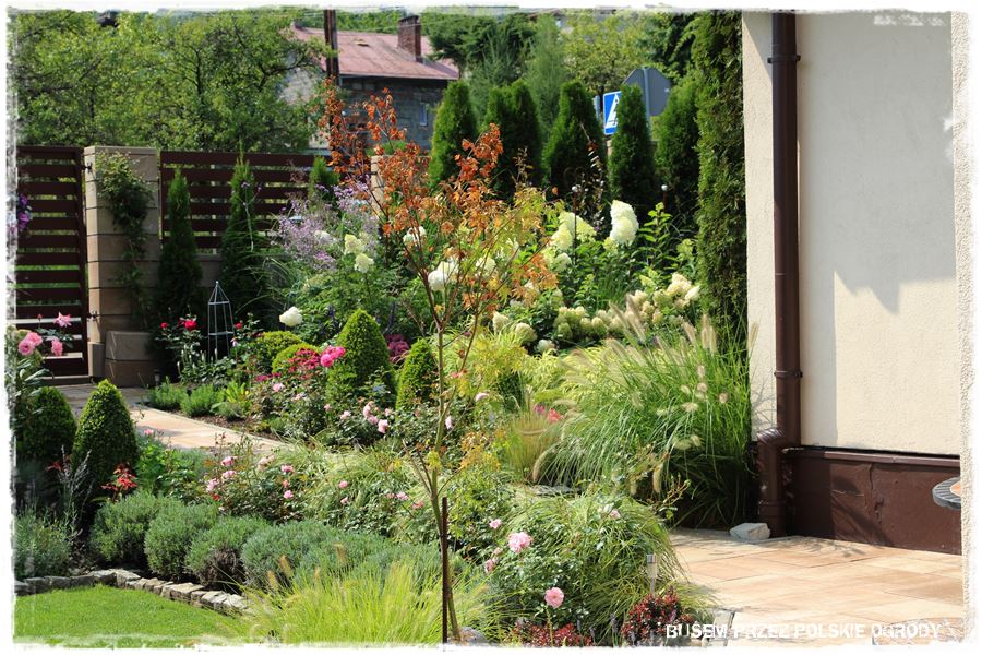 Pierwszym najbardziej widocznym elementem po wejściu do ogrodu, jest znajdujący się od frontu przedogródek. Pięknie skomponowany i zestopniowany.