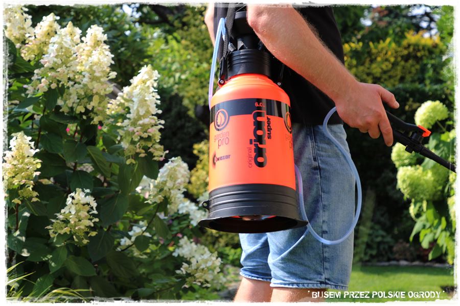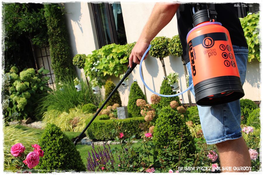 Po pracach związanych z sadzeniem, przyszedł czas na kilka innych spraw i prac gospodarczych. Na początek oprysk przeciw ‘ćmie’ ręcznym opryskiwaczem – małych, formowanych bukszpanów na centralnej rabacie.