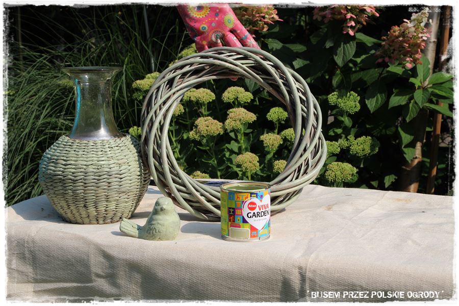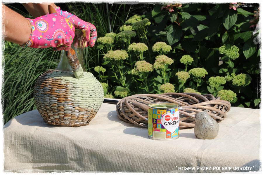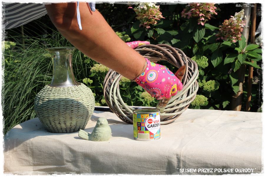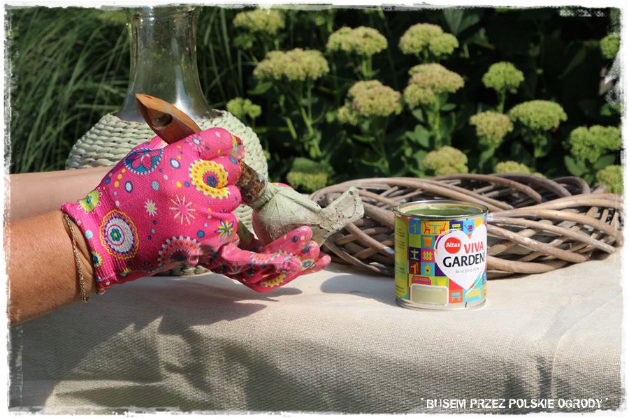 Podczas prac nie mogło zabraknąć także malowania. Wybraliśmy więc puszkę z farbą w kolorze groszkowym, który powędrował na kilka ogrodowych ozdób. A zatem zrobiliśmy kolejną praktyczną rzecz.