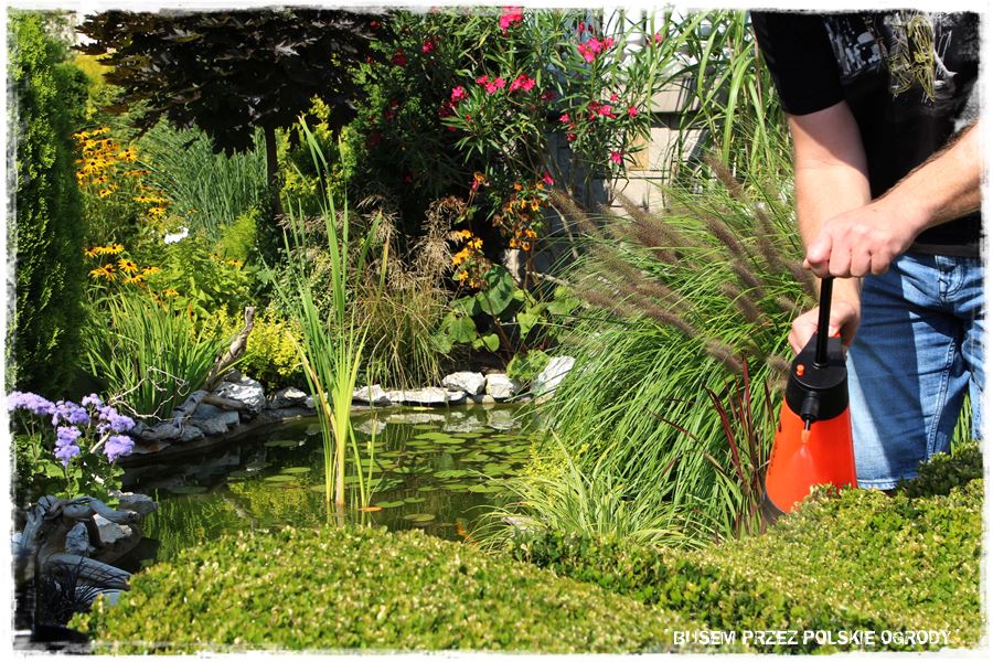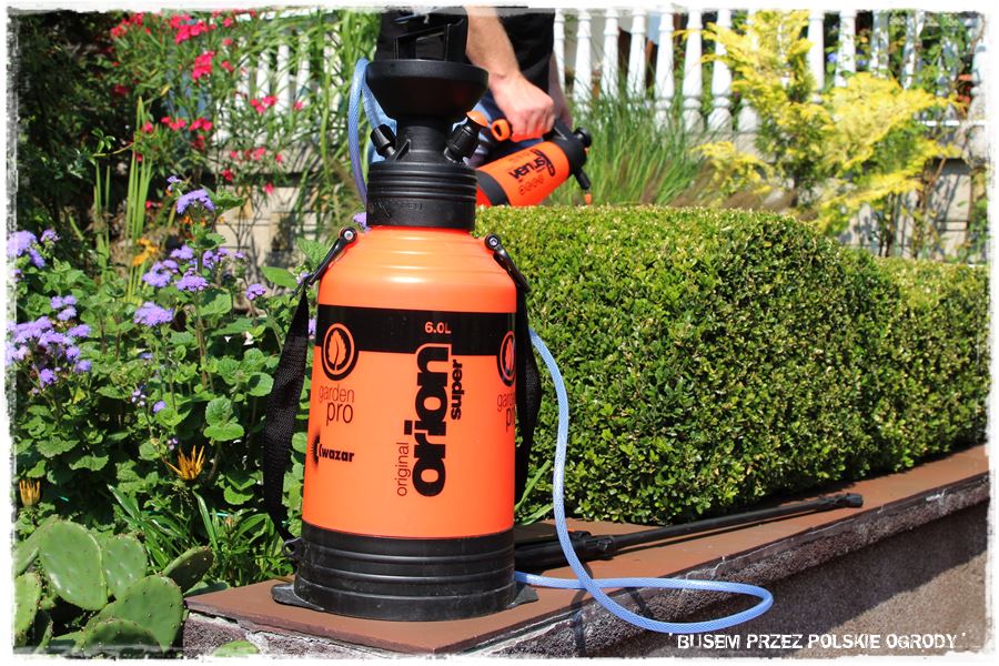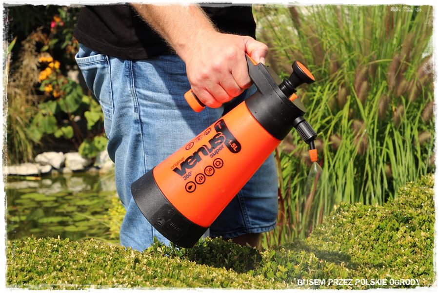 Po pracach związanych z sadzeniem, przyszedł czas na kilka innych spraw i prac gospodarczych. Na początek oprysk przeciw ‘ćmie’ ręcznym opryskiwaczem – małych, formowanych bukszpanów.