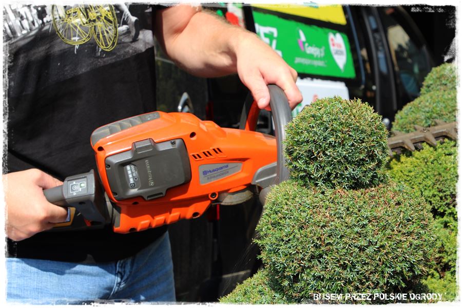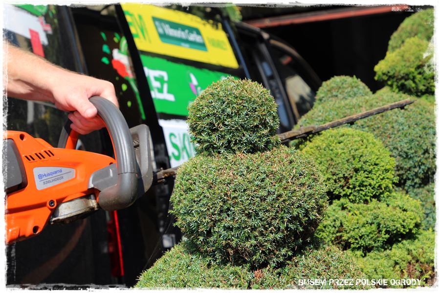 Później przycinka formowanych jałowców, w czym wspomogły mnie akumulatorowe nożyce.