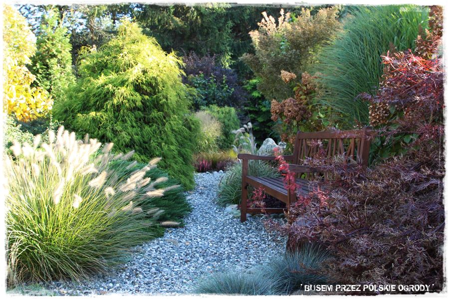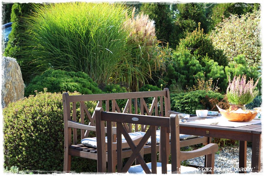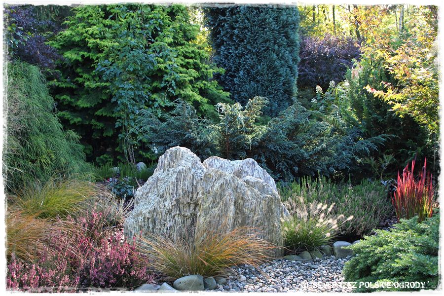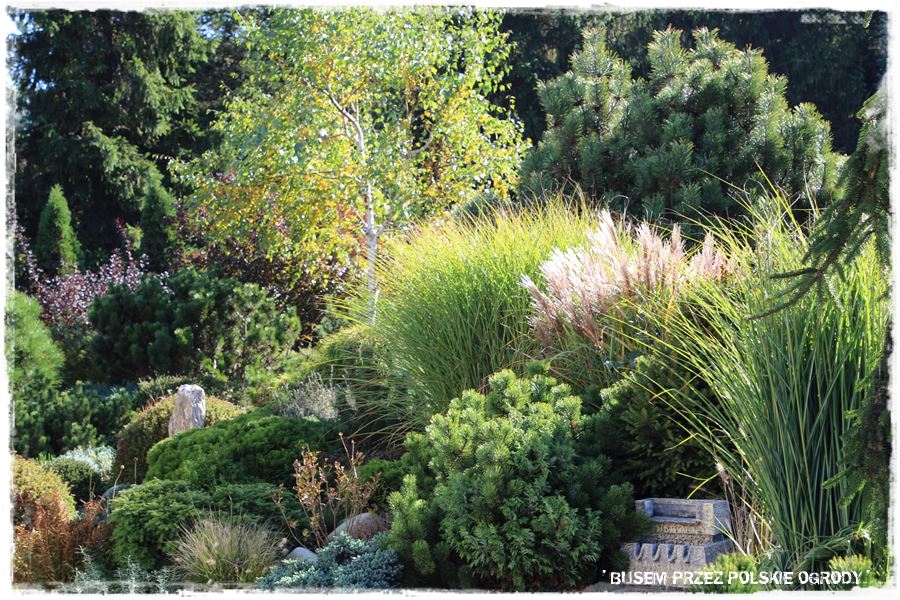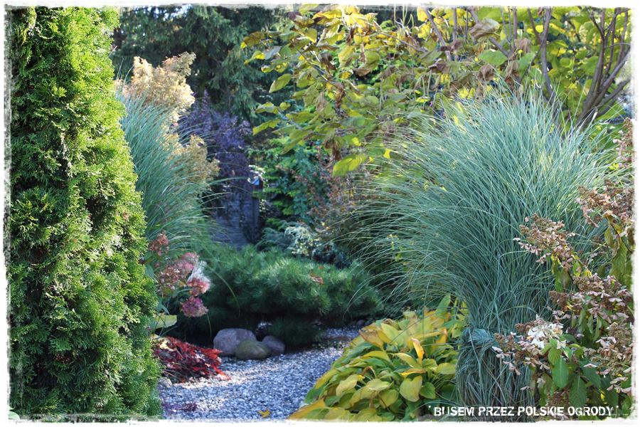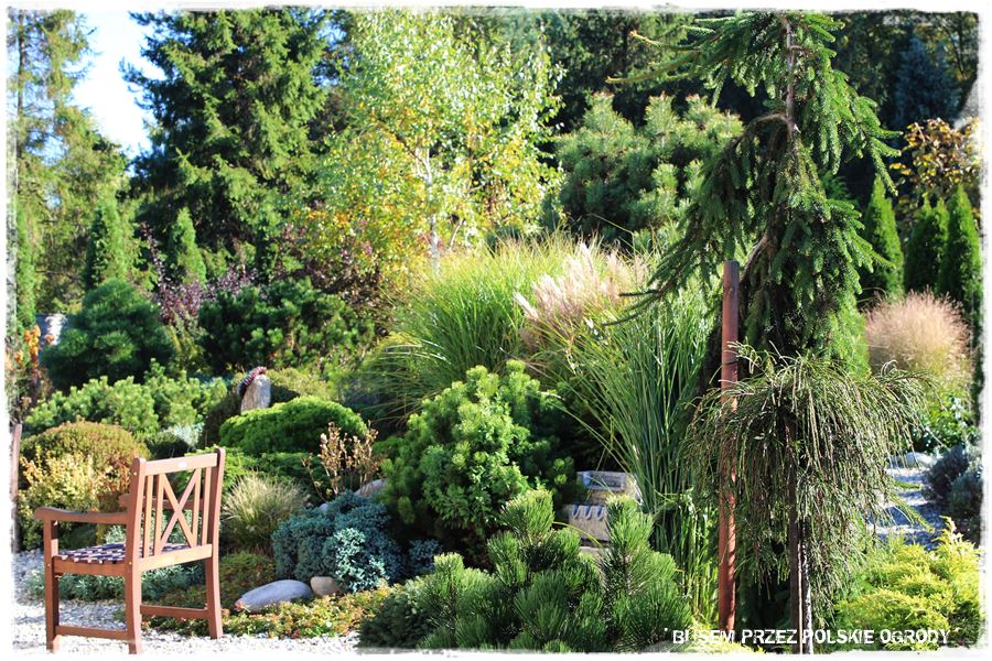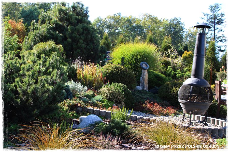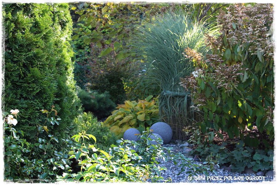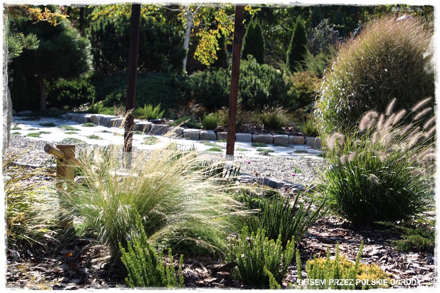 Jak wspomniałem wcześniej, ten ogród to oczywiście nie tylko iglaki. Jest sporo odmian roślin sprytnie w nie wkomponowanych, niemniej na szczególną uwagę zasługują dwie. Pierwsza z nich to trawy ozdobne, którym Właścicielka poświęca szczególną uwagę. Jak możesz zobaczyć w relacji z 2018 roku, trawy zdobią ogród również zimą, a ze względu na swoją różnorodność robią to na tyle efektownie, że są idealnym uzupełnieniem właśnie dla iglaków. Natomiast teraz, jesienią wprowadzają do ogrodu wyjątkową lekkość i mnóstwo uroku.
