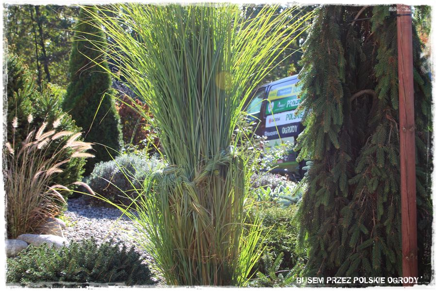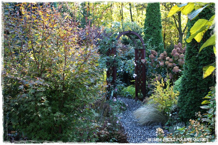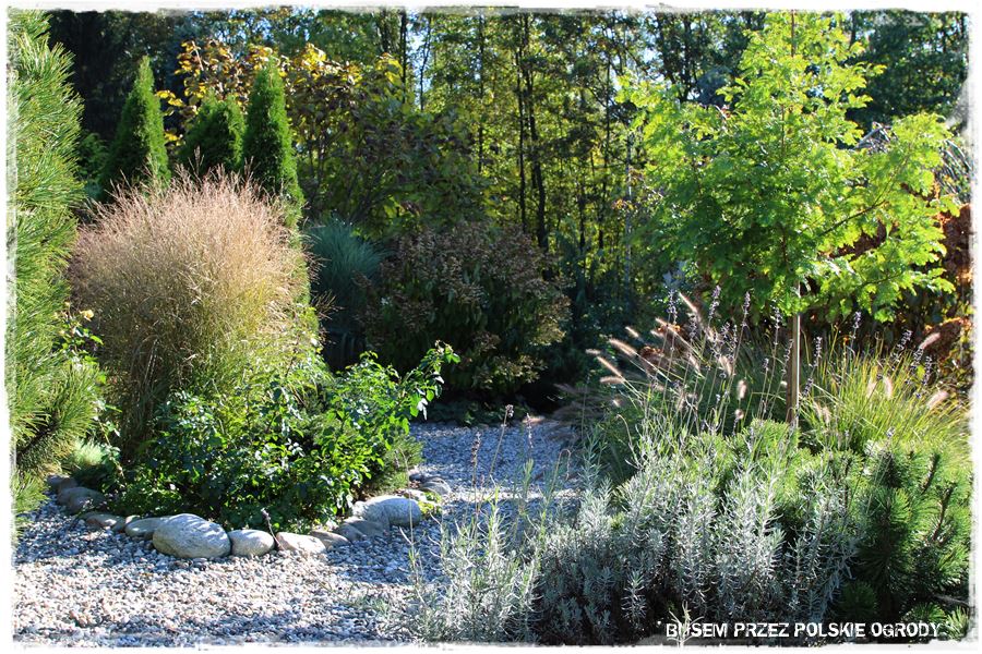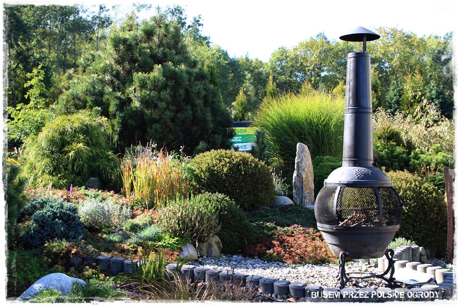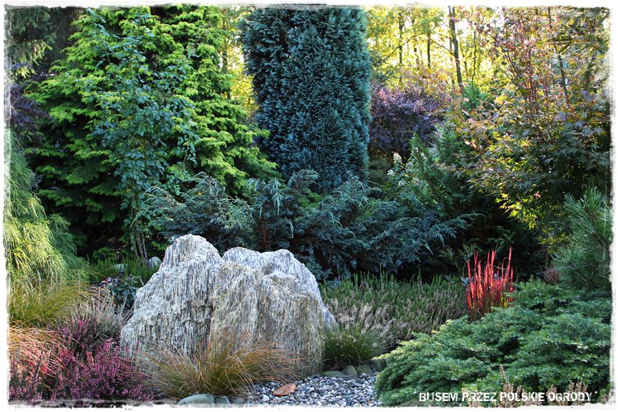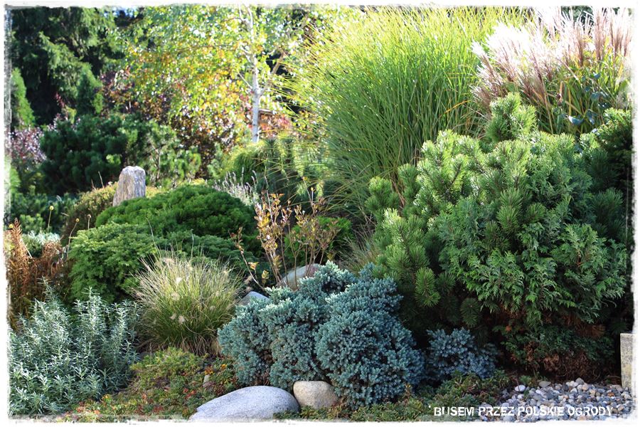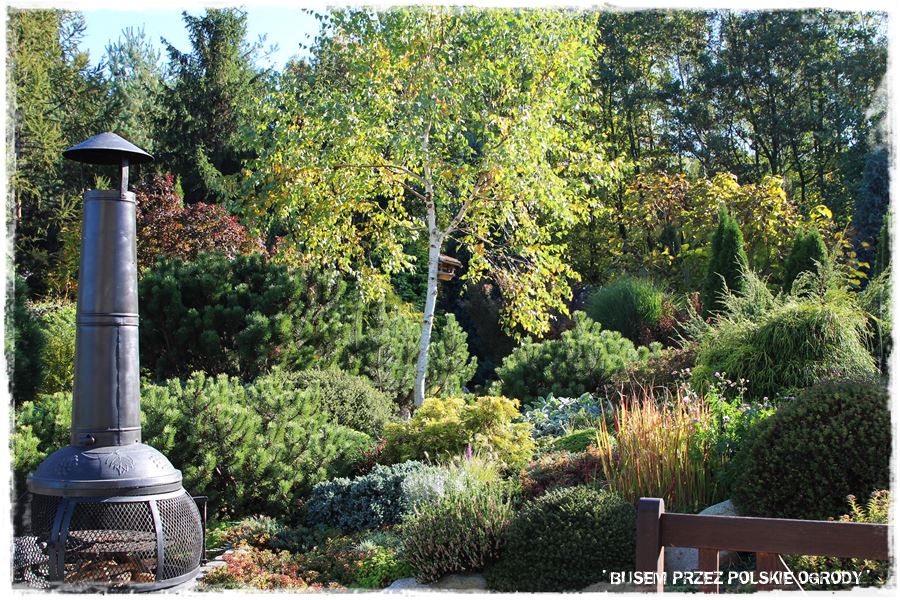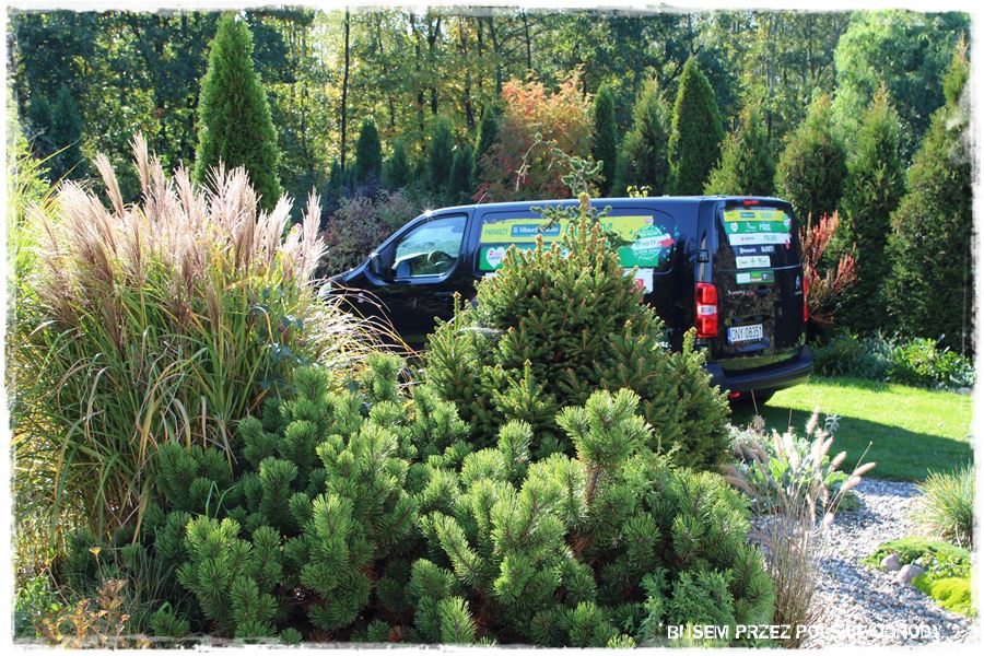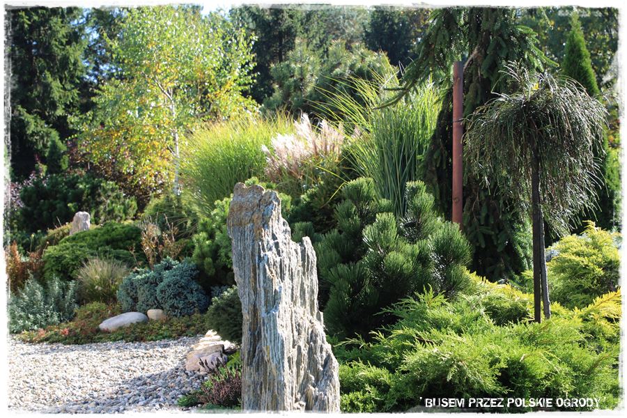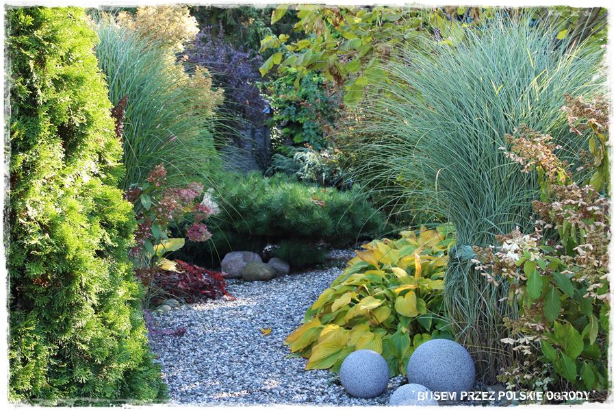 Jak wspomniałem wcześniej, ten ogród to oczywiście nie tylko iglaki. Jest sporo odmian roślin sprytnie w nie wkomponowanych, niemniej na szczególną uwagę zasługują dwie. Pierwsza z nich to trawy ozdobne, którym Właścicielka poświęca szczególną uwagę. Jak możesz zobaczyć w relacji z 2018 roku, trawy zdobią ogród również zimą, a ze względu na swoją różnorodność robią to na tyle efektownie, że są idealnym uzupełnieniem właśnie dla iglaków. Natomiast teraz, jesienią wprowadzają do ogrodu wyjątkową lekkość i mnóstwo uroku.