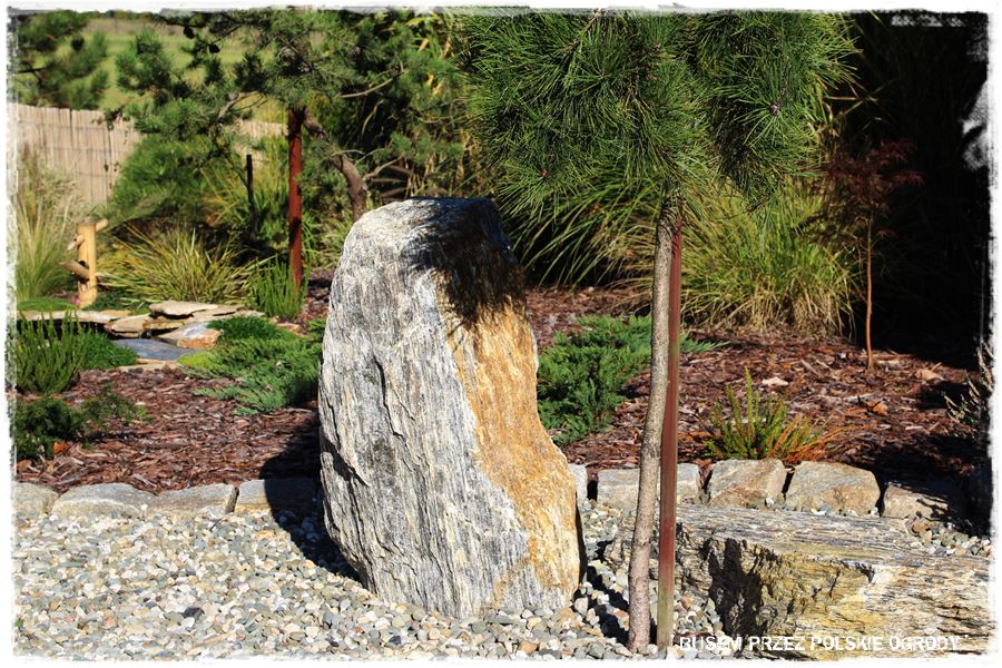 Bardzo ważnym elementem ozdobnym ogrodu są również kamienie. Rożnego rodzaju mniejsze i większe głazy gnejsowe porozkładane pomiędzy roślinami,