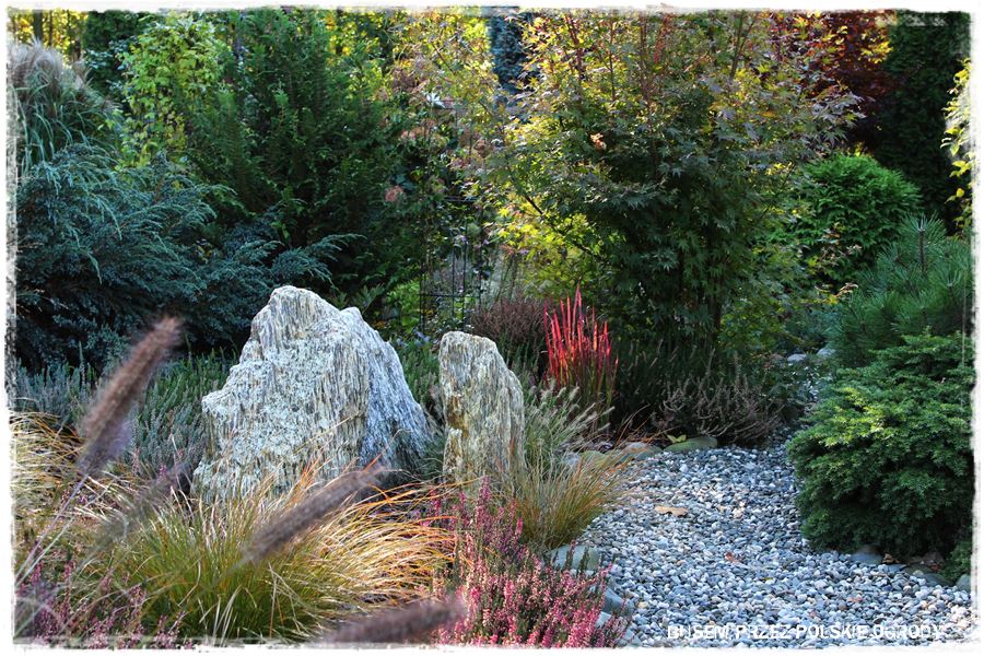 ale przede wszystkim duże kamienne powierzchnie, wijące się pomiędzy rabatami. Tworzą żwirowe ścieżki, które dodatkowo ładnie kontrastują i wyglądają na tle roślin.