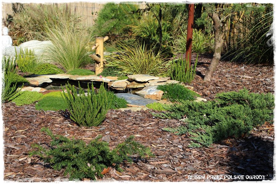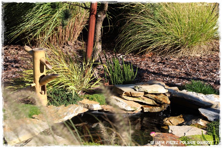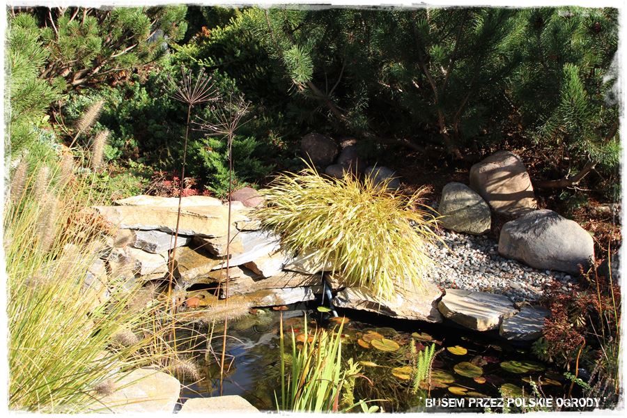 Dobrze i ładnie wkomponowane są również oczka wodne, oryginalnie wykończone płytkami kamiennymi.
