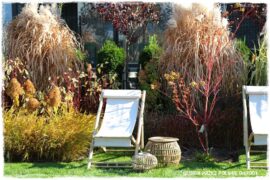 Jak wspomniałem wcześniej, ten ogród to oczywiście nie tylko iglaki. Jest sporo odmian roślin sprytnie w nie wkomponowanych, niemniej na szczególną uwagę zasługują dwie. Pierwsza z nich to trawy ozdobne, którym Właścicielka poświęca szczególną uwagę. Jak możesz zobaczyć w relacji z 2018 roku, trawy zdobią ogród również zimą, a ze względu na swoją różnorodność robią to na tyle efektownie, że są idealnym uzupełnieniem właśnie dla iglaków. Natomiast teraz, jesienią wprowadzają do ogrodu wyjątkową lekkość i mnóstwo uroku.