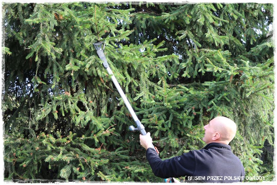 Po pracach związanych z sadzeniem, przyszedł czas na kilka innych spraw i prac gospodarczych. Na początek z pomocą Przyjaciela Katarzyny – Piotra ścięliśmy kilka świerkowych gałązek, które Katarzyna wykorzystała do stroików, na zbliżające się pierwszolistopadowe Święto.