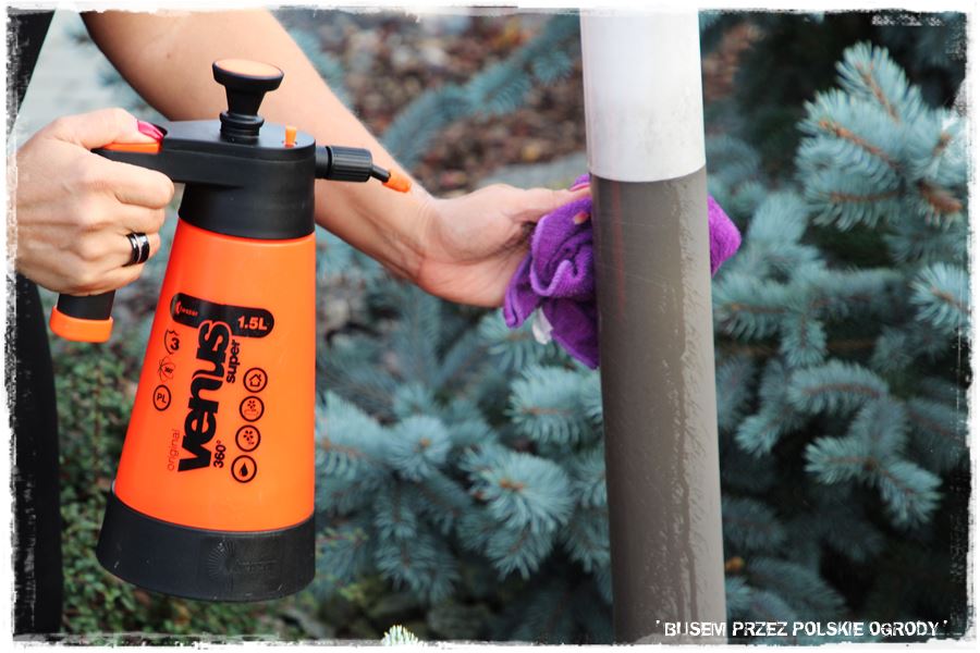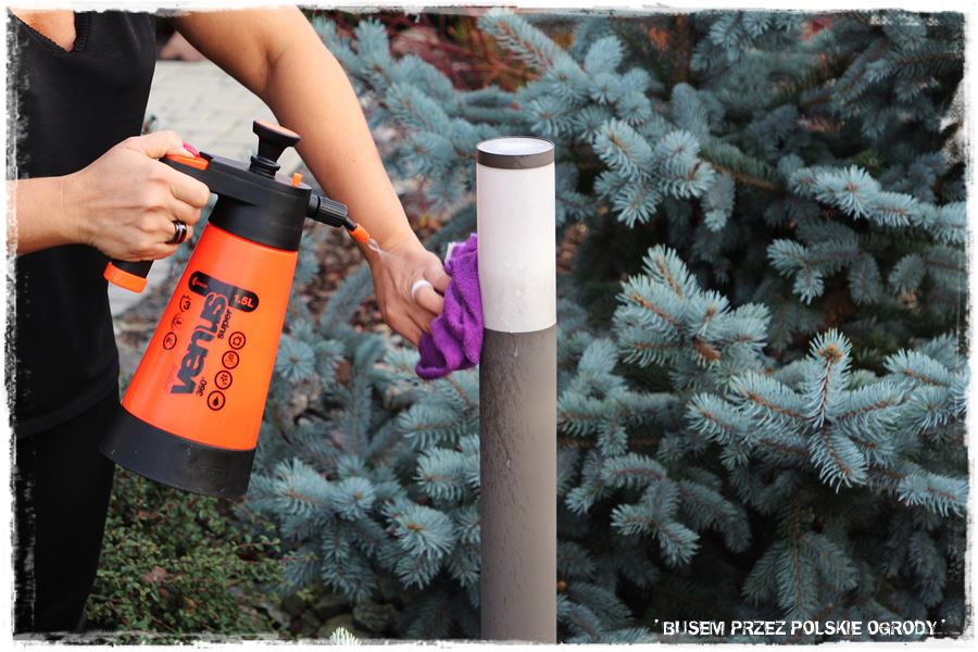 Później z pomocą opryskiwacza ręcznego wymyliśmy ogrodowe lampy,