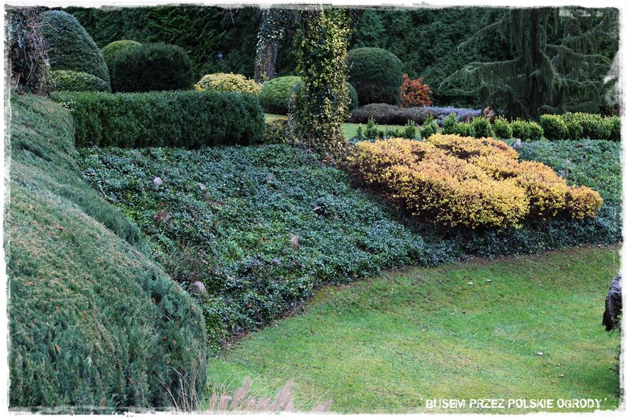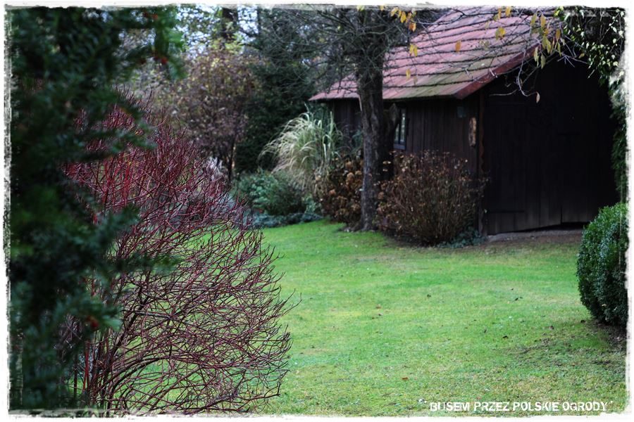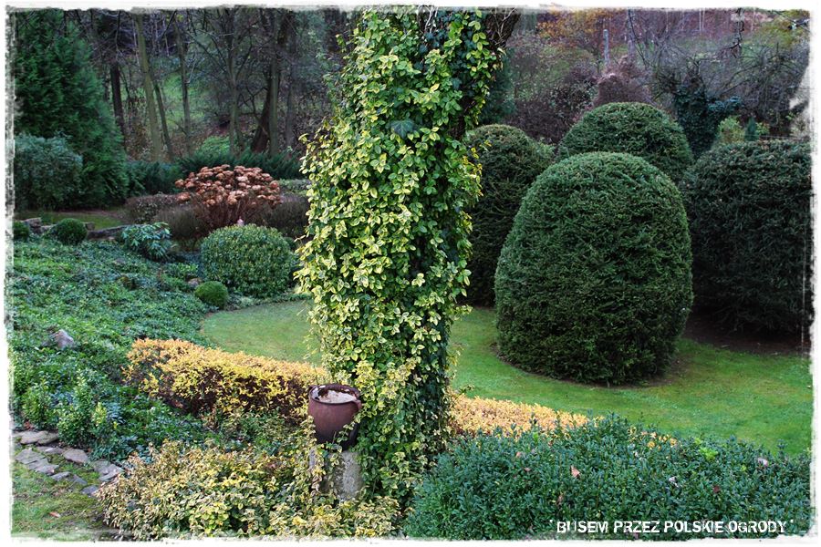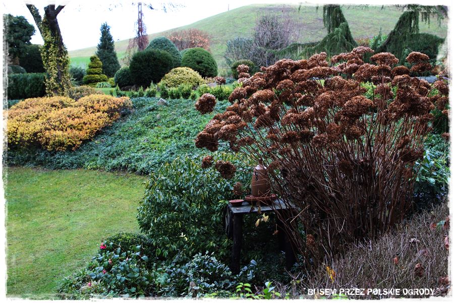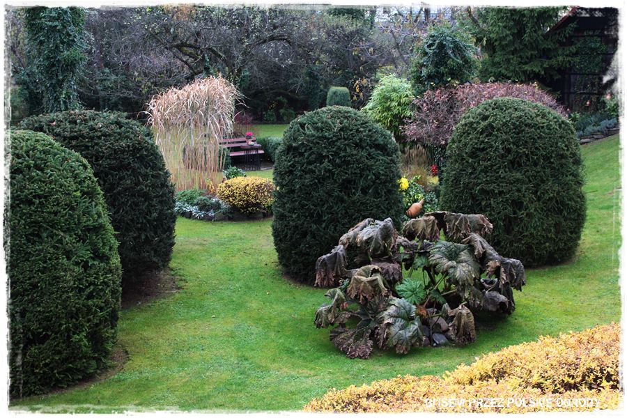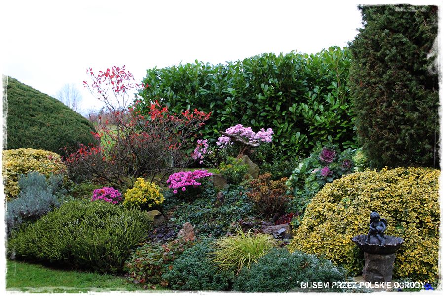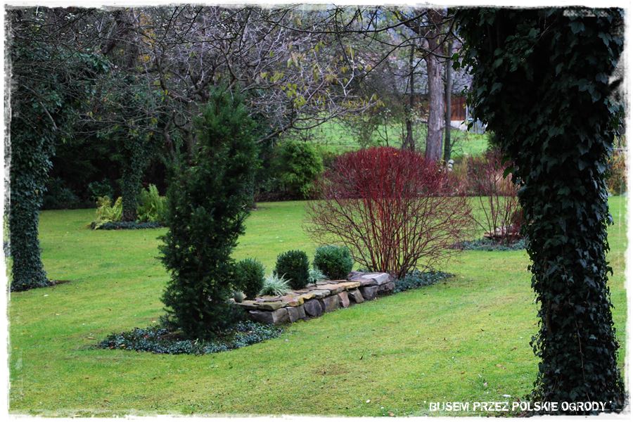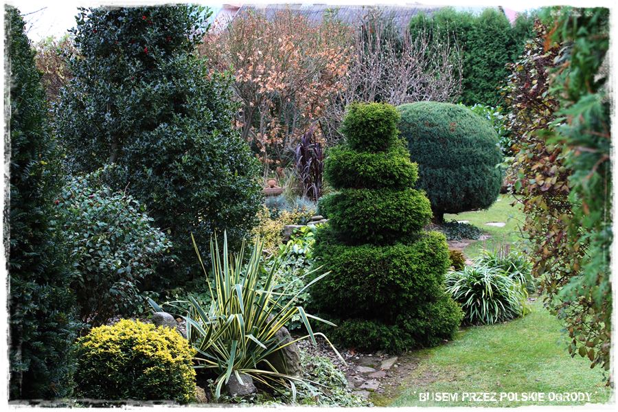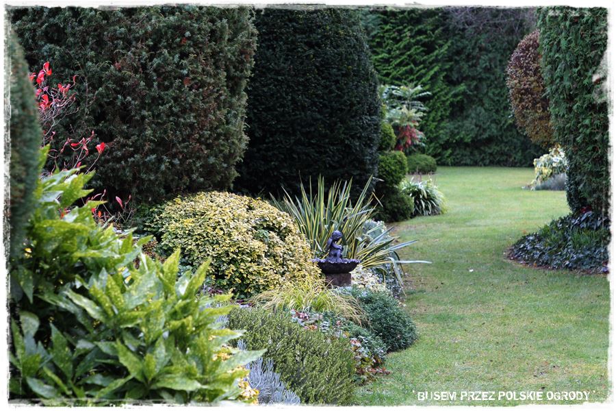Jak już zauważyłeś pewnie na powyższych zdjęciach, ten ogród jest wyjątkowo oszczędny w kolory. Przynajmniej o tej porze roku, gdzie jego zaletą jest „zimozieloność”. Ale to nie znaczy, że kolory gdzieś się tam nie przebijają. Bo są, owszem, dyskretnie i subtelnie wkomponowane.