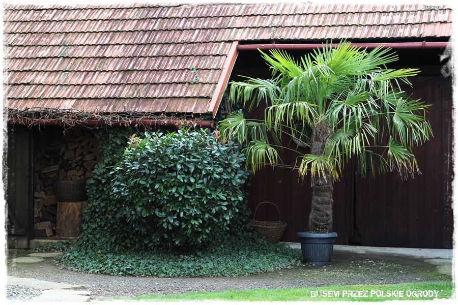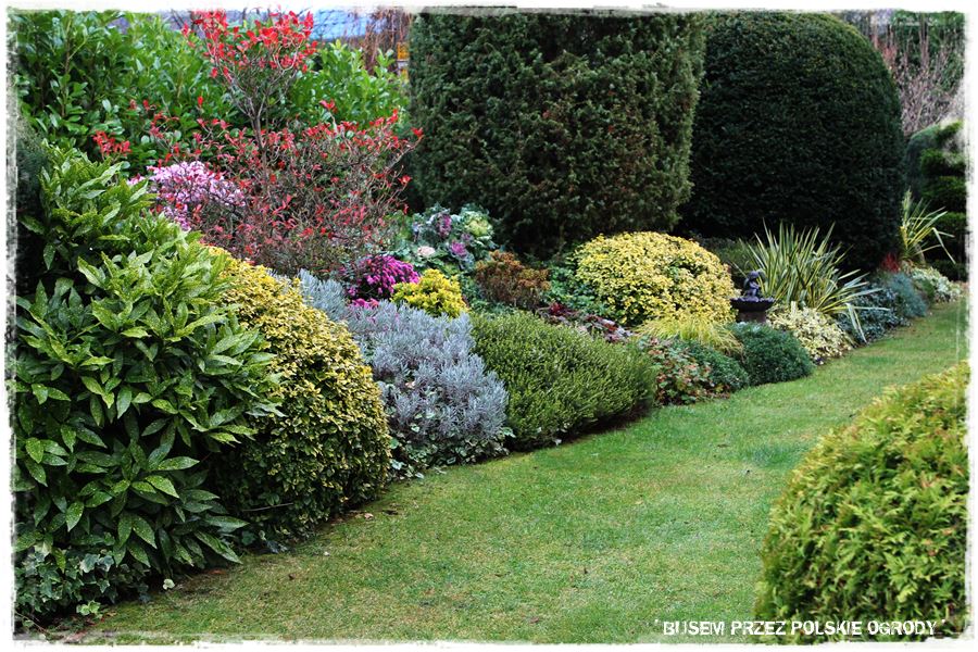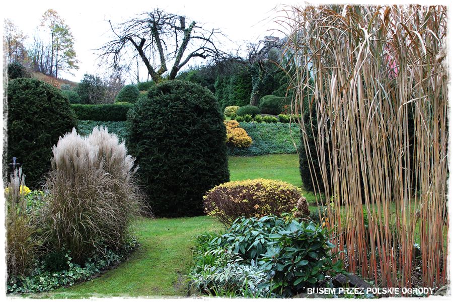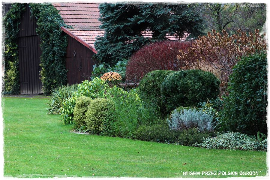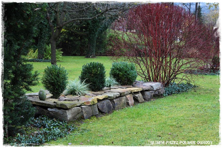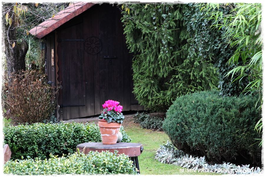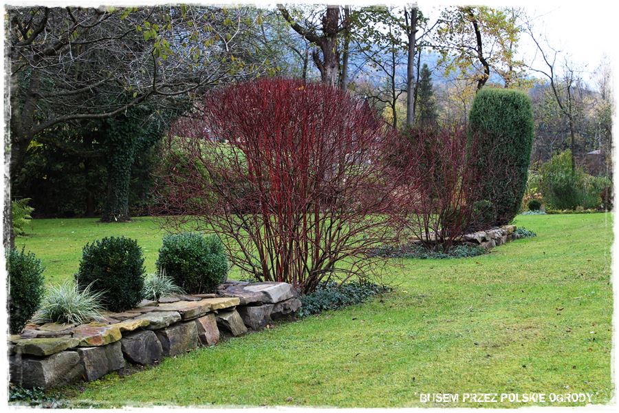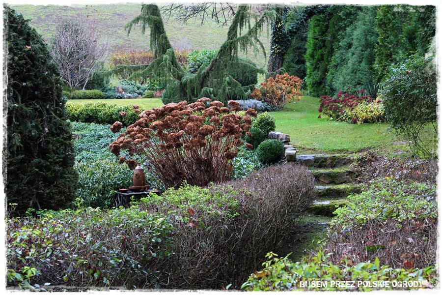 Jak już zauważyłeś pewnie na powyższych zdjęciach, ten ogród jest wyjątkowo oszczędny w kolory. Przynajmniej o tej porze roku, gdzie jego zaletą jest „zimozieloność”. Ale to nie znaczy, że kolory gdzieś się tam nie przebijają. Bo są, owszem, dyskretnie i subtelnie wkomponowane.