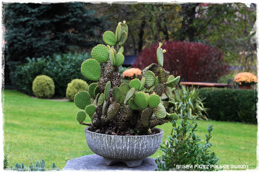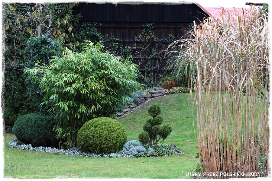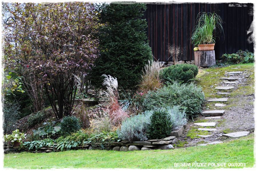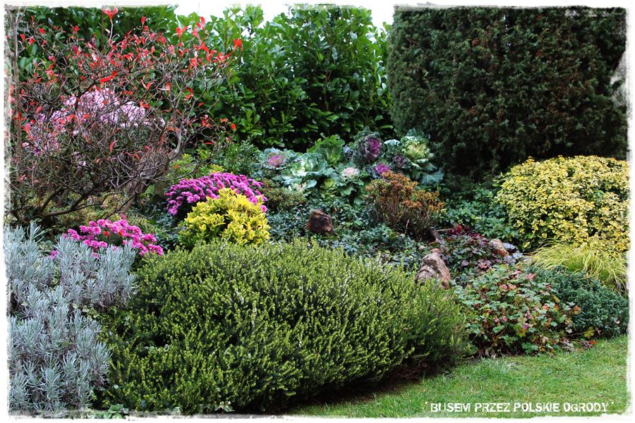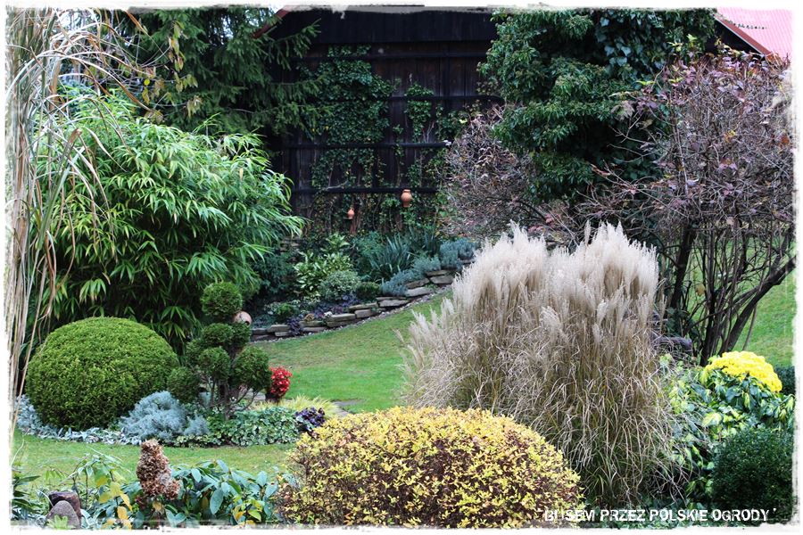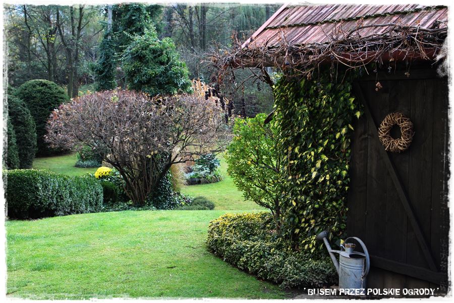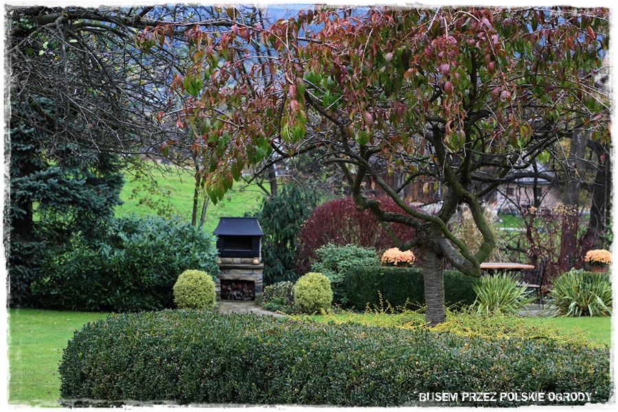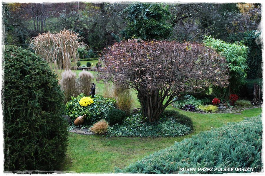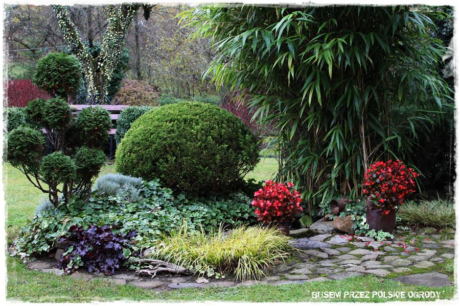 Jak już zauważyłeś pewnie na powyższych zdjęciach, ten ogród jest wyjątkowo oszczędny w kolory. Przynajmniej o tej porze roku, gdzie jego zaletą jest „zimozieloność”. Ale to nie znaczy, że kolory gdzieś się tam nie przebijają. Bo są, owszem, dyskretnie i subtelnie wkomponowane.