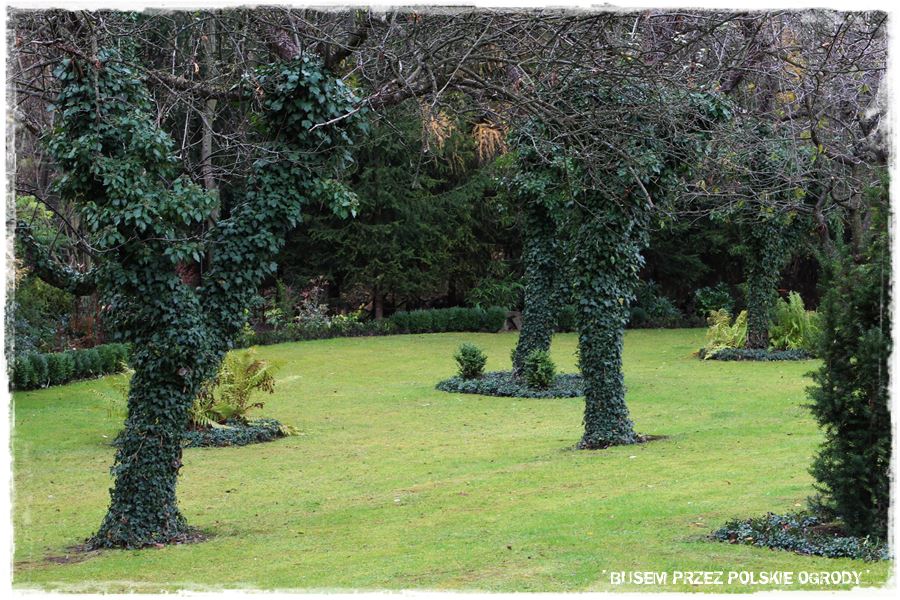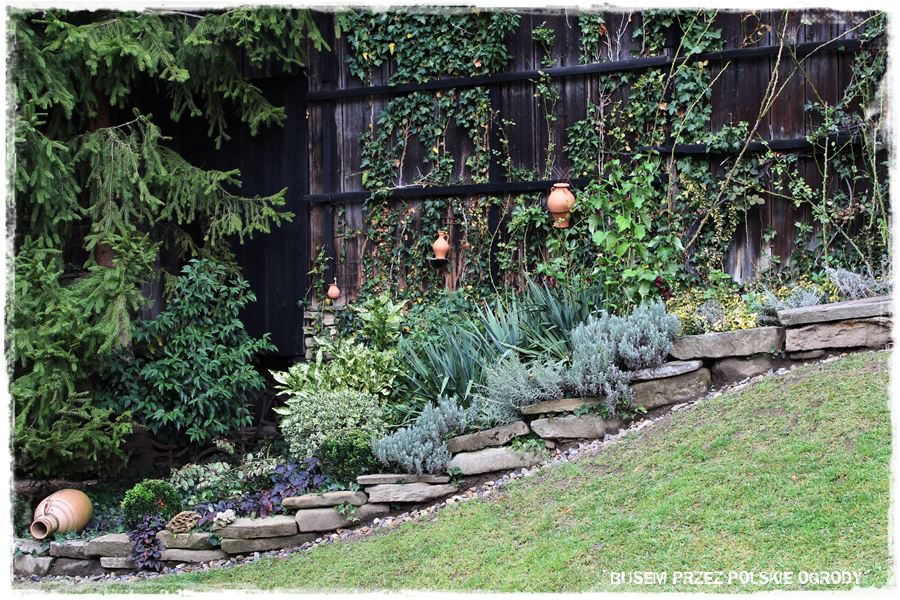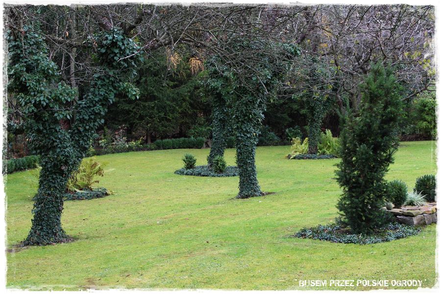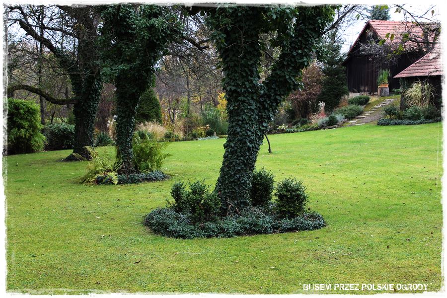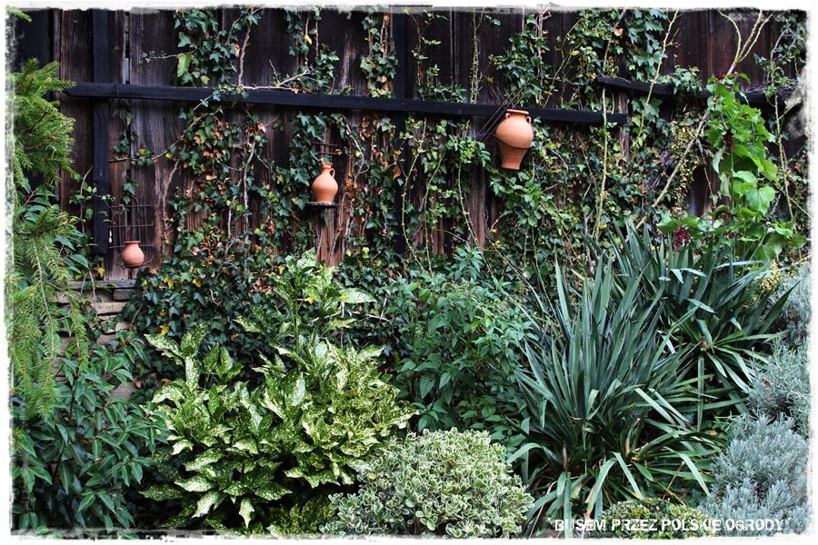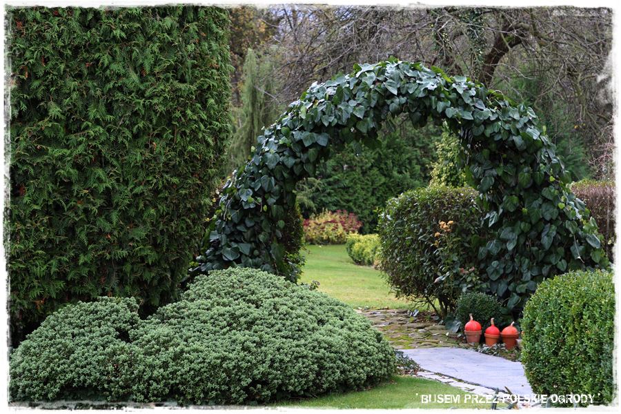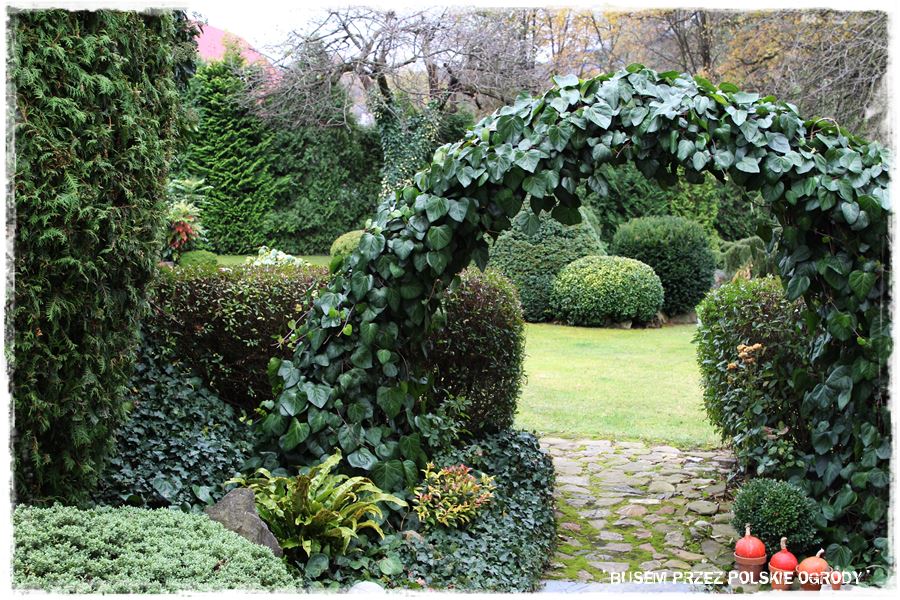 Odchodząc powoli od elementów zagospodarowania w stronę roślinnych, które są najmocniejszą stroną tego ogrodu, zacznę od bluszczów, ciekawie porastających różne elementy.